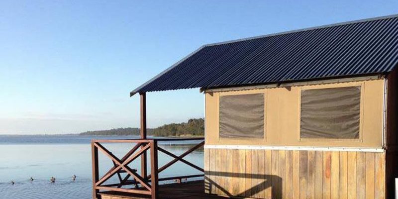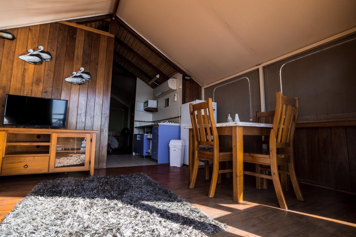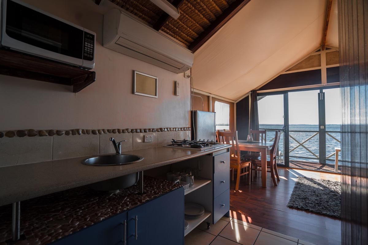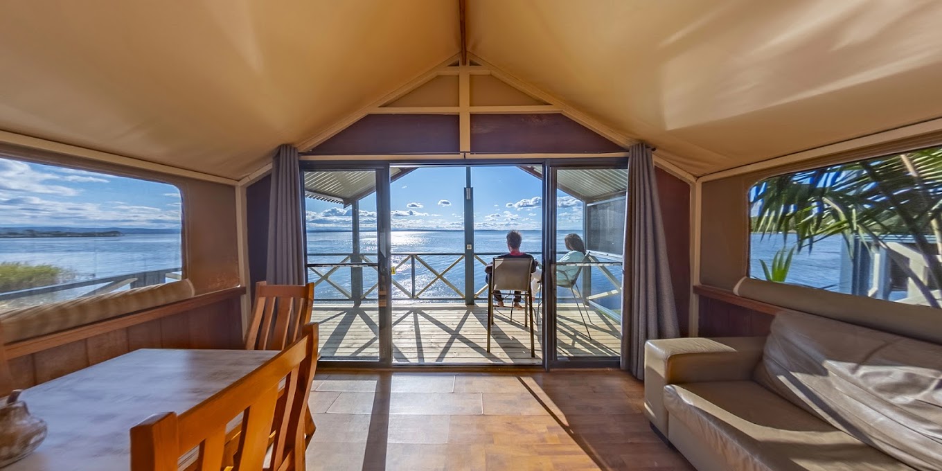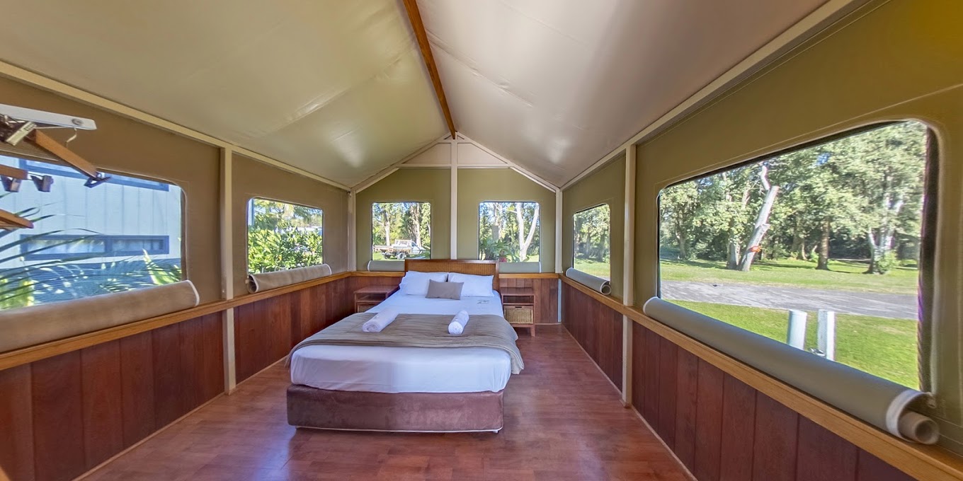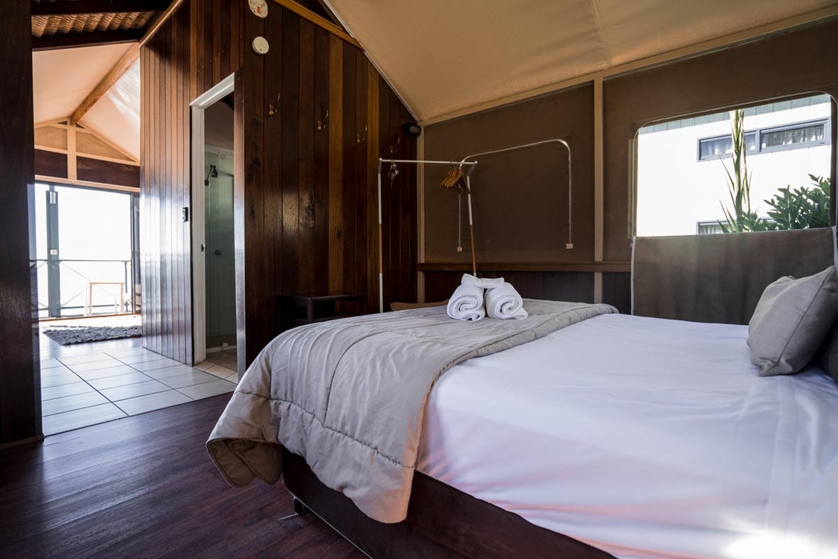 Safari style timber/canvas cabin with queen sized bed and a single bed in one room, fully self-contained with ensuite, open plan kitchen, lounge/double sofa bed, veranda overlooking the water, TV, microwave, full size fridge, air-conditioner. All linen supplied.