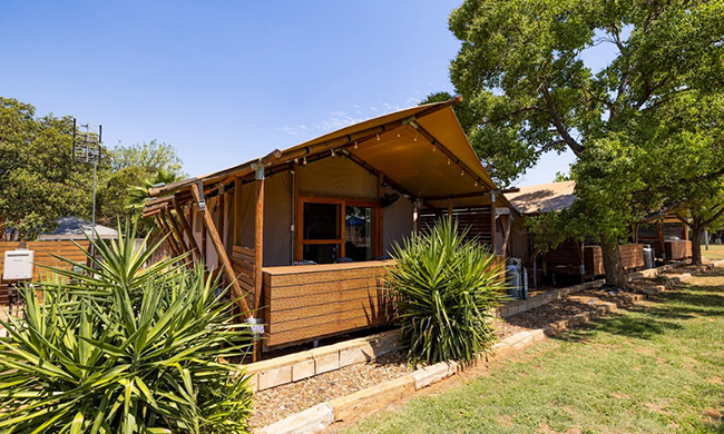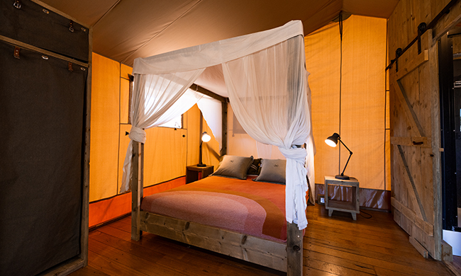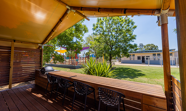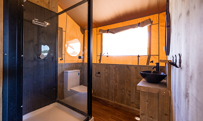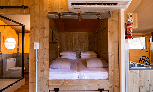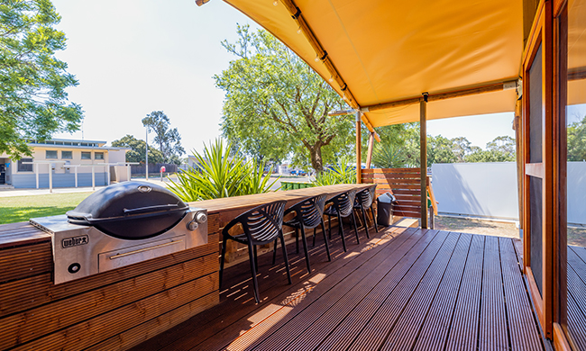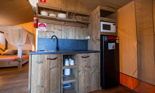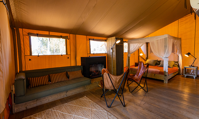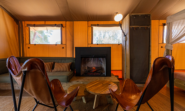 Luxury camping close to facilities. Safari tent with one queen and two single beds in a nook located close together. Features kitchenette including microwave, bar fridge; dining area; bathroom; sofa and seating area with TV; air-conditioning; fireplace; balcony with barbecue, outdoor furniture and dining area.
