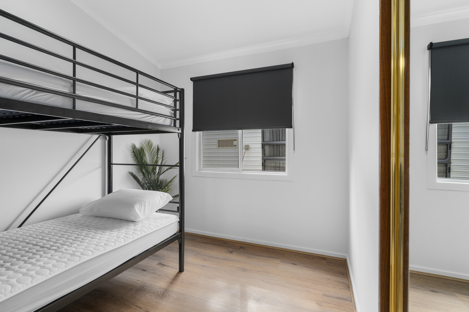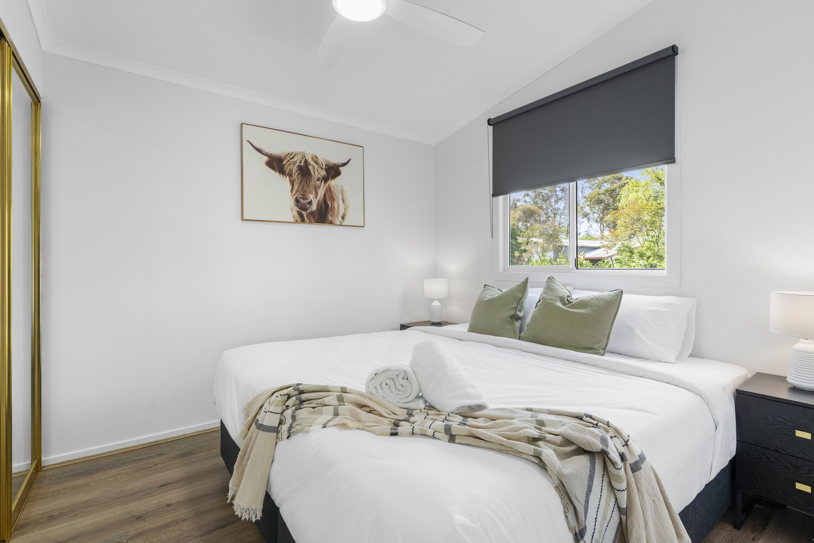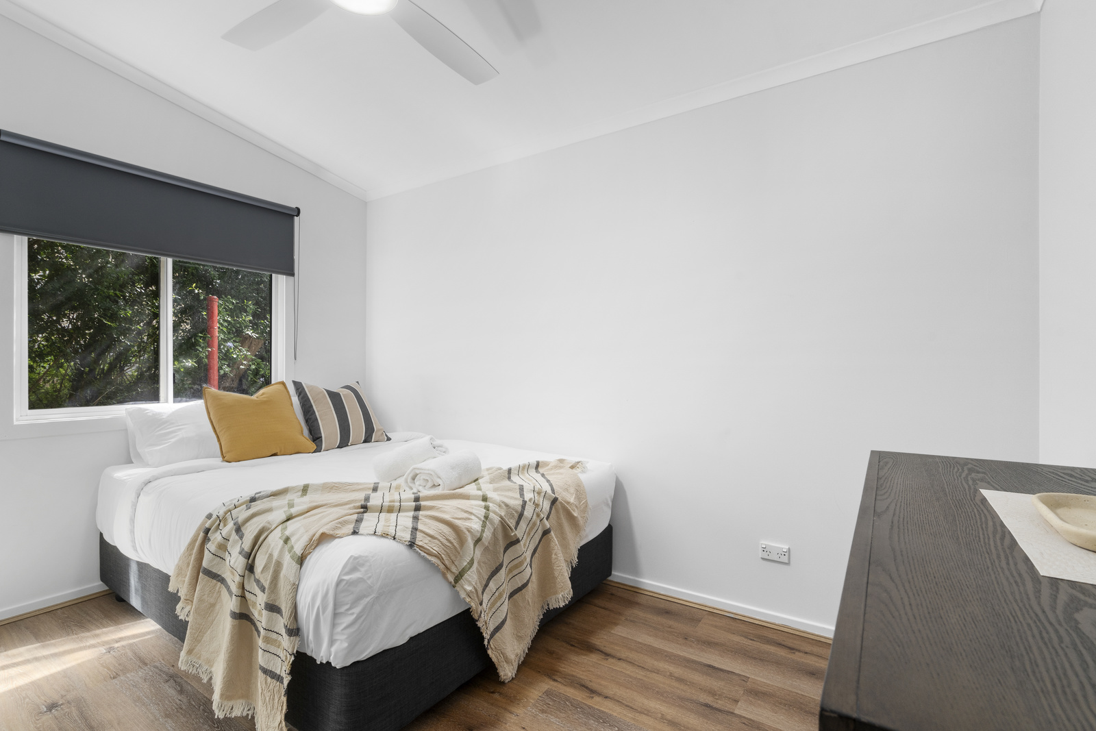 Our 3 Bedroom Villa sleeps up to six guests, with a king bed in the main bedroom, one bunk bed in the second bedroom and a queen bed in the third bedroom, as well as a bathroom, living area, kitchen and private deck.