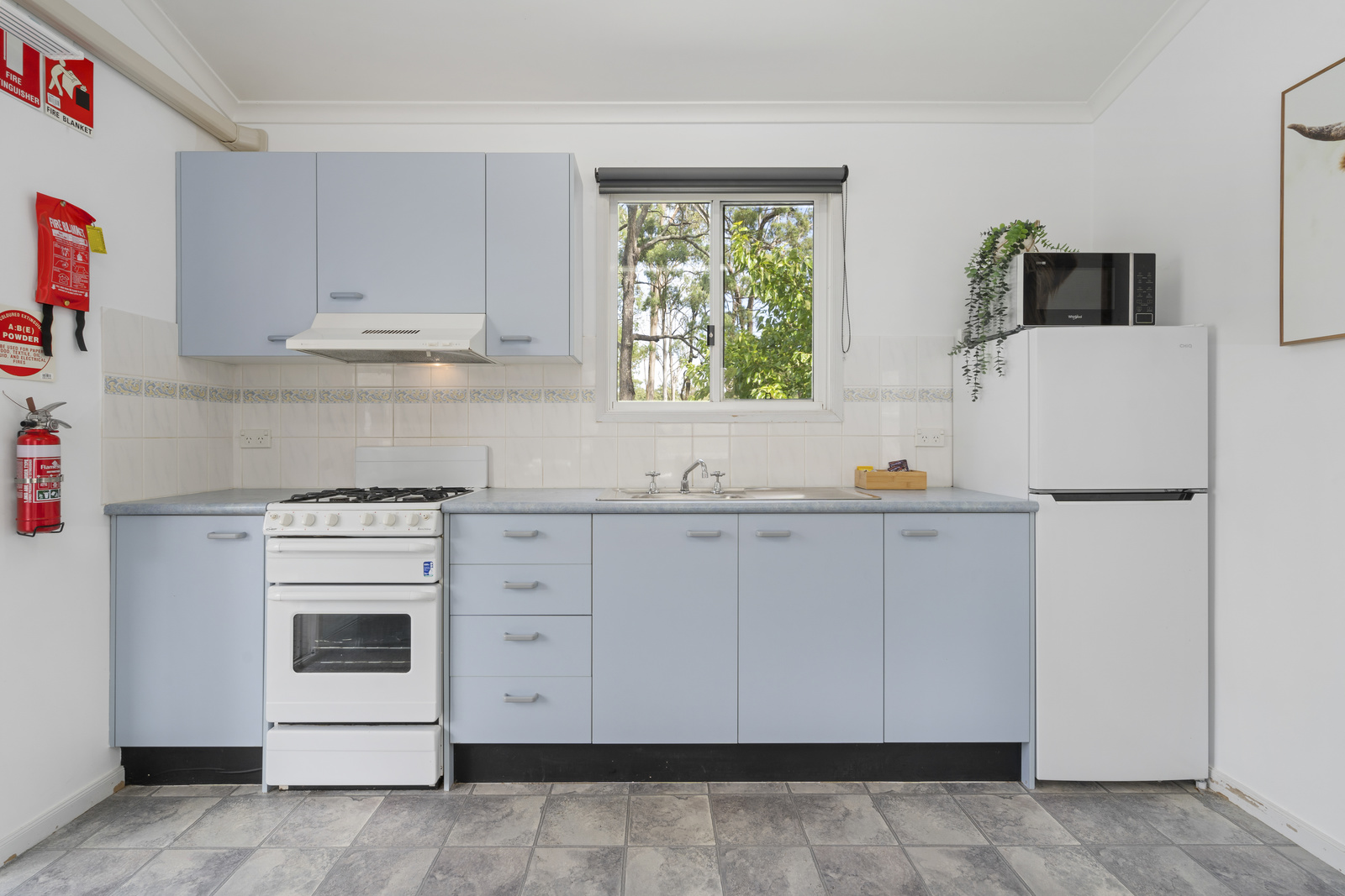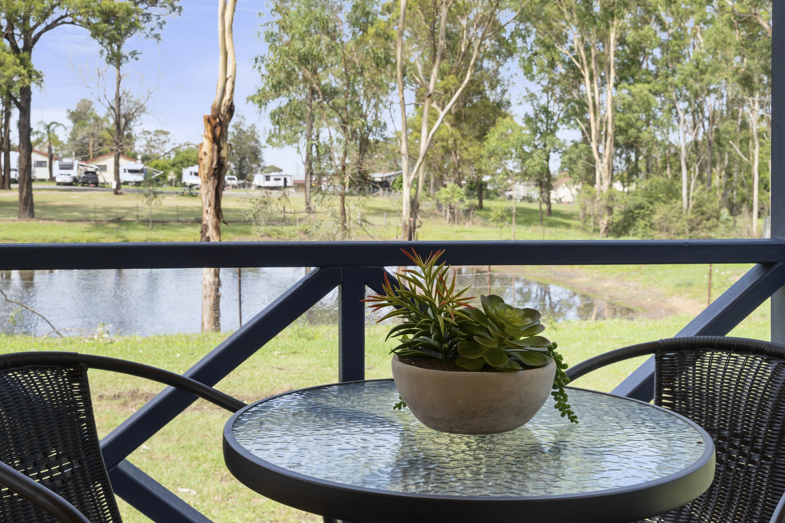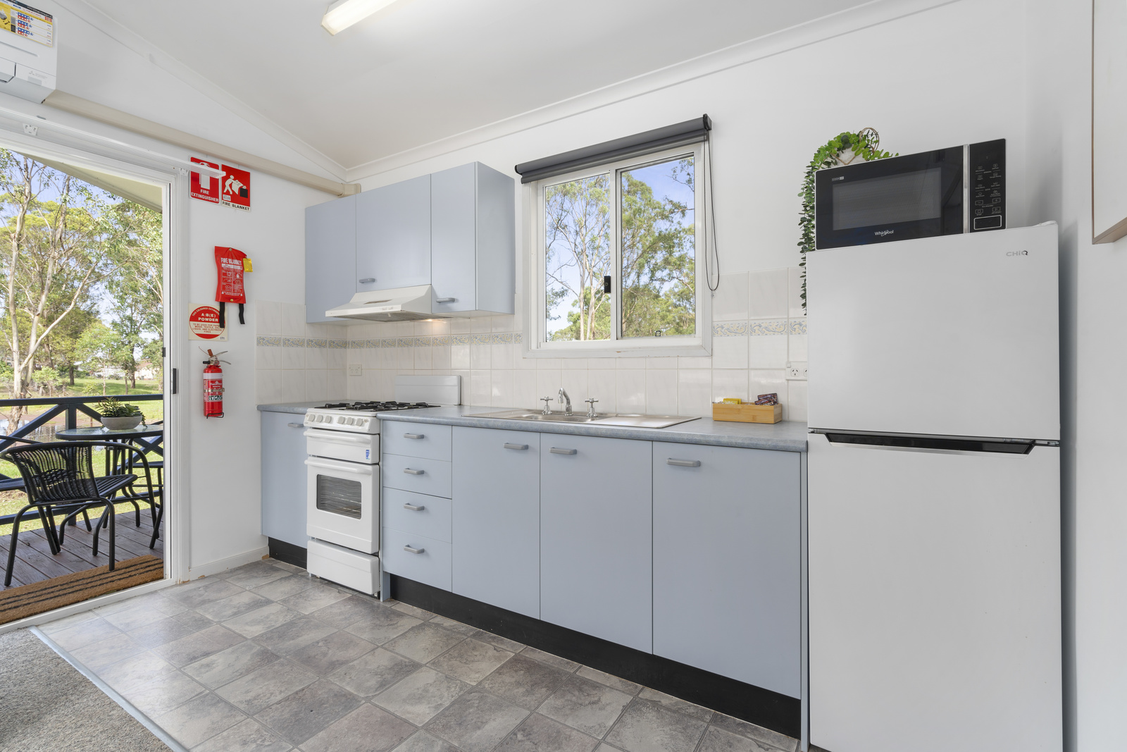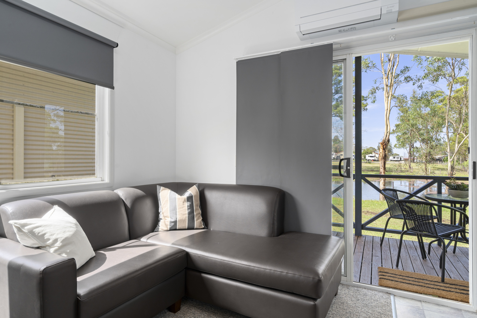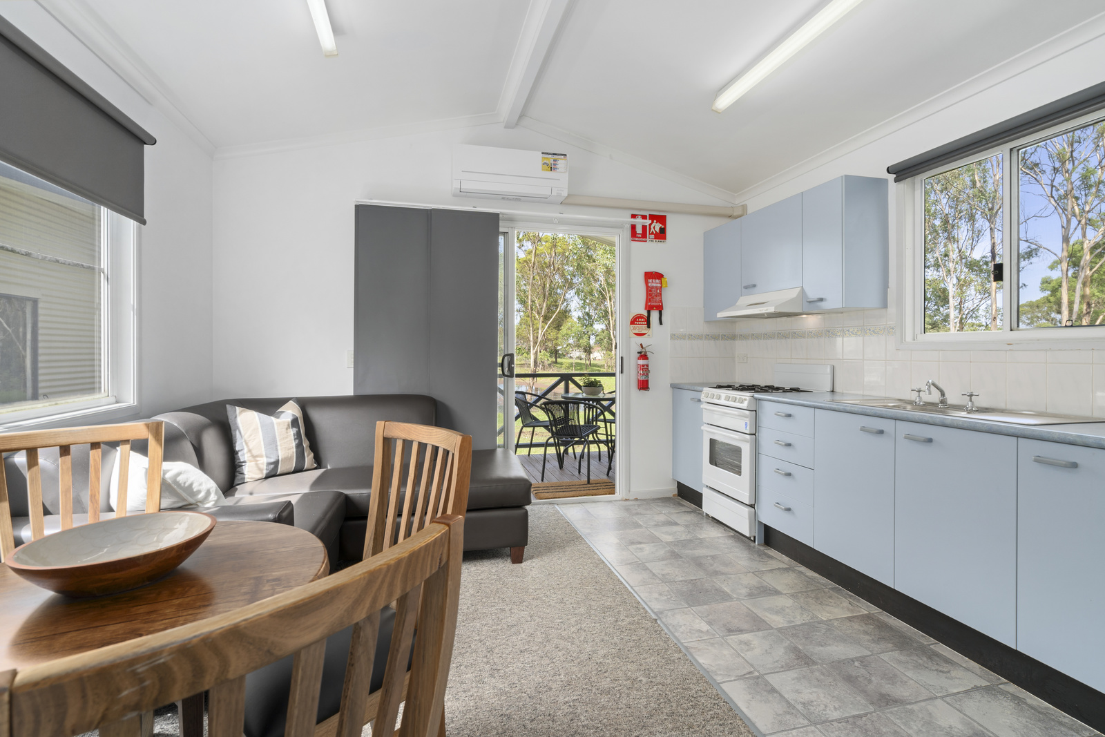 Enjoy cabin accommodation on a budget in the quiet far end of the park with a lake view.