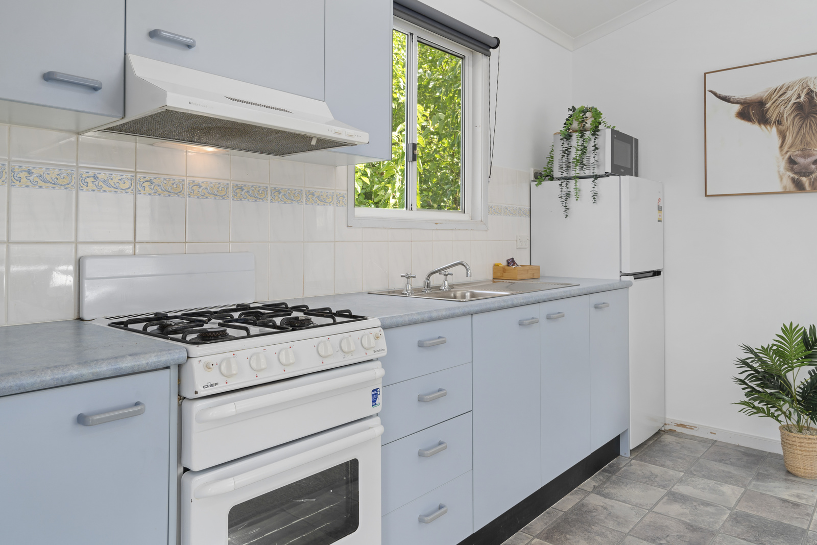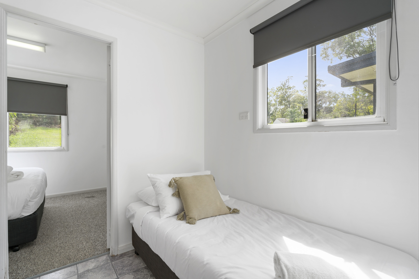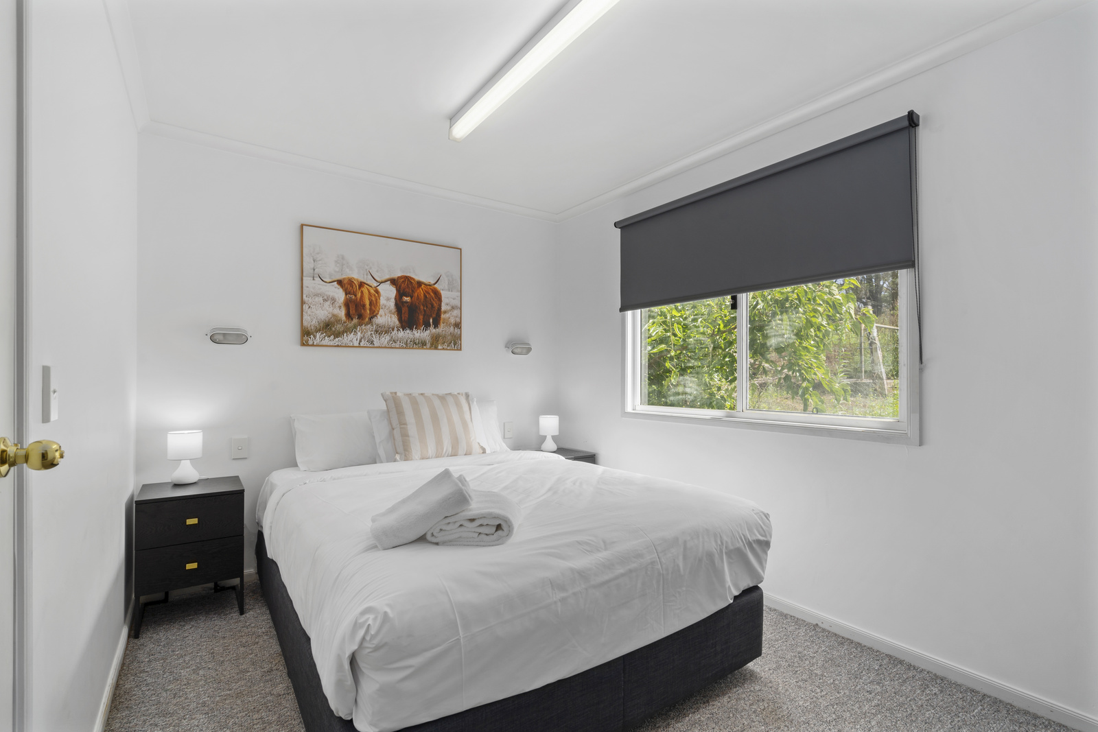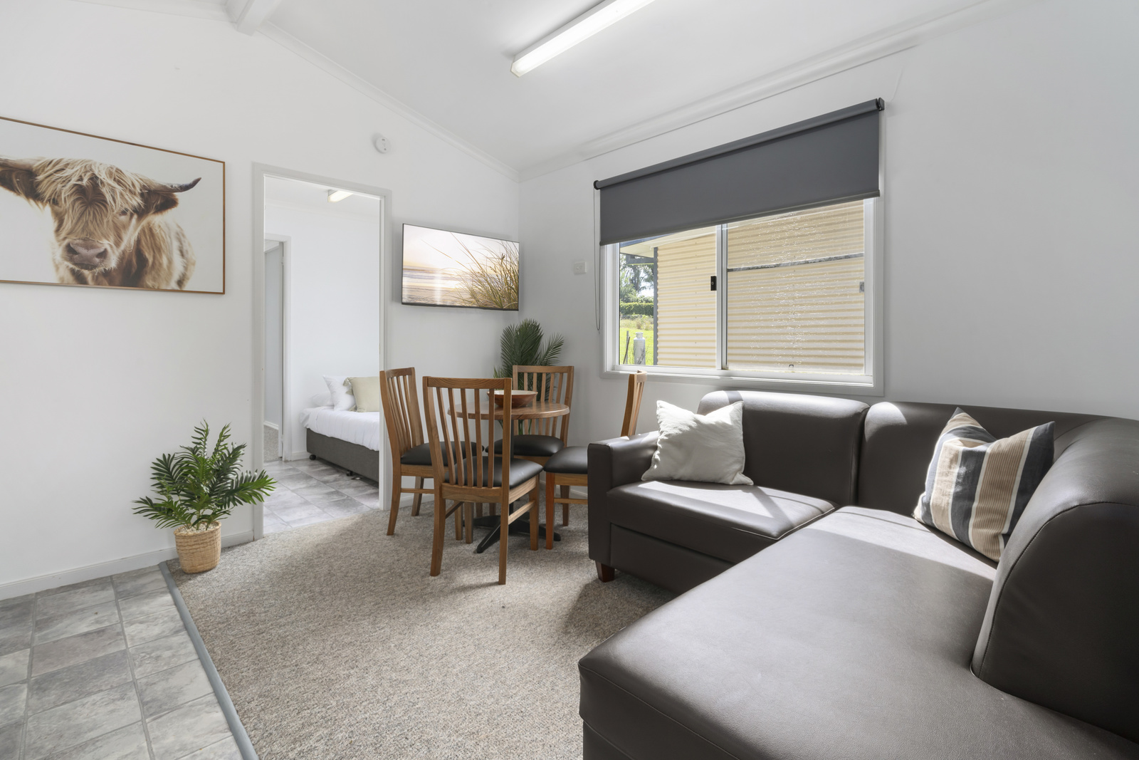 Our Budget Cabins sleeps up to three guests, with a queen bed in the main bedroom, and a single bed in an alcove area just outside the main bedroom. This cabin has a bathroom, living area, kitchen and private deck.
