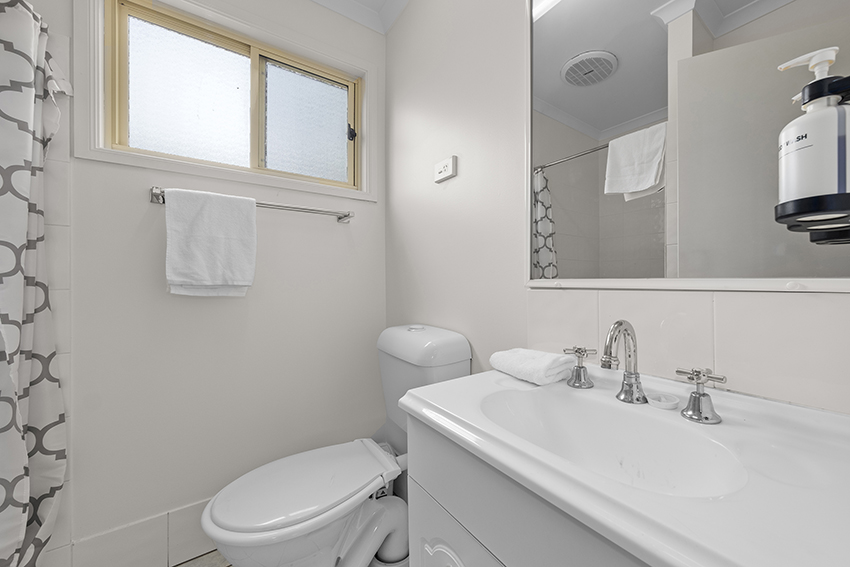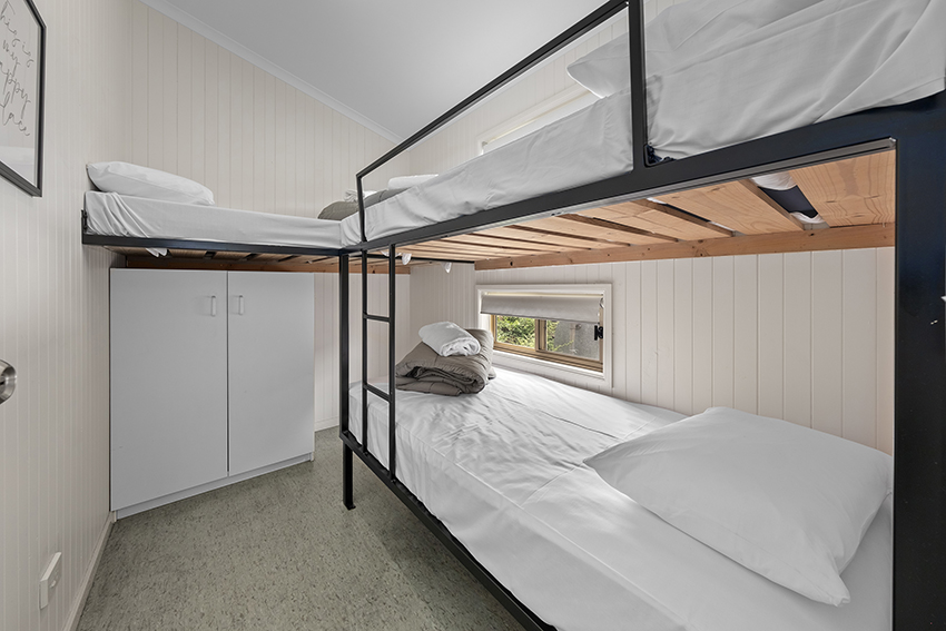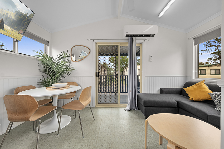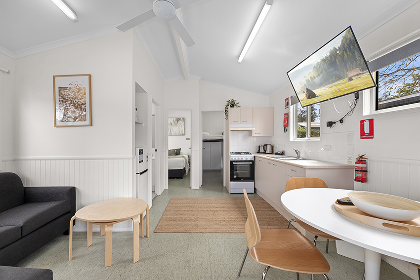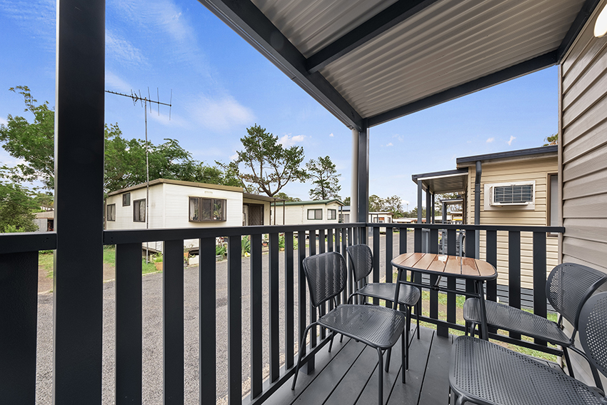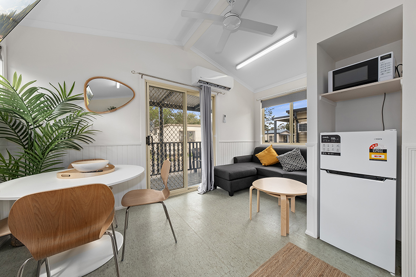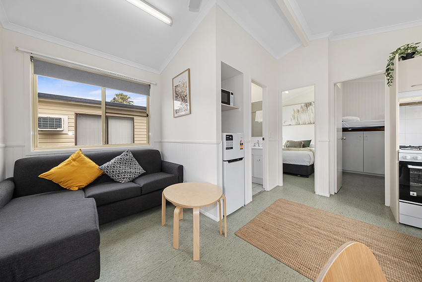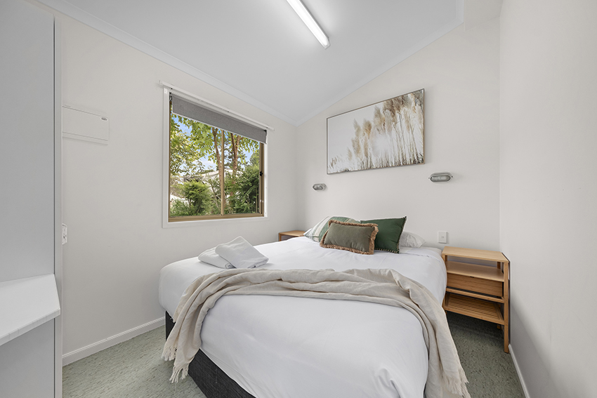 Our 2 Bedroom Budget Cabin sleeps up to five guests with a queen bed in the main bedroom, a bunk as well as single top bunk in the second bedroom, and a bathroom with shower and toilet, kitchen, living area, and private deck. These cabins are located in the residential area of the park.