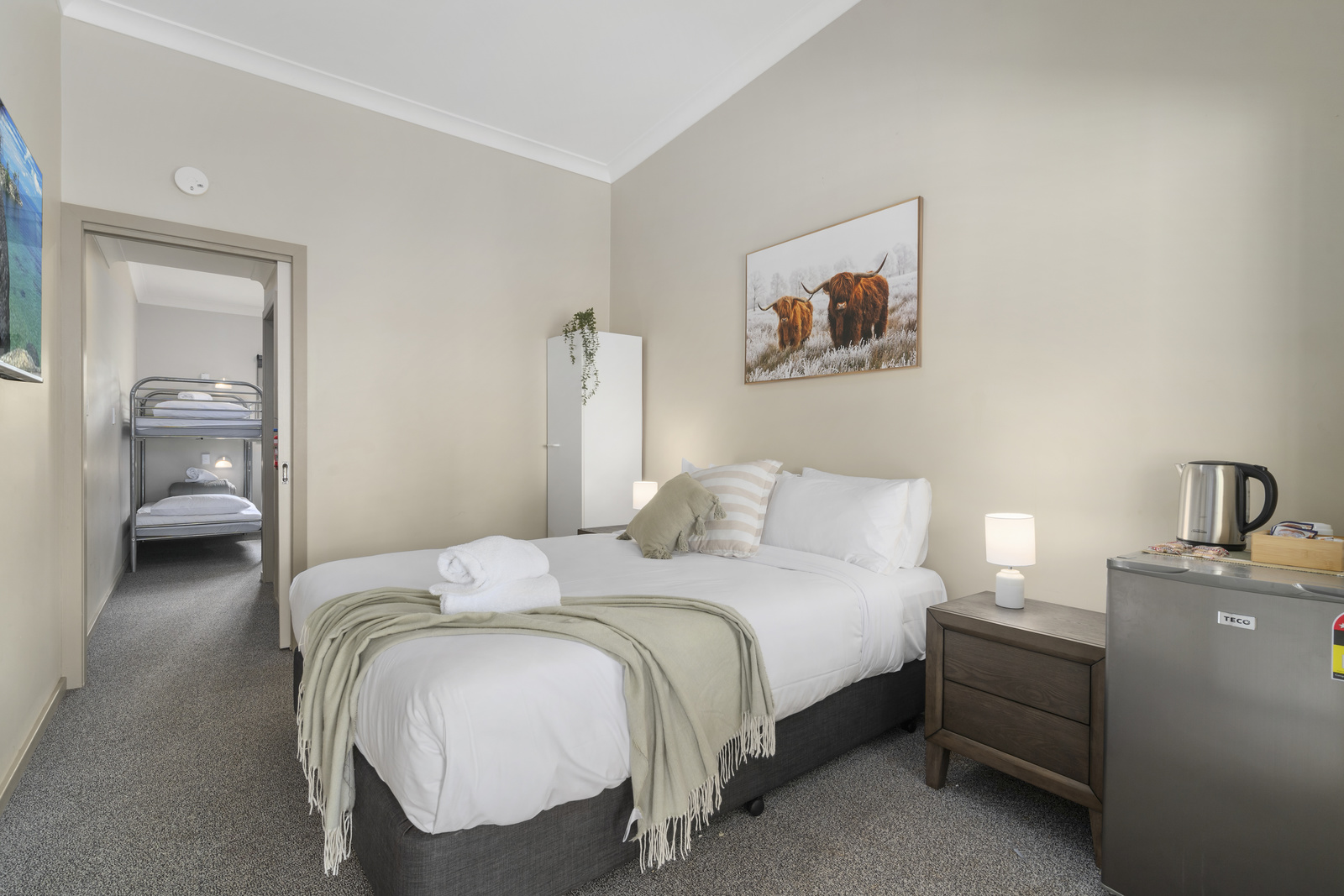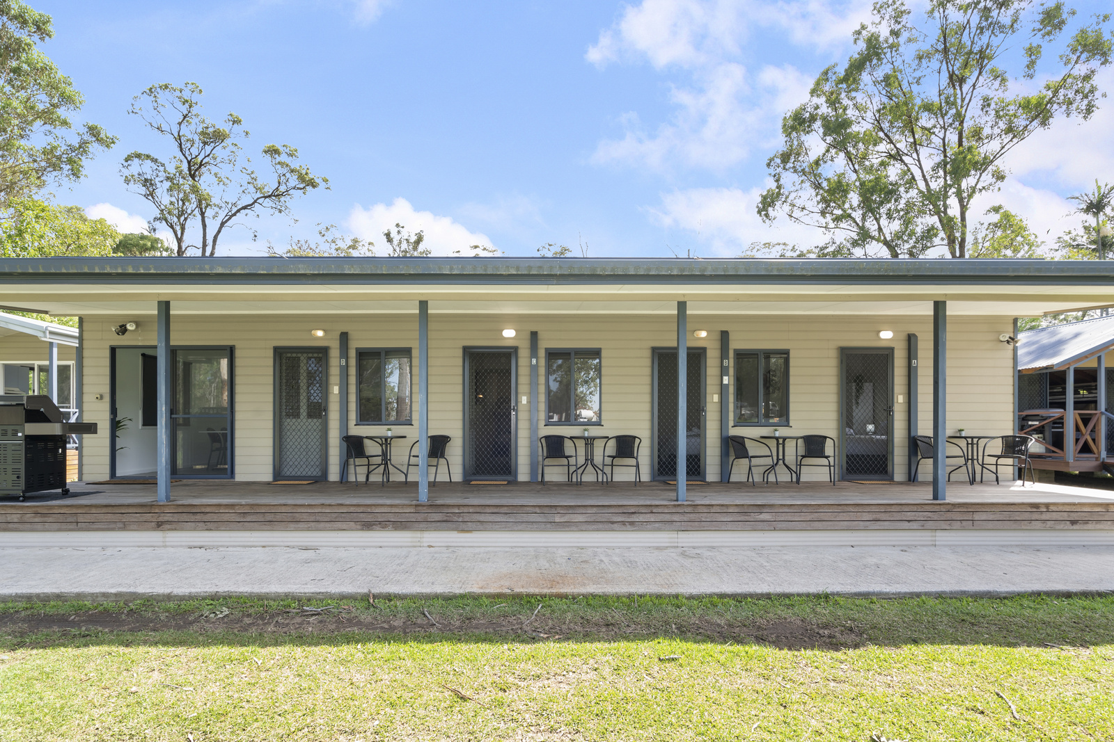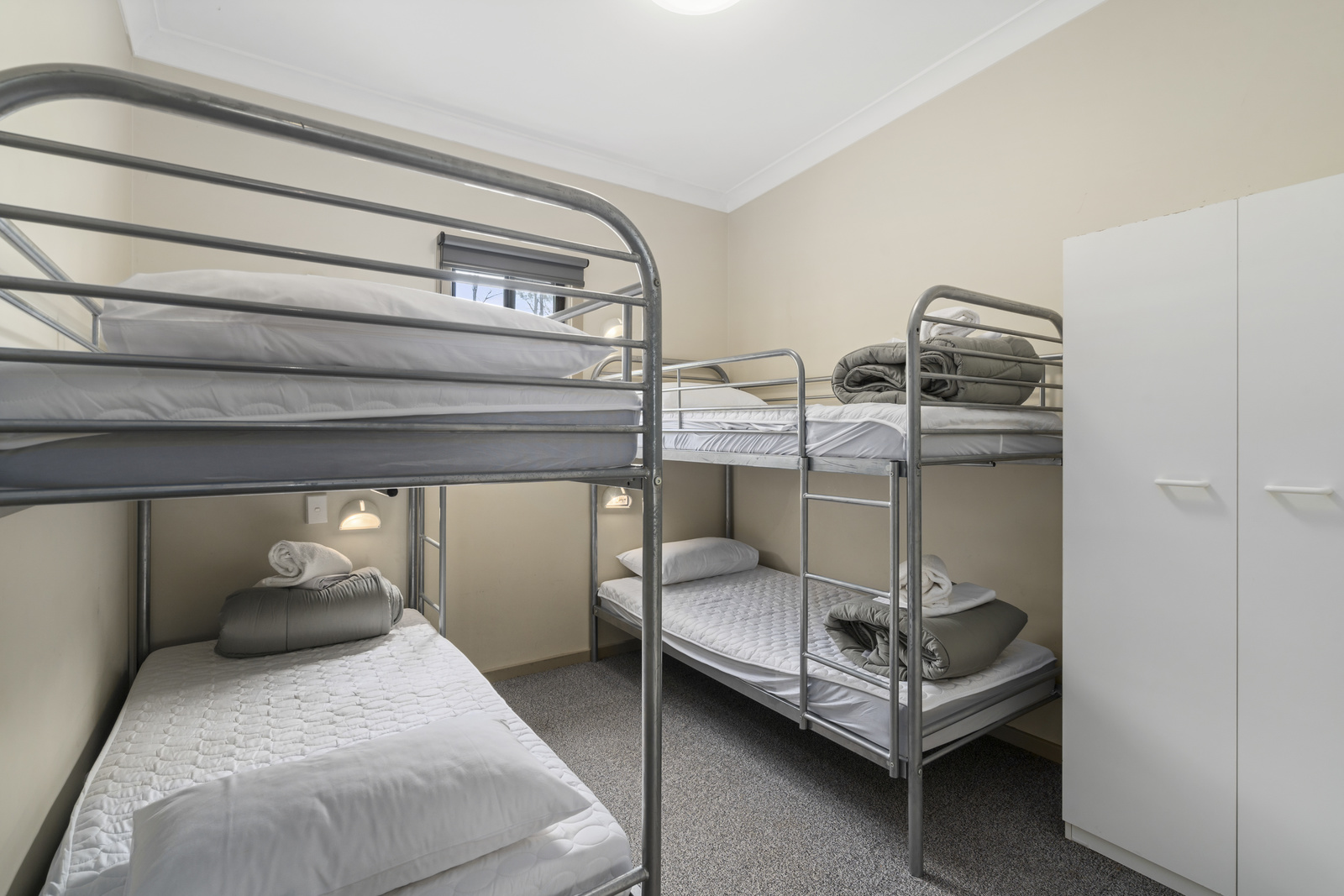 Stay in motel-style accommodation in the quiet far end of the park with a lake view. Our Family Motel Room sleeps up to six guests, with a queen bed in the main bedroom and two bunks in the second bedroom, as well as a bathroom and a shared deck area, with access to an external communal kitchen.