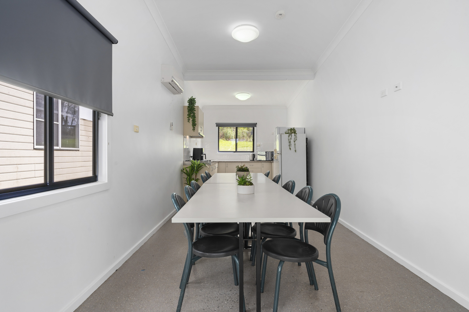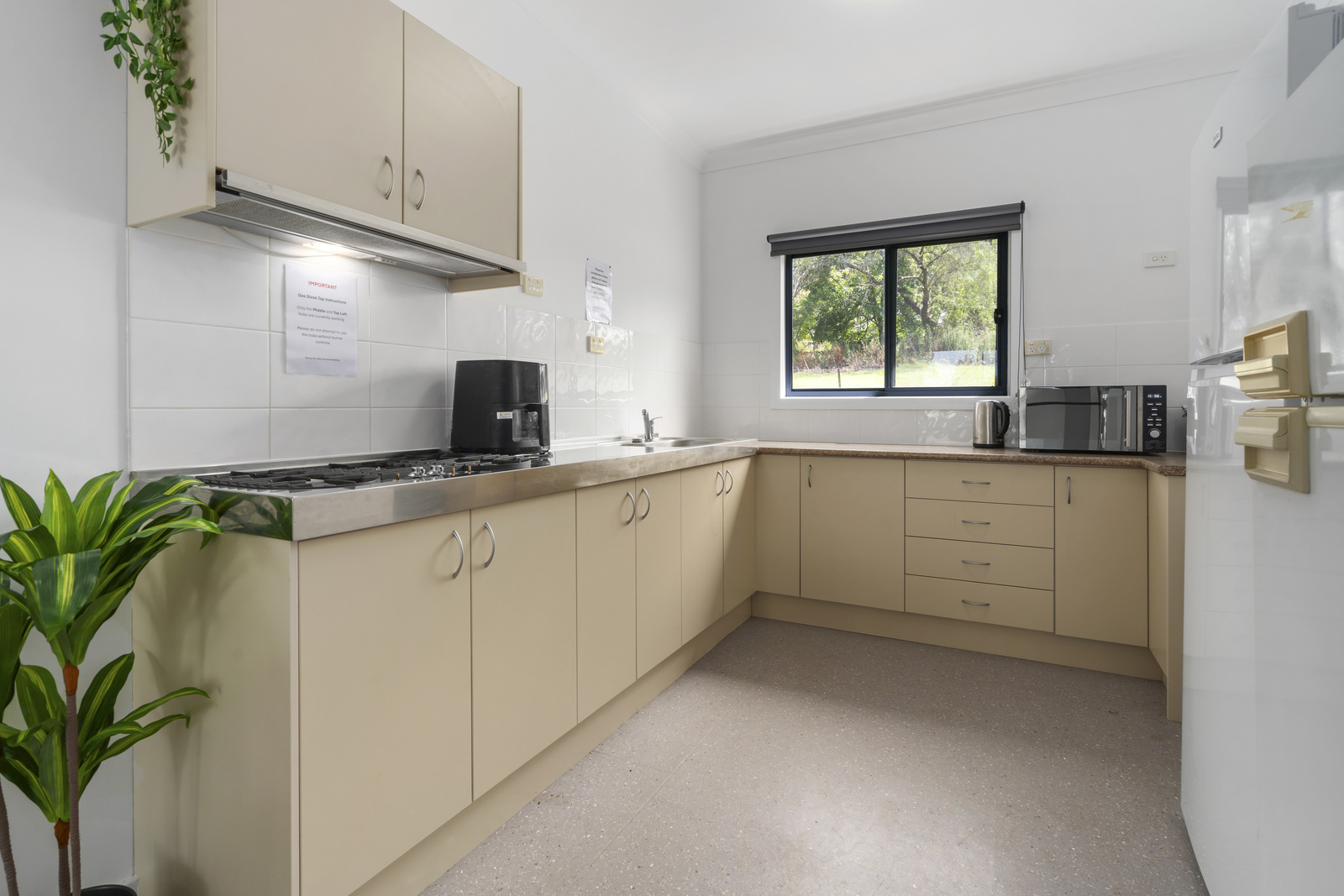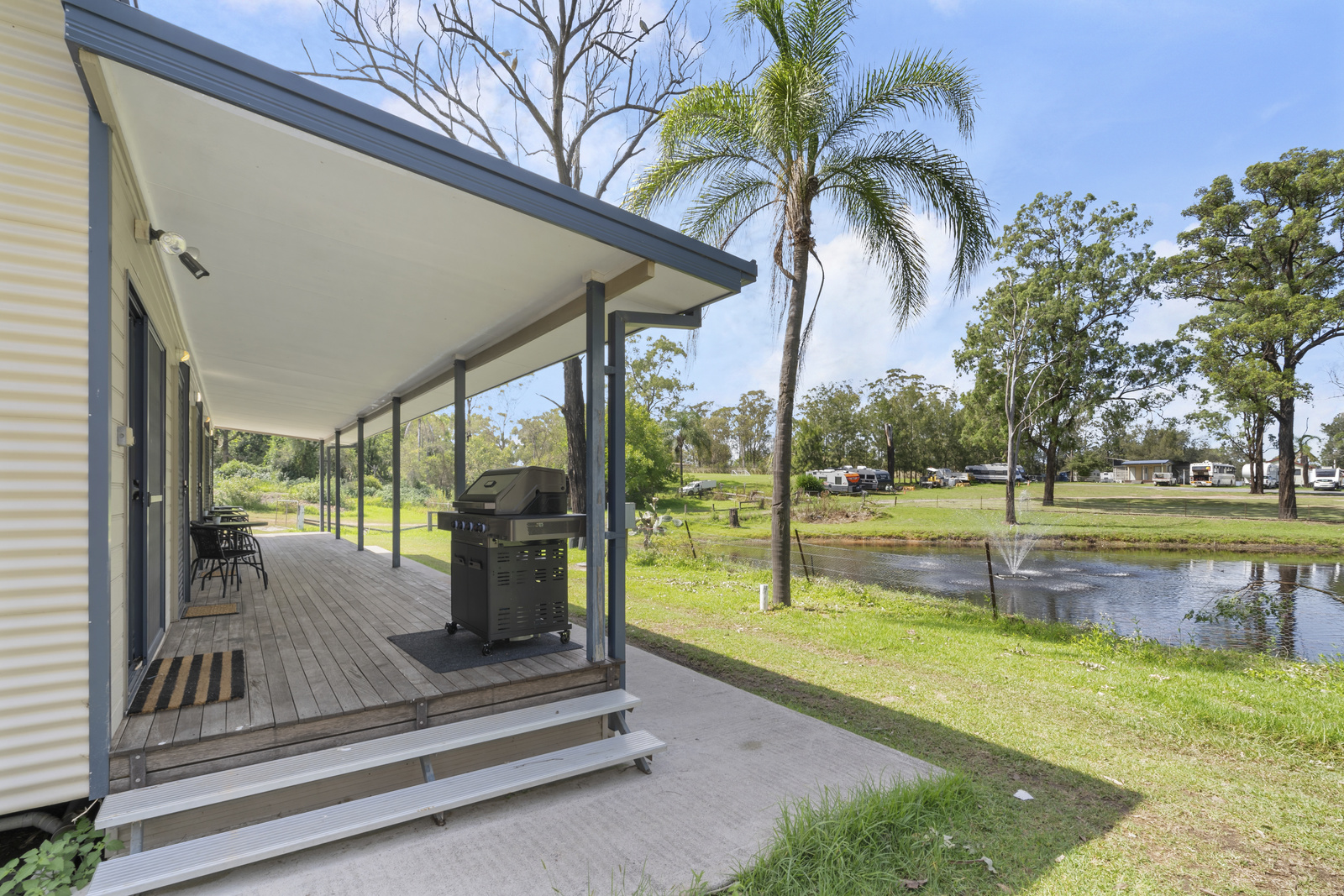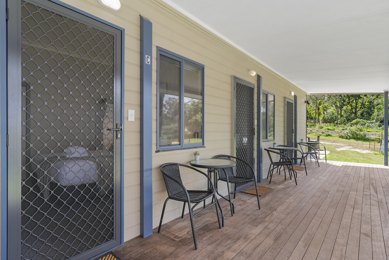 Stay in motel-style accommodation in the quiet far end of the park with a lake view. Our Family Motel Room sleeps up to six guests, with a queen bed in the main bedroom and two bunks in the second bedroom, as well as a bathroom and a shared deck area, with access to an external communal kitchen.