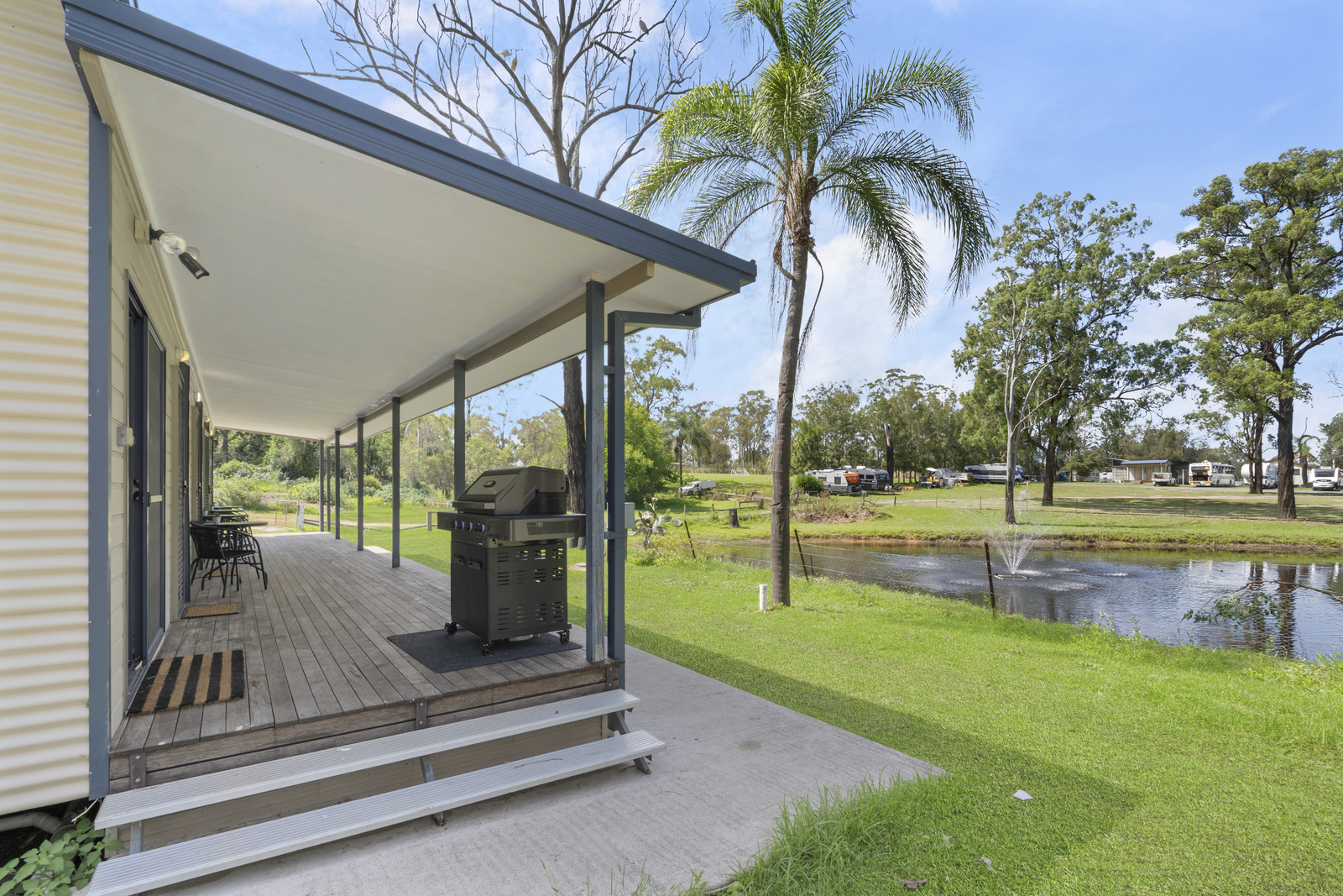 Stay in motel-style accommodation in the quiet far end of the park with a lake view.
