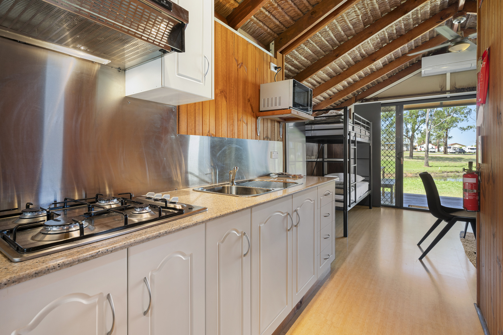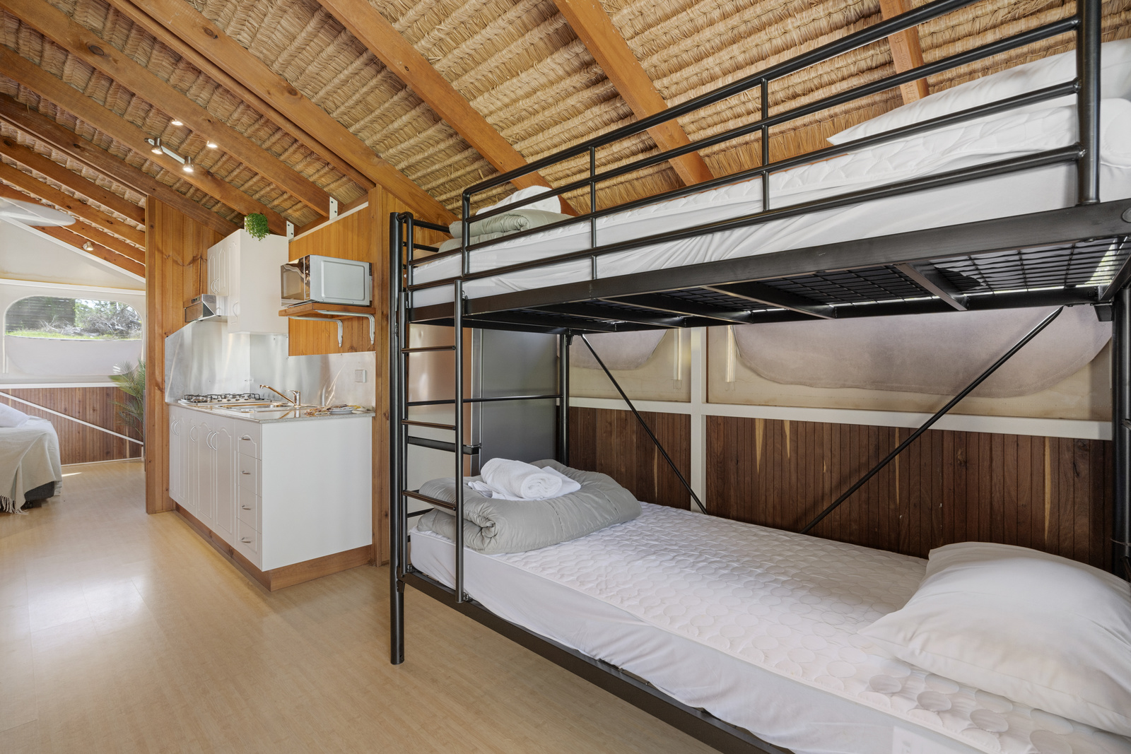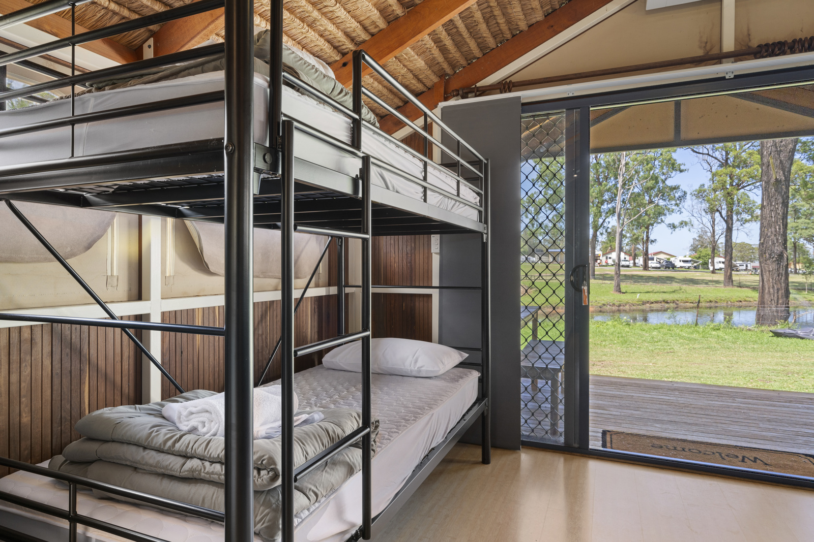 Enjoy a relaxed family stay in the quiet far end of the park with a lake view. Our Safari Tent sleeps up to four guests, with a king bed in the main bedroom, and a bunk in the living area, as well as a bathroom, kitchen, and private deck.