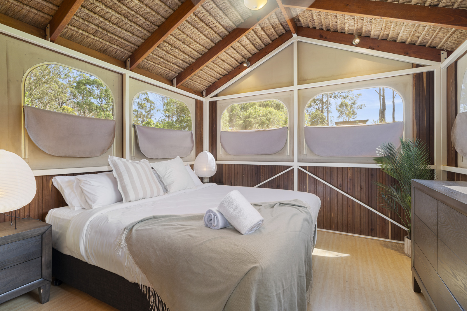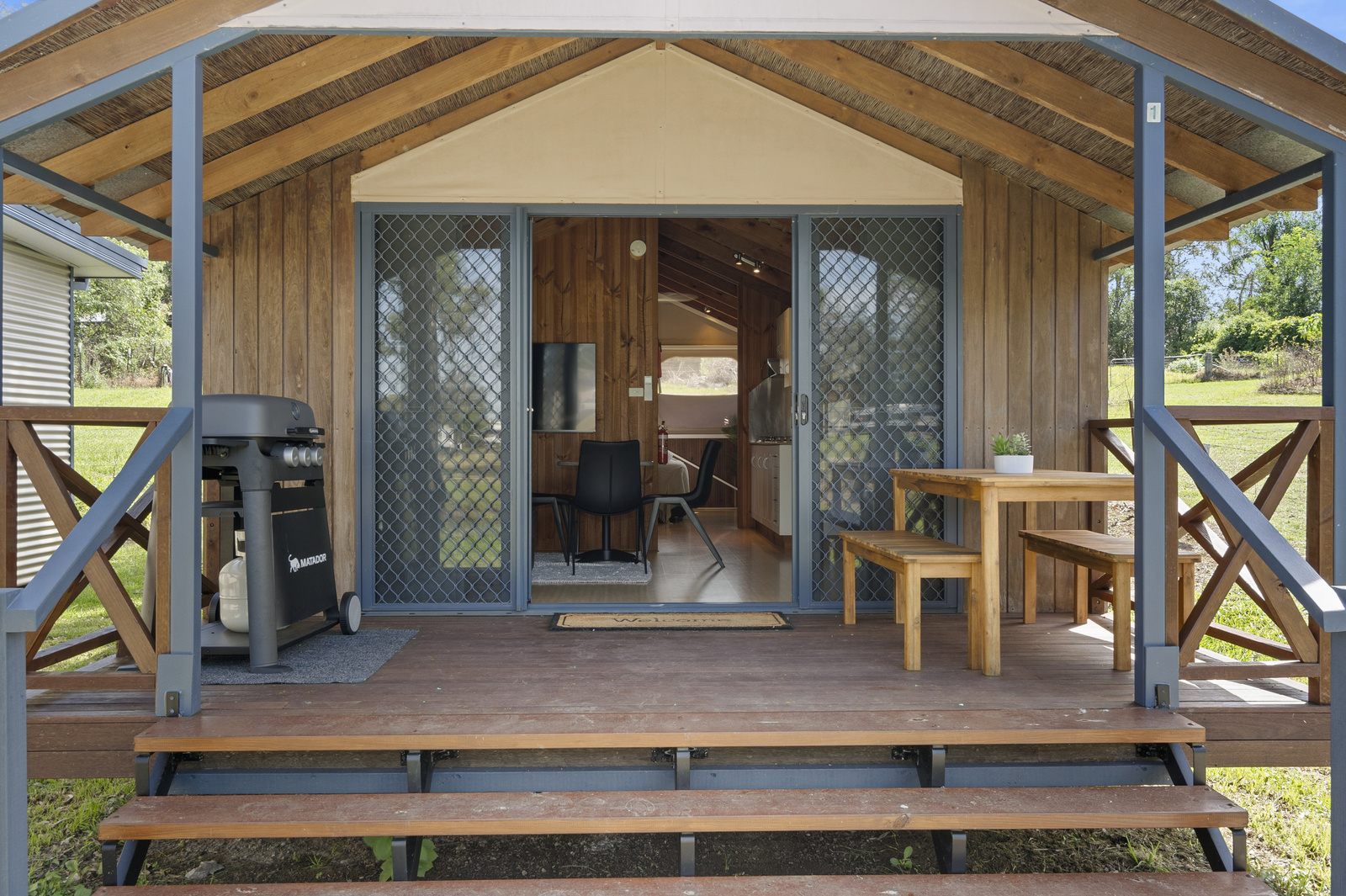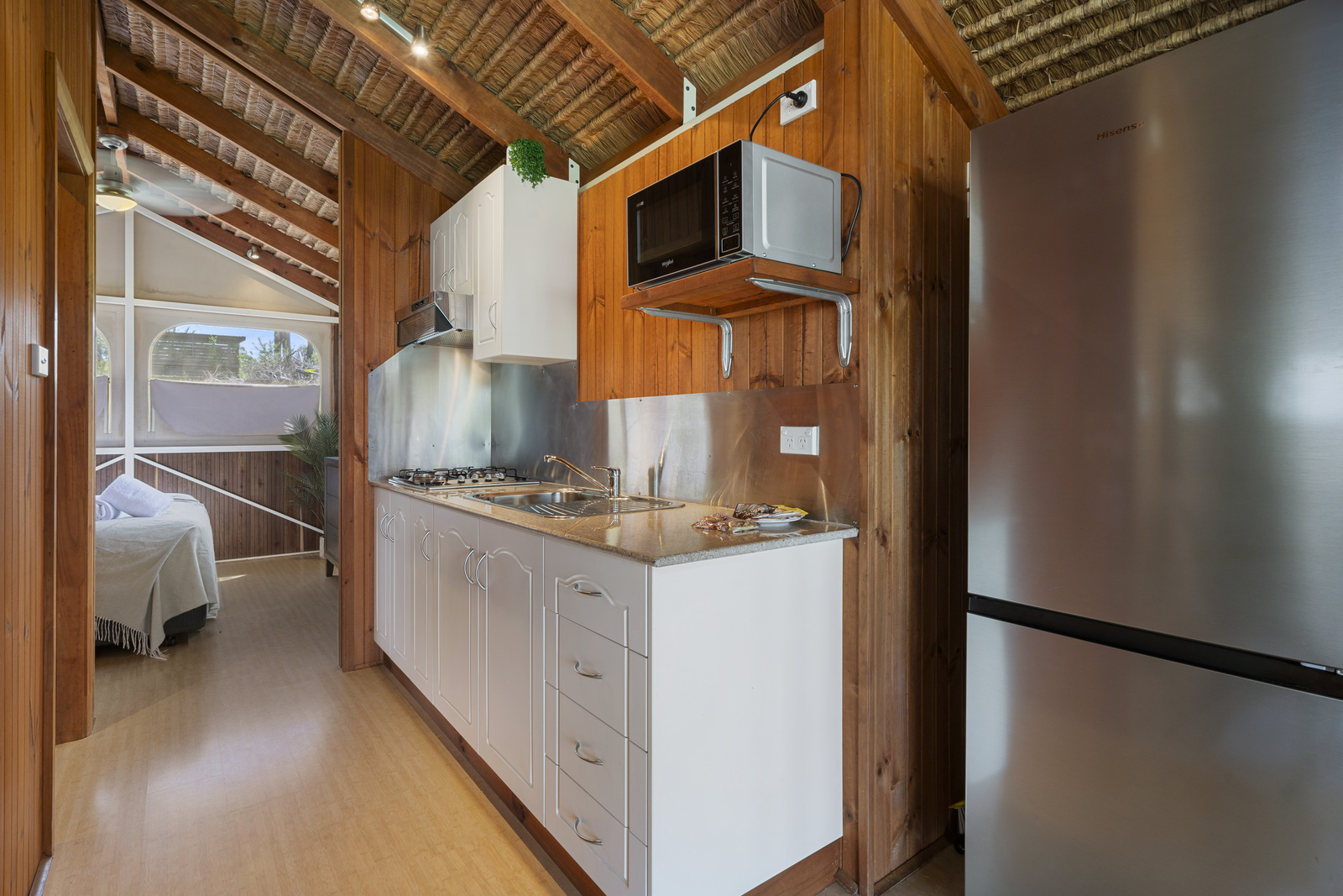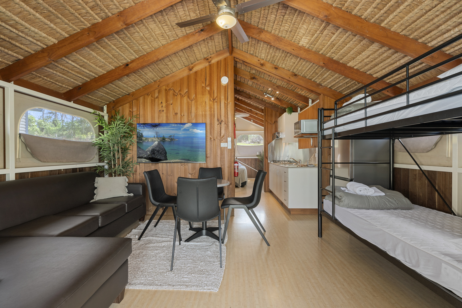 Enjoy a relaxed family stay in the quiet far end of the park with a lake view. Our Safari Tent sleeps up to four guests, with a king bed in the main bedroom, and a bunk in the living area, as well as a bathroom, kitchen, and private deck.