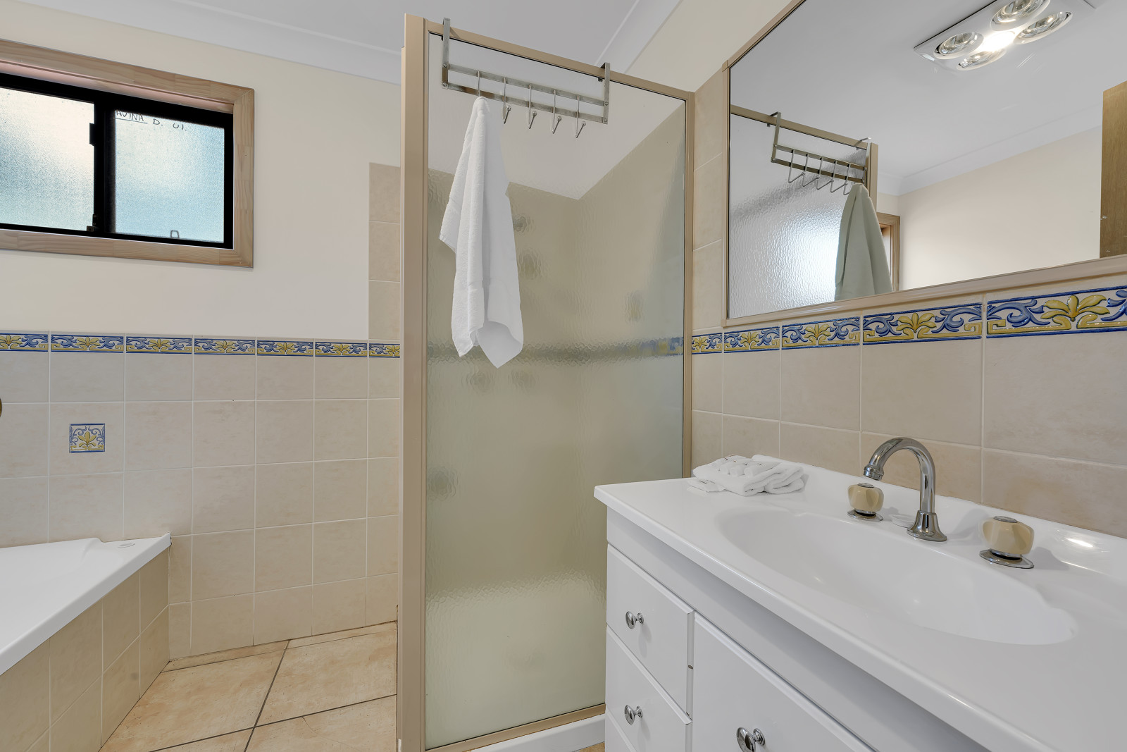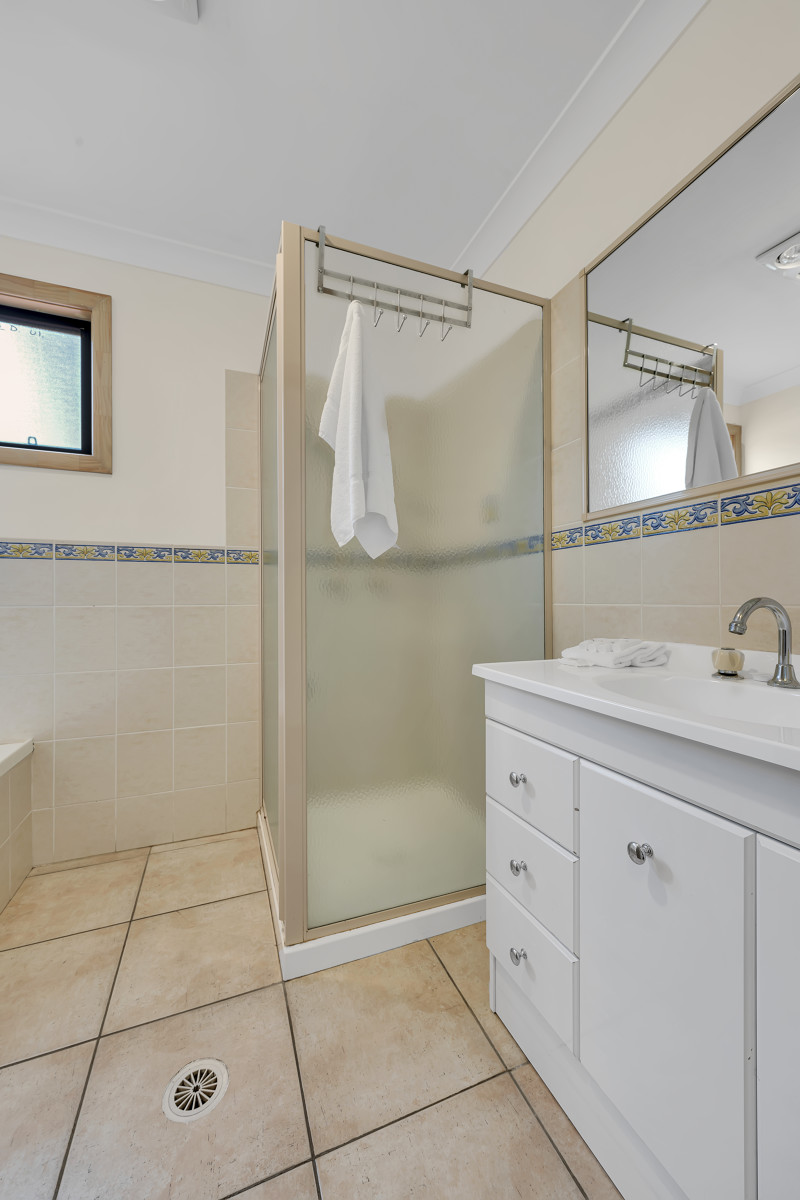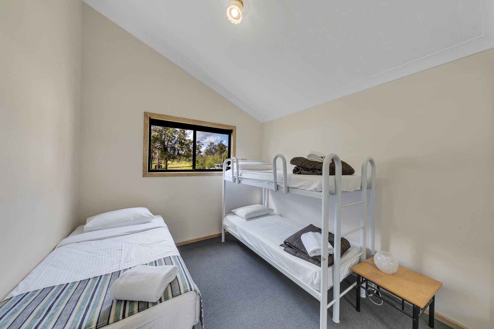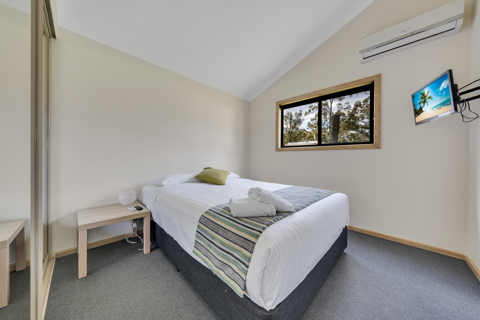 Our Standard 2 Bedroom Villas sleep up to five guests with a queen bed in the main bedroom and a single bed and bunks in the second bedroom as well as a bathroom, kitchen, living area, washing machine, and small private deck.