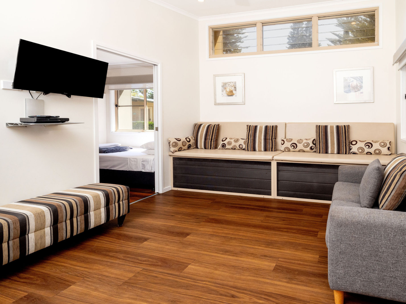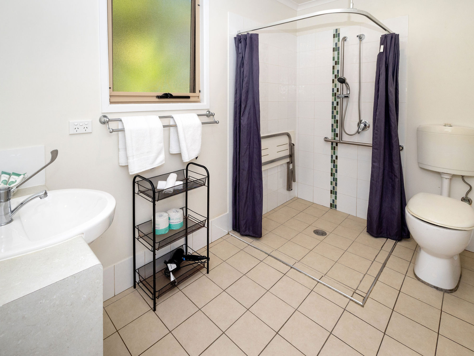 Fully accessible cabin with ramp access, located overlooking the garden. One queen and two singles. Features air-conditioning; heating; kitchen including stovetop, convection microwave and fridge; fully accessible bathroom; veranda with outdoor dining; dining area; seating and sofa area with TV and DVD.