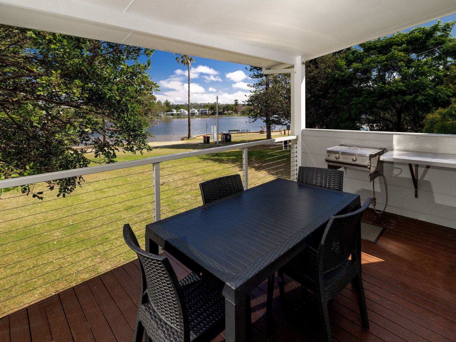 Located overlooking the lake. One queen and two singles. Features air-conditioning; heating; kitchen including stovetop, convection microwave, dishwasher and fridge; veranda with outdoor furniture, private barbecue and outdoor dining; bathroom; dining area; seating and sofa with TV and DVD.