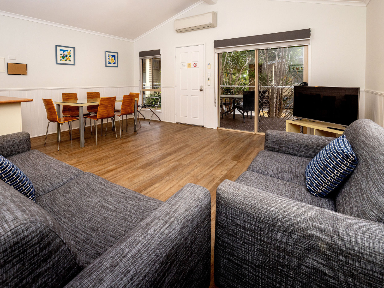 Located close to park facilities. Two queens. Features air-conditioning; heating; full kitchen including stovetop, convection microwave and fridge; dining area; bathroom; veranda including outdoor furniture and dining area; sofa and seating area with TV and DVD.