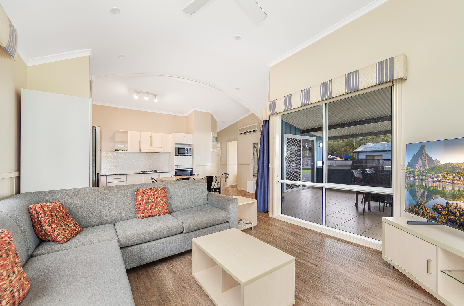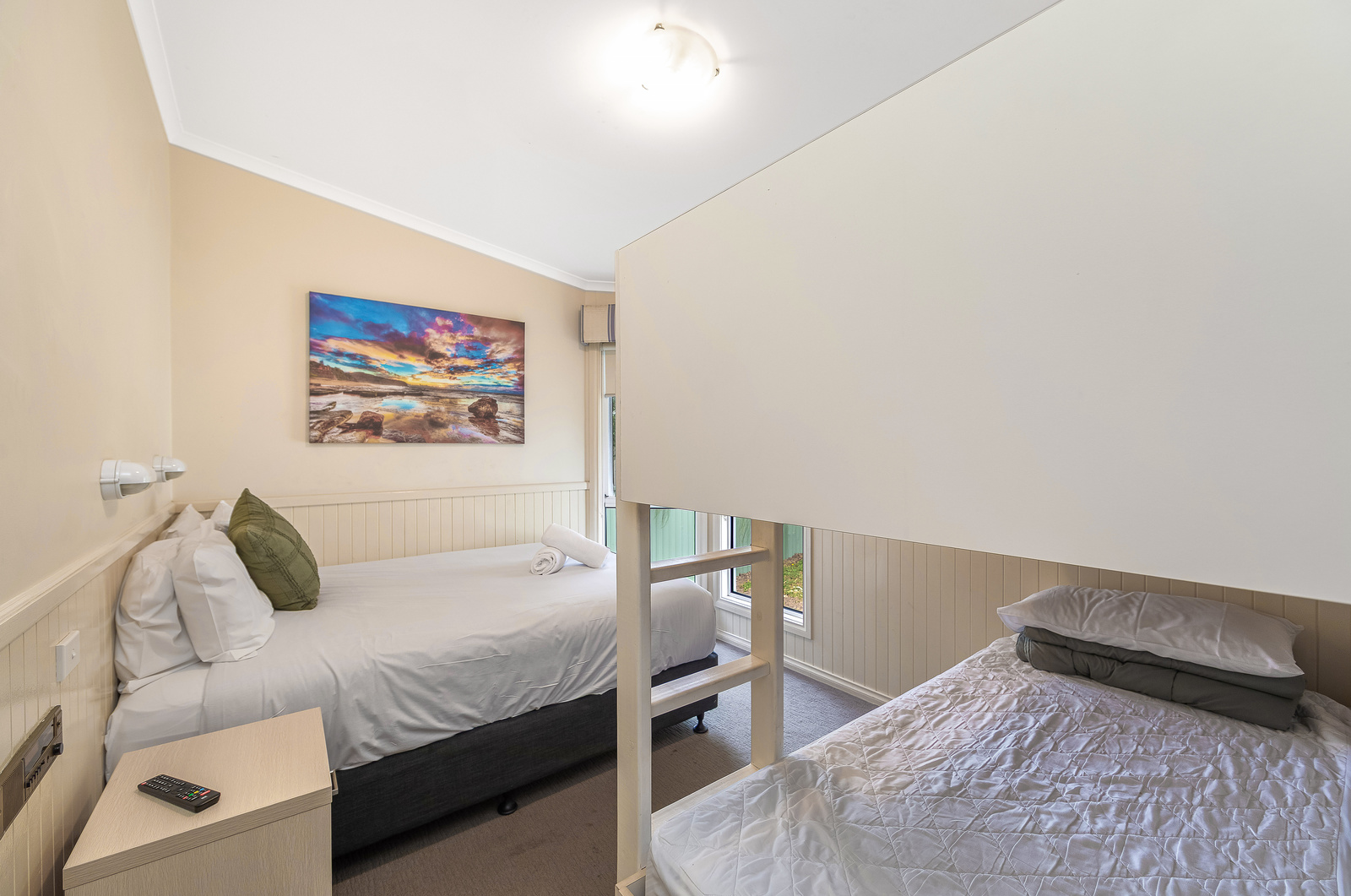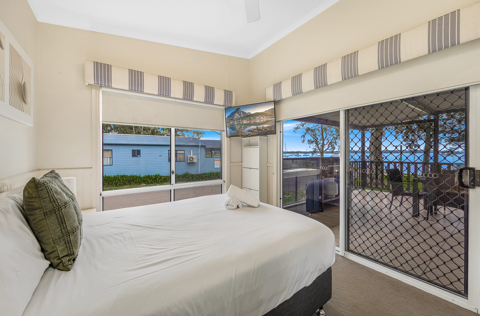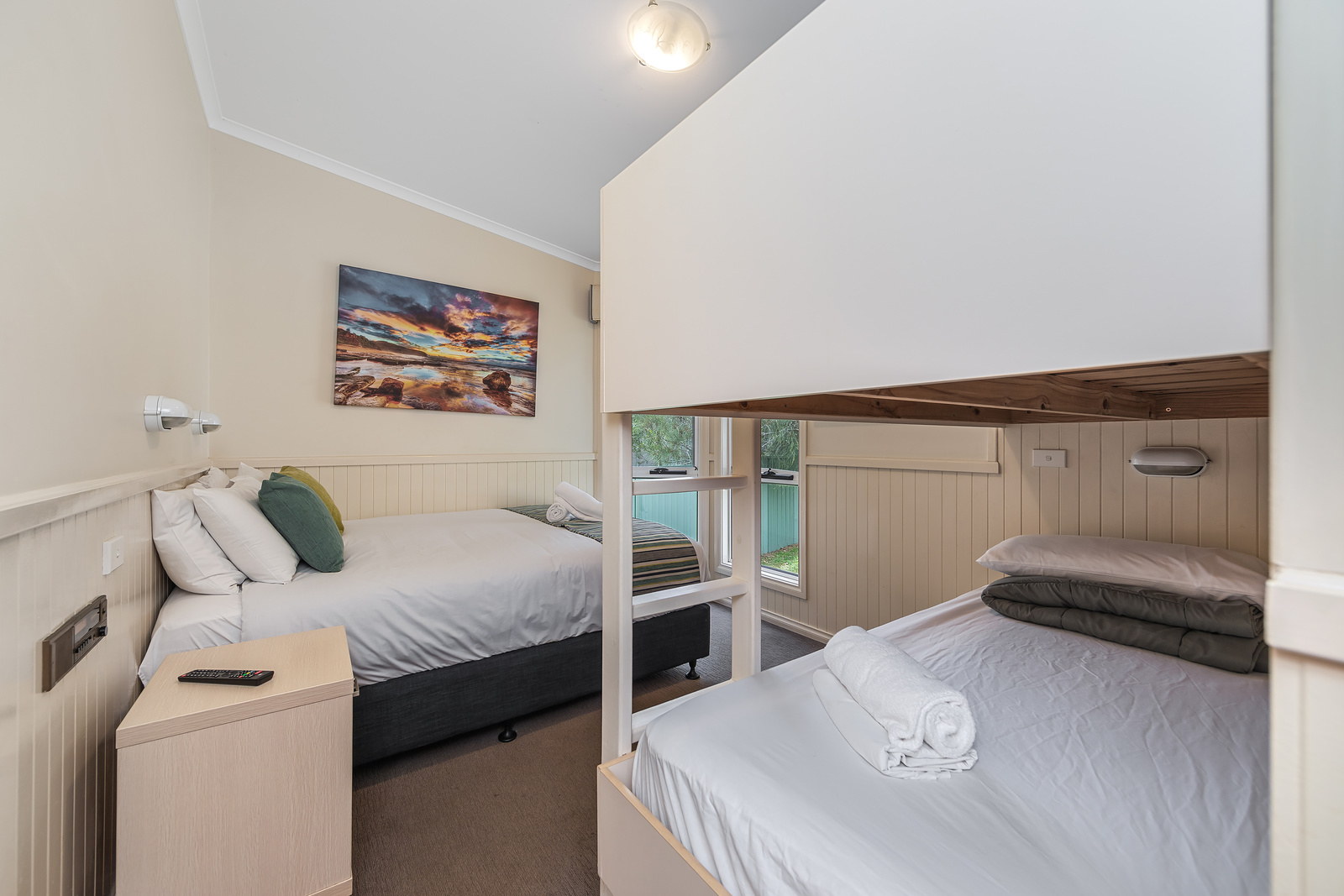 Our Boat Sheds sleep up to six guests with a queen bed in the main bedroom and a double bed plus bunk in the second bedroom, as well a bathroom, kitchen, living area, and private deck.