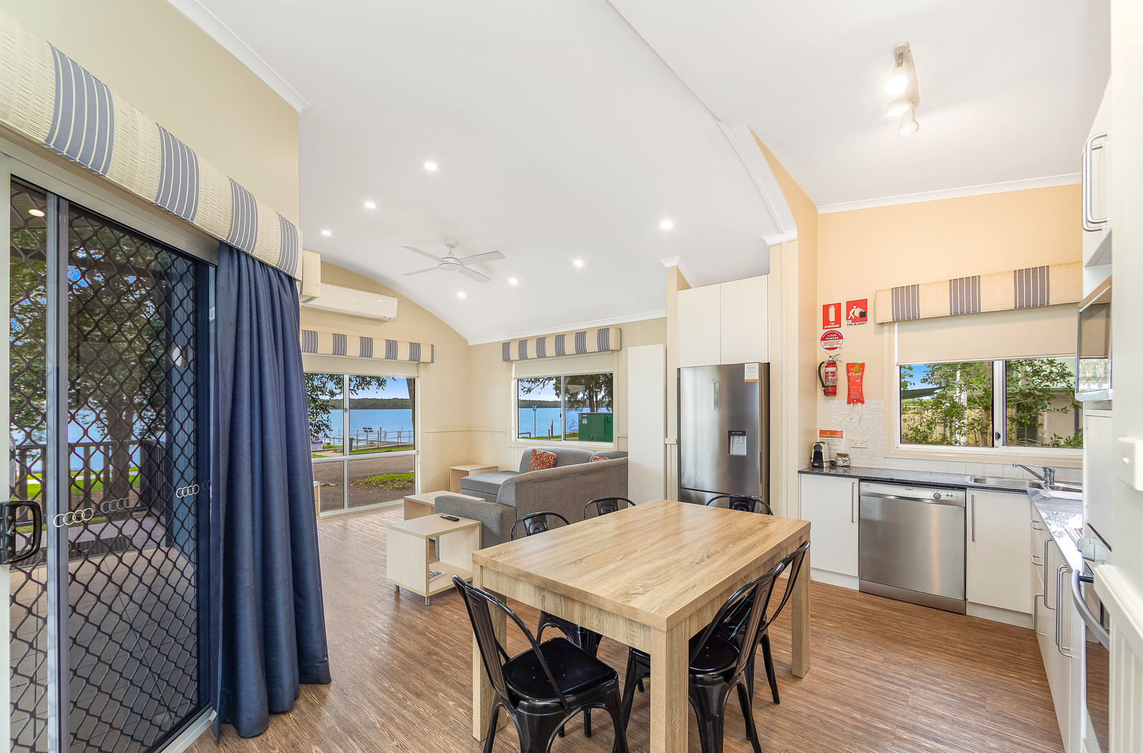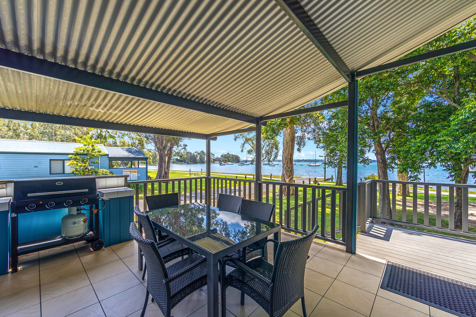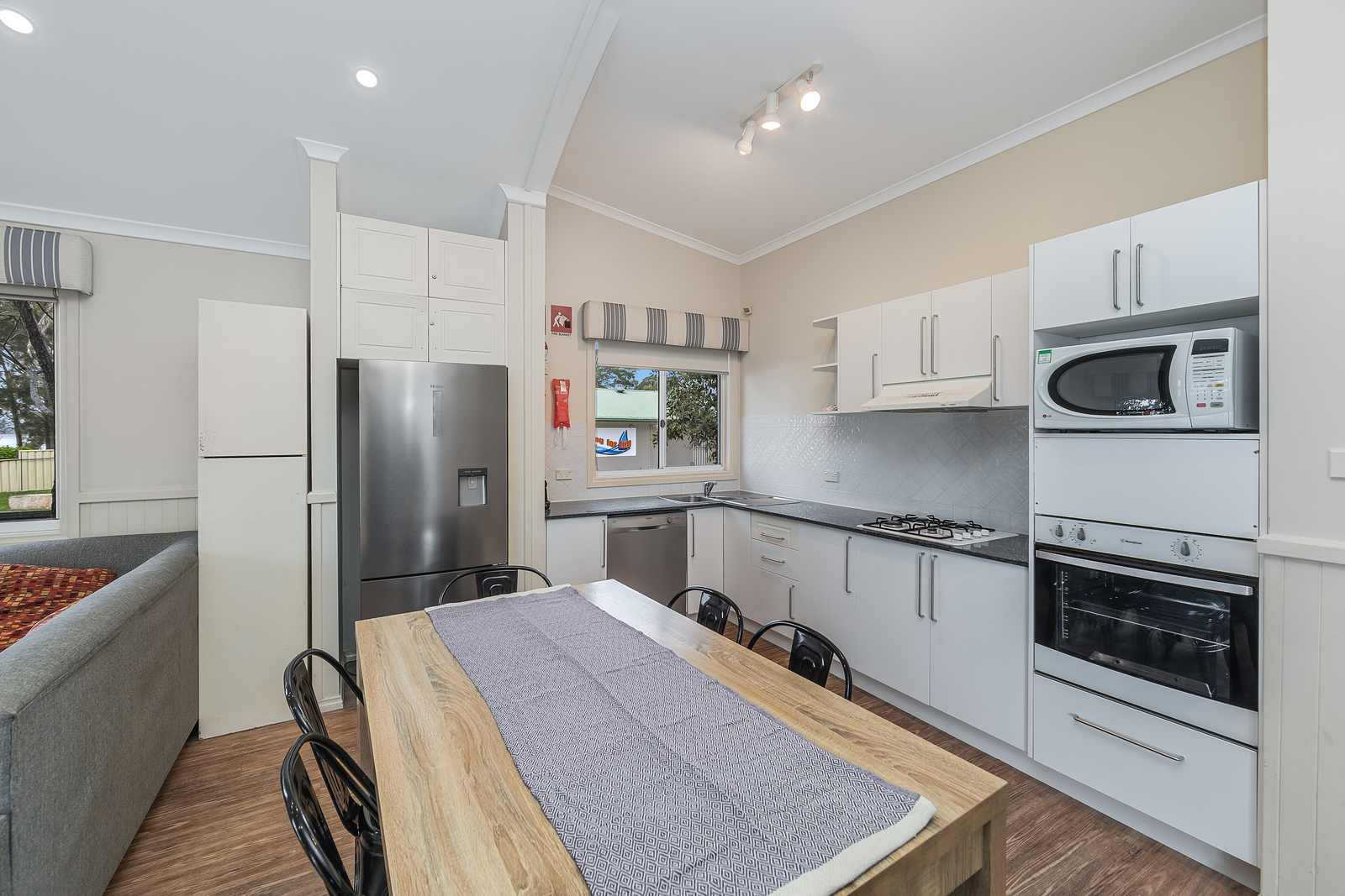 Our Boat Sheds sleep up to six guests with a queen bed in the main bedroom and a double bed plus bunk in the second bedroom, as well a bathroom, kitchen, living area, and private deck.