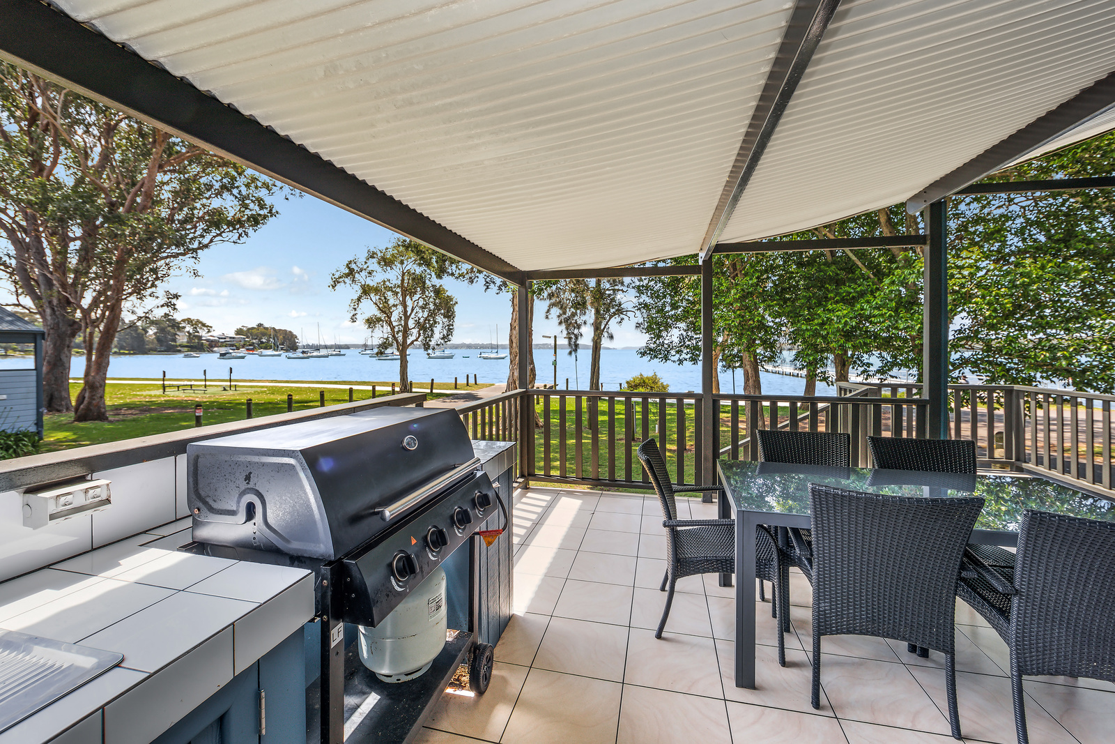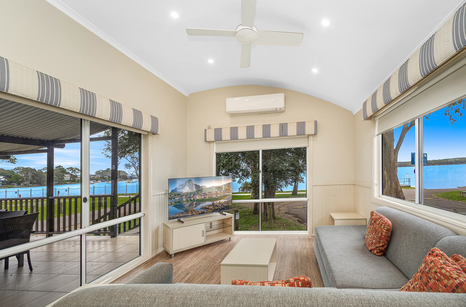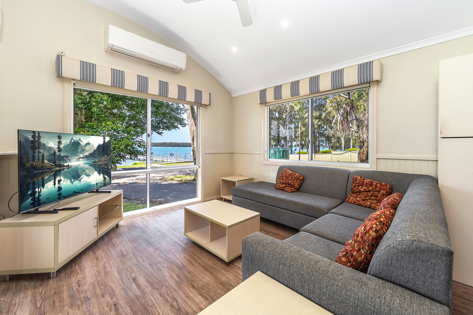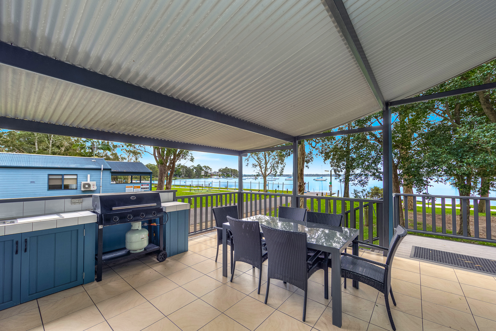 Our Boat Sheds sleep up to six guests with a queen bed in the main bedroom and a double bed plus bunk in the second bedroom, as well a bathroom, kitchen, living area, and private deck.