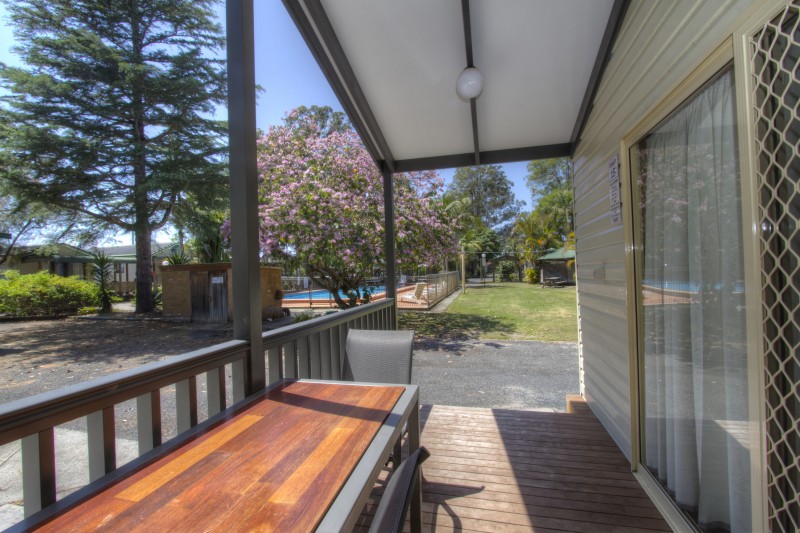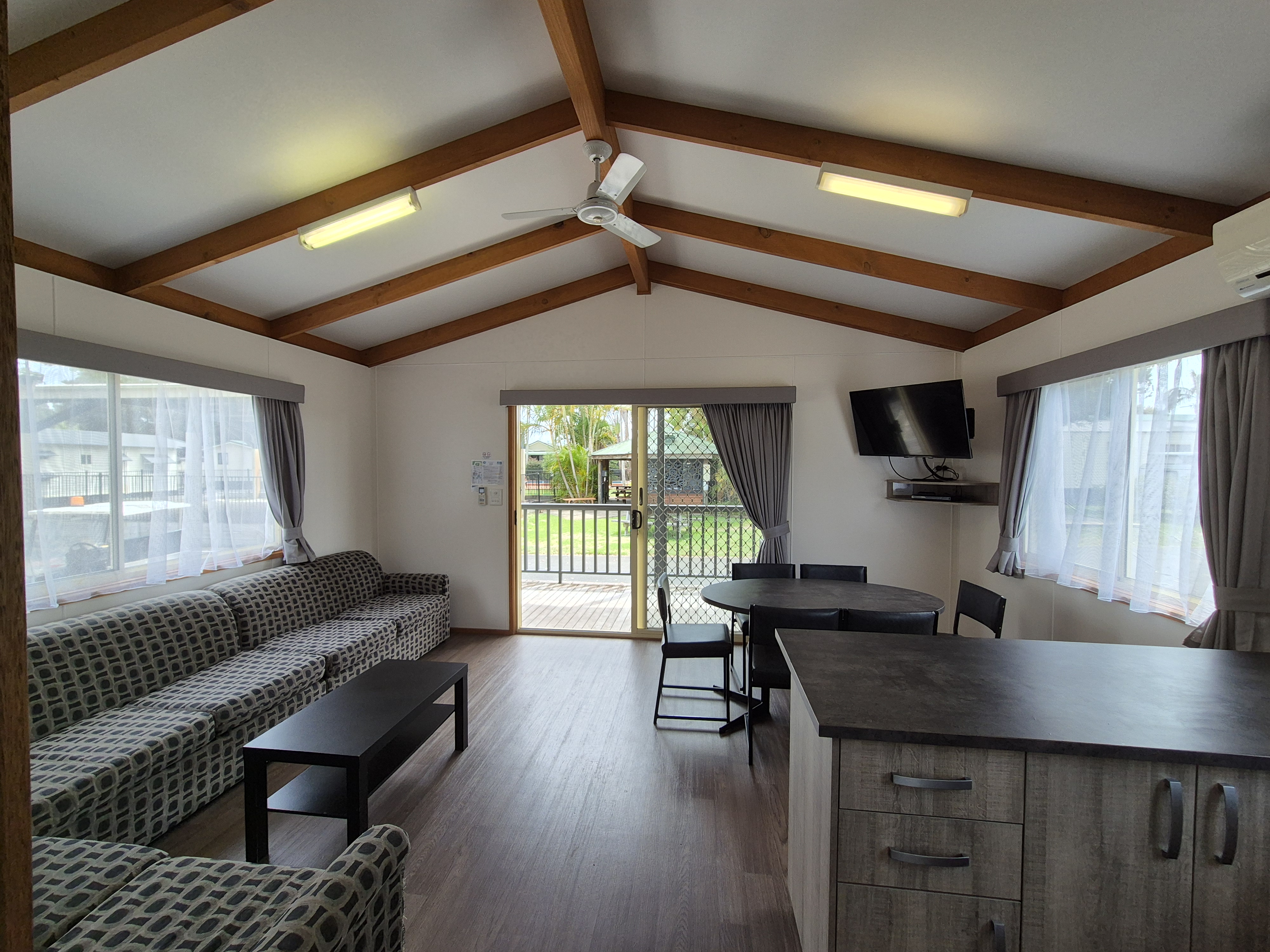 This Deluxe Cabin features 2 bedrooms with queen ensemble, 2 bunk beds. Sliding glass opens onto verandah with table and chairs.