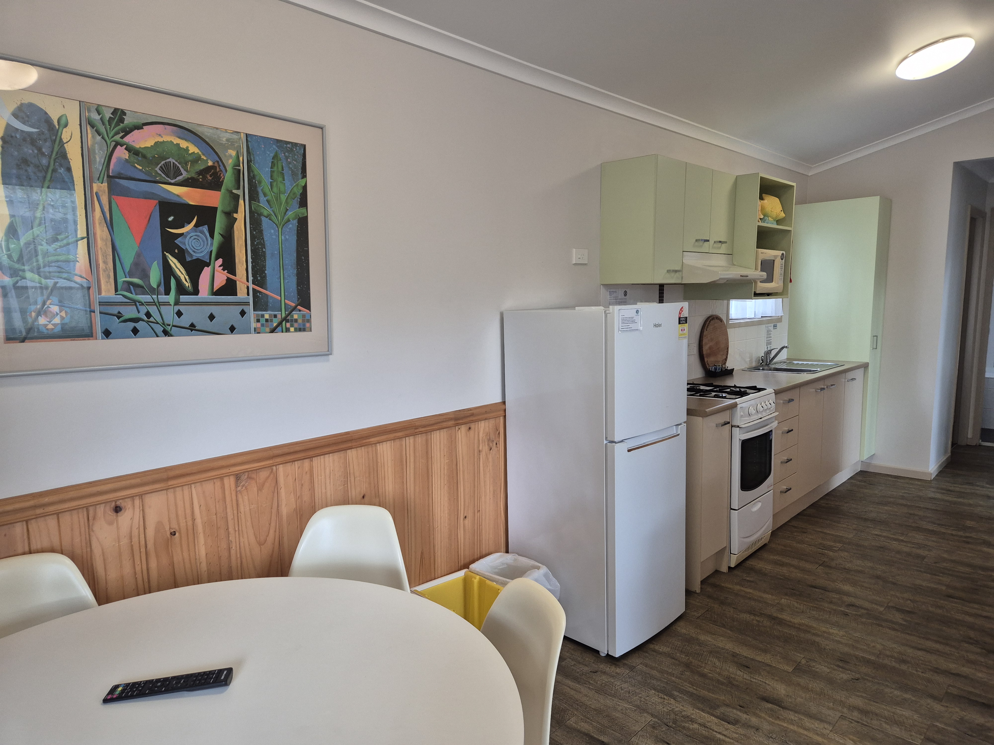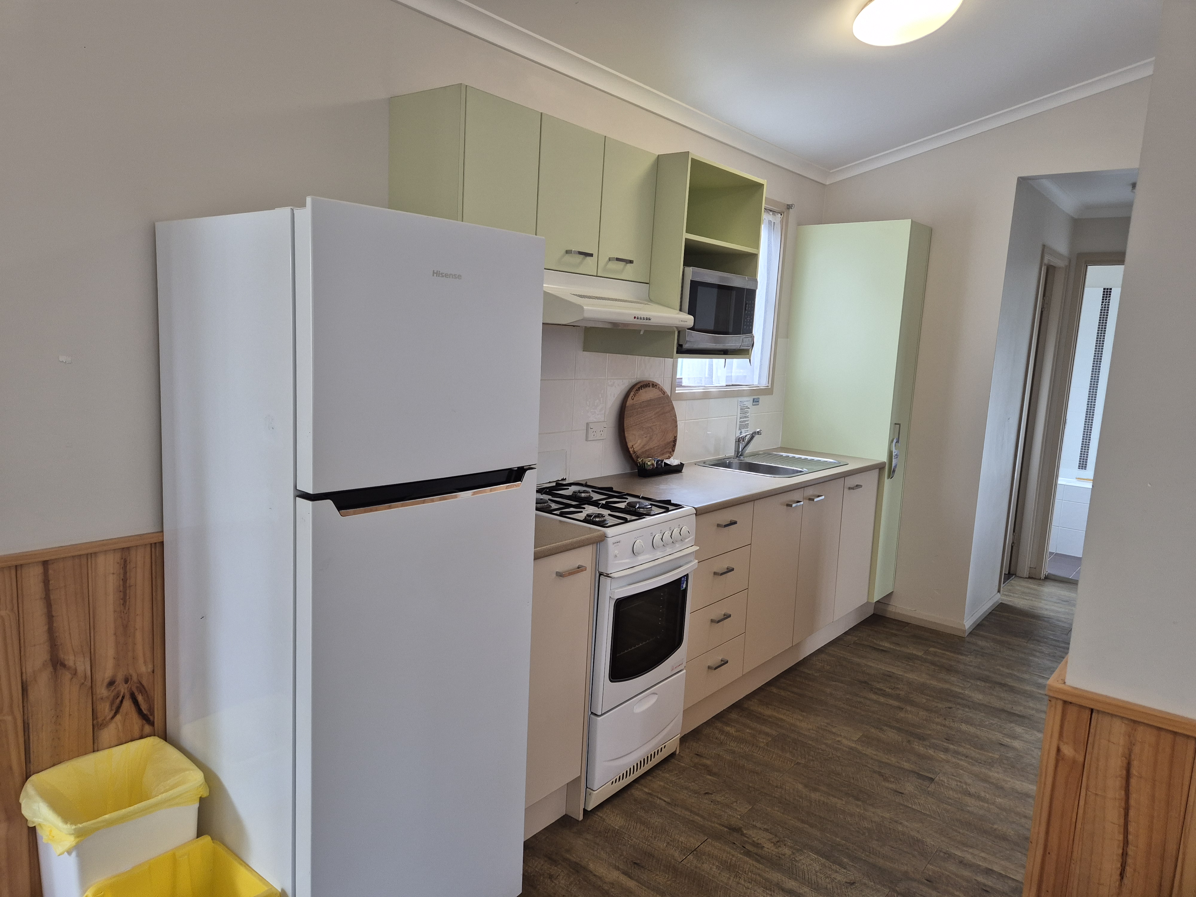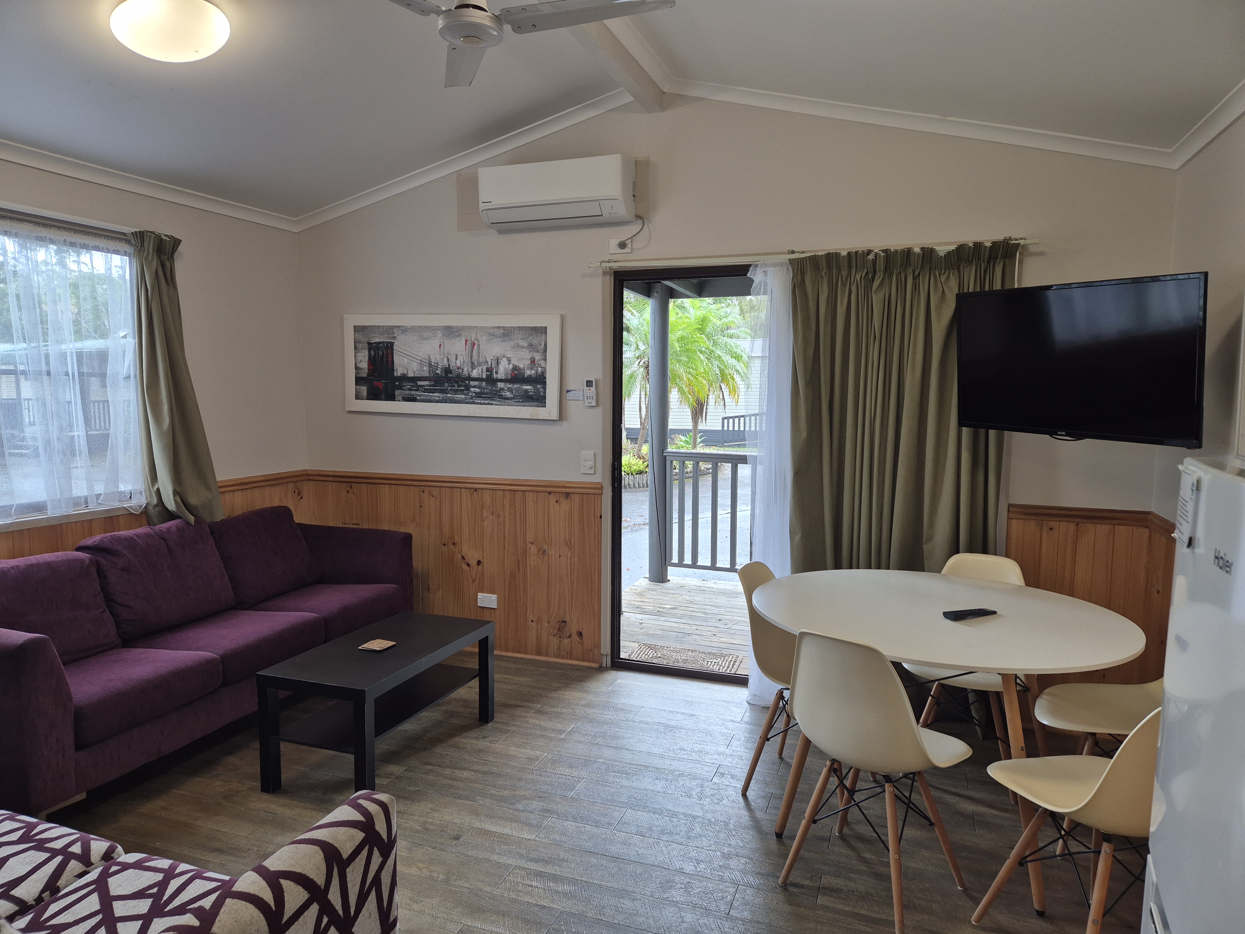 This cabin is a 2 bedroom cabin with 1 queen, 1 double and 1 single bunk. Large outdoor deck with table and chairs overlooking landscape gardens with view to pool.