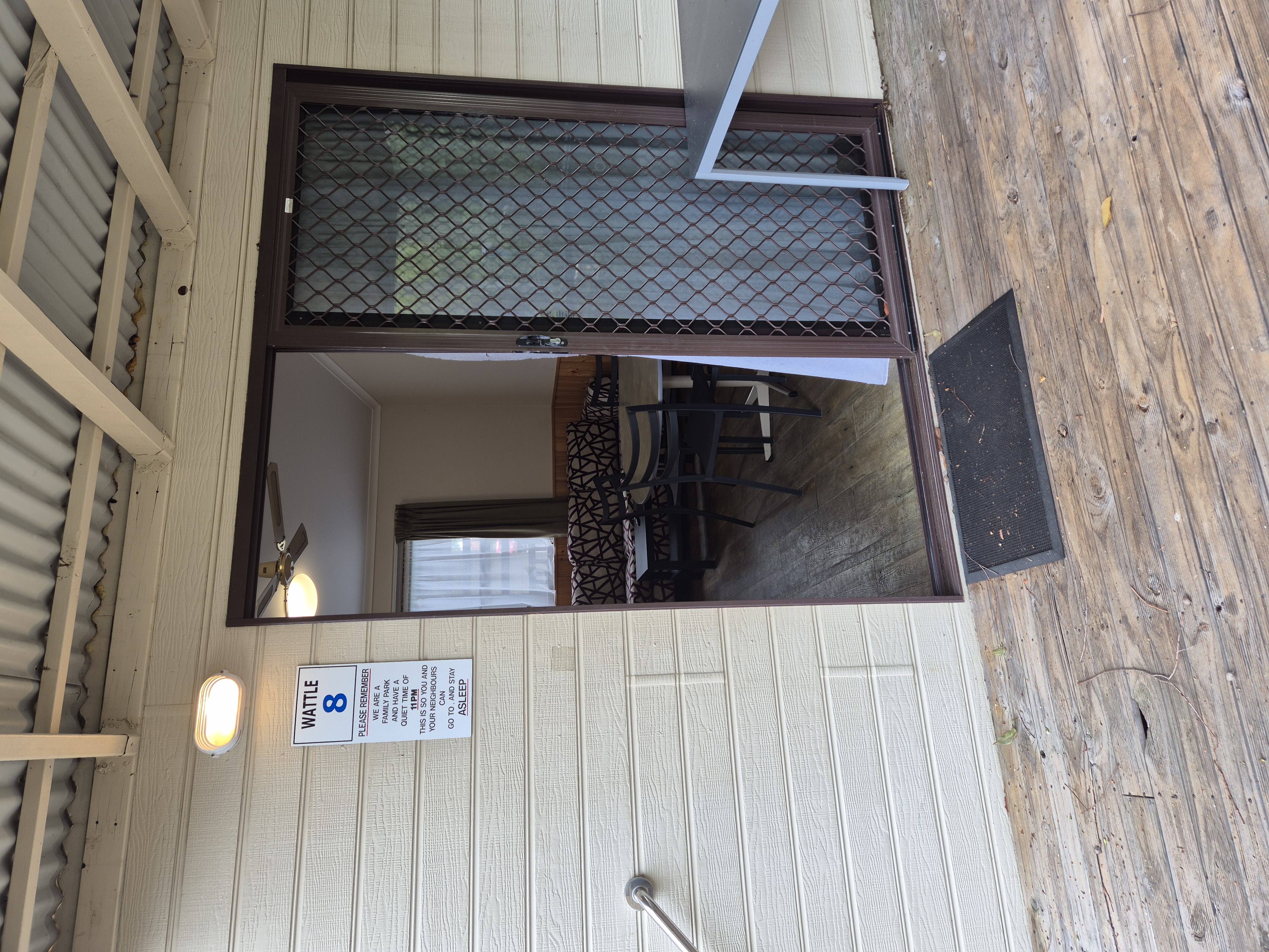 This cabin features 1 queen with 2 sets of bunks. Large outdoor deck with table and chairs overlooking landscaped gardens with view to pool.