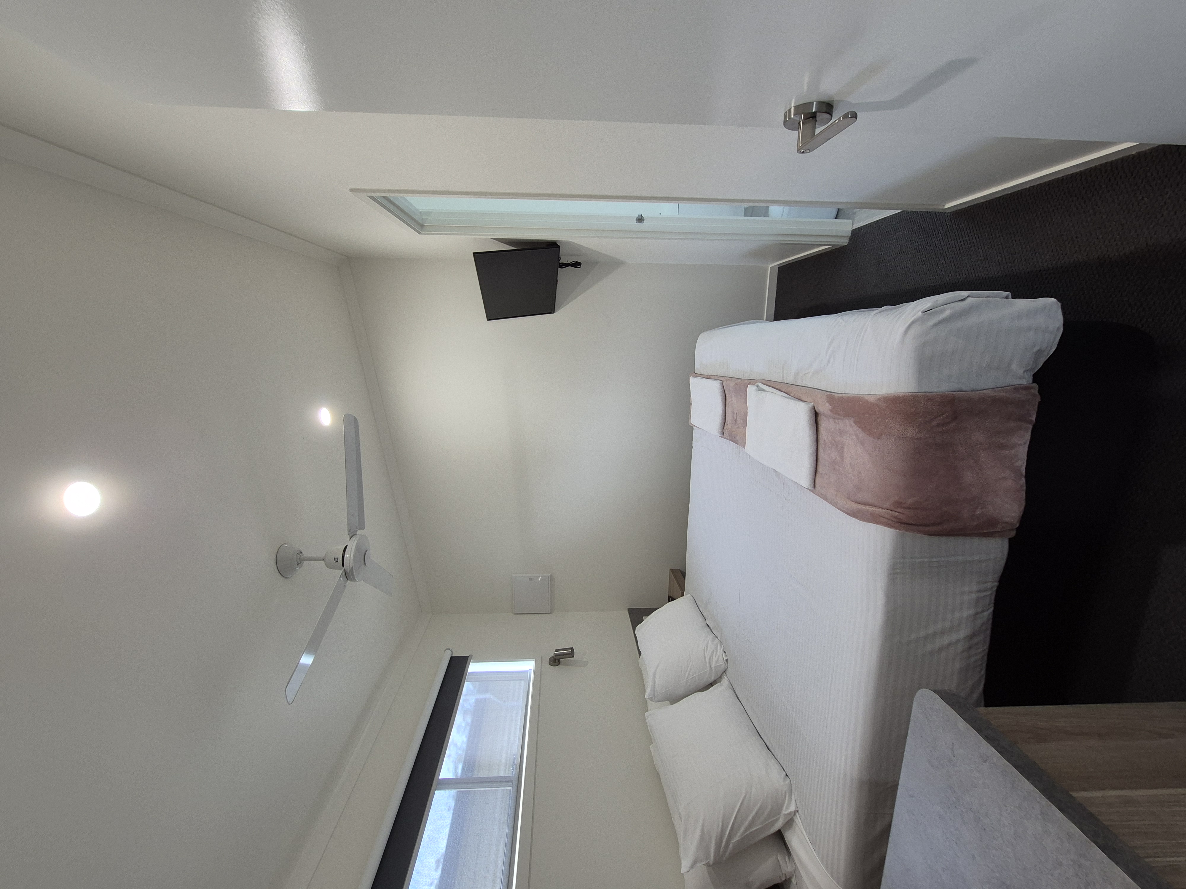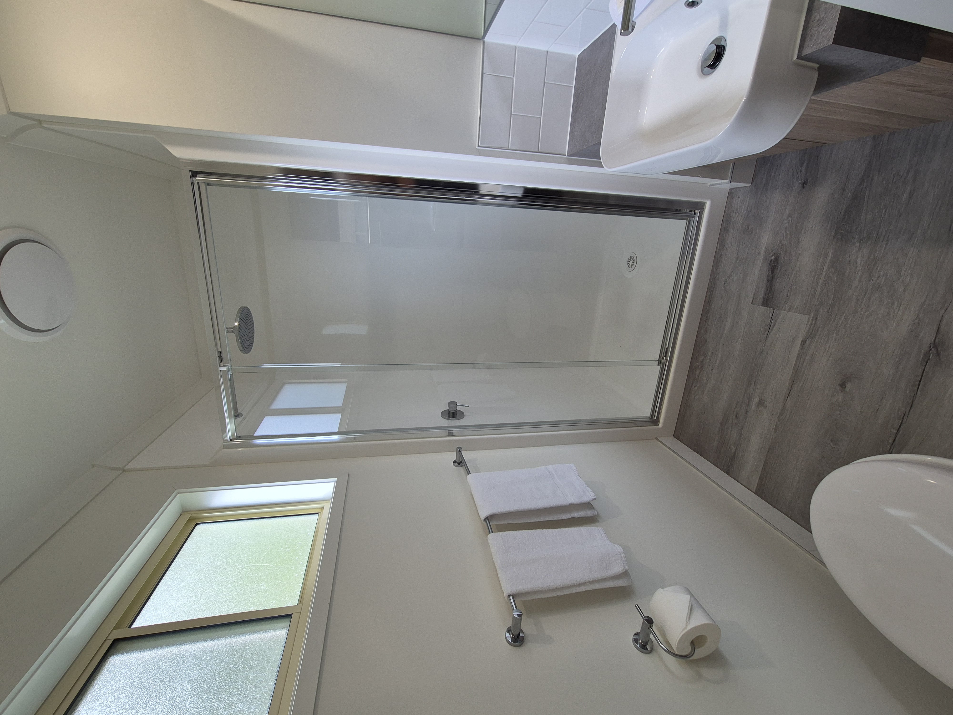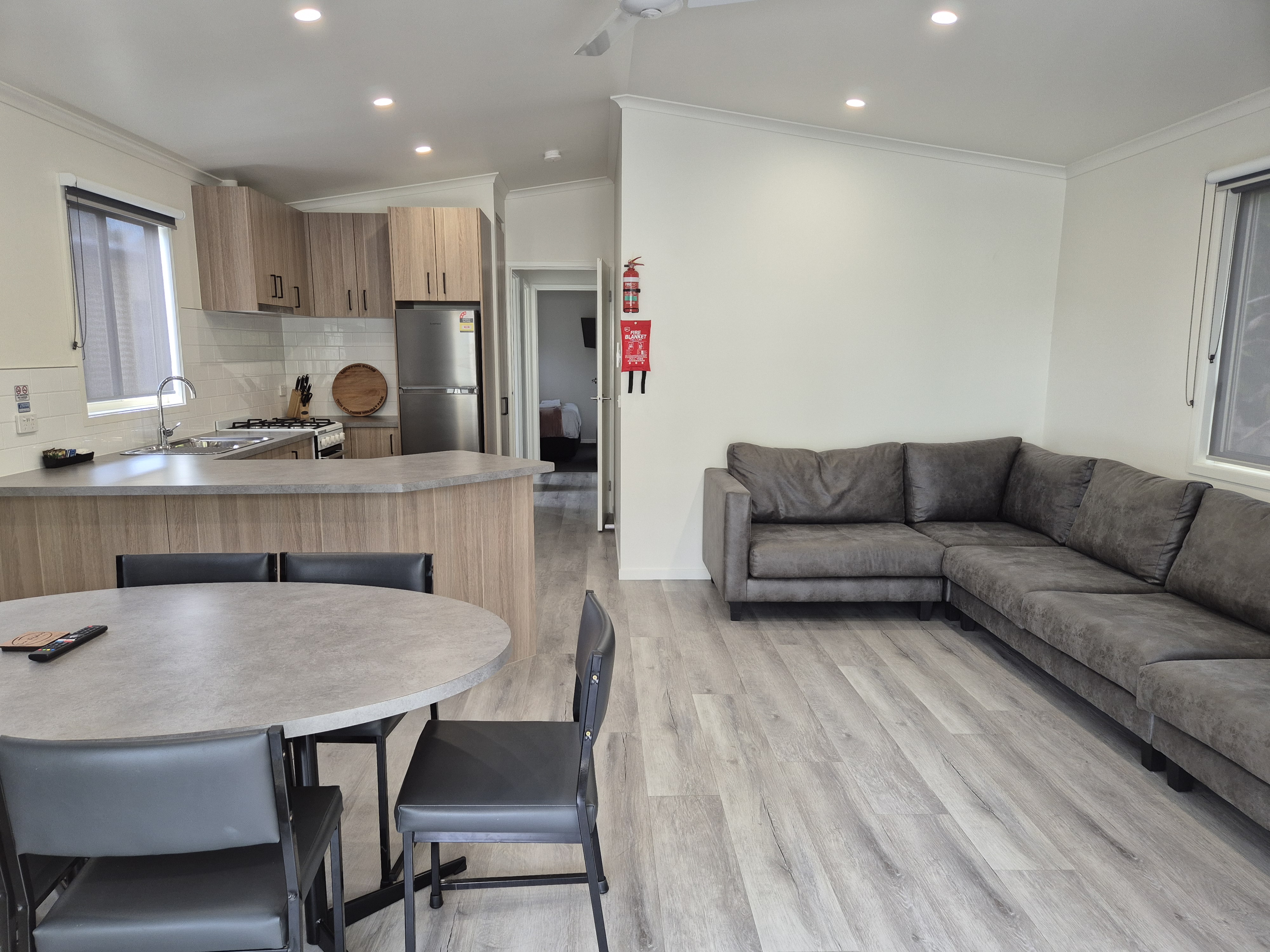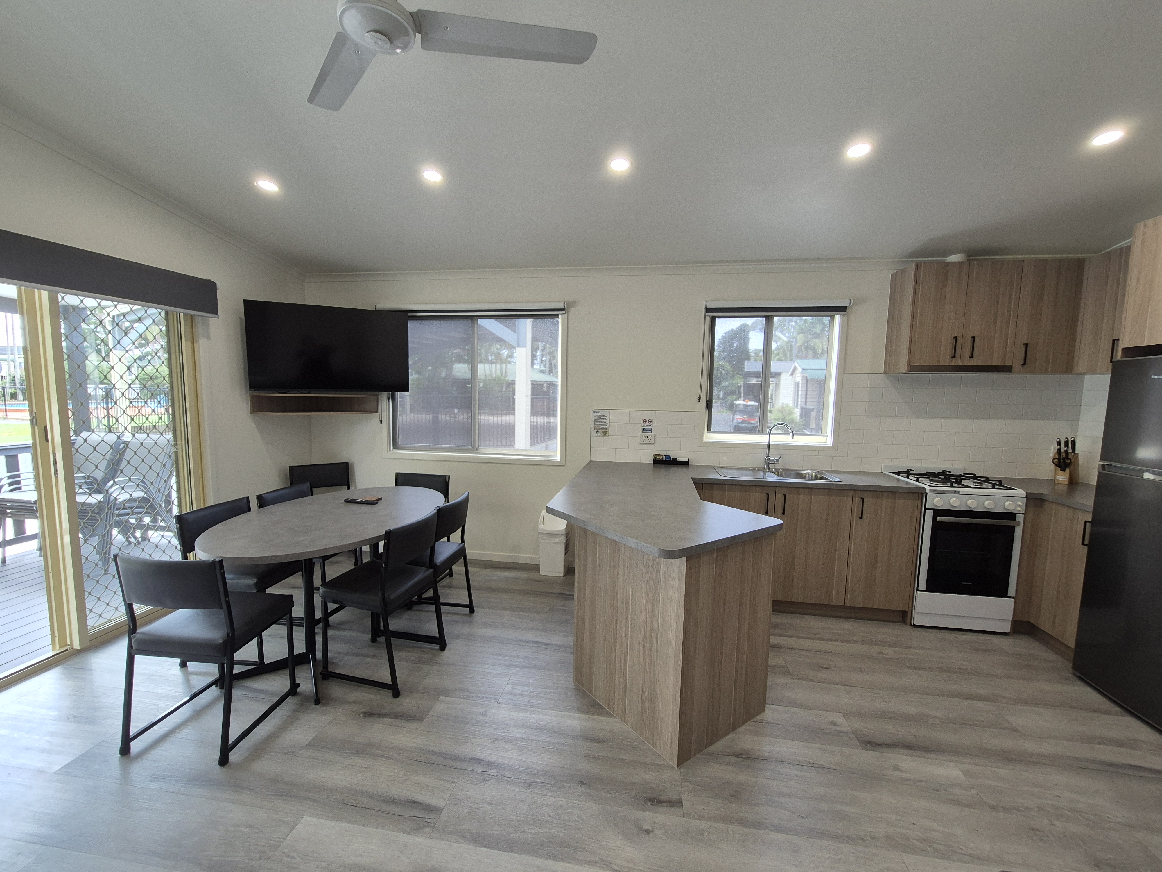 Large fully equipped kitchen, dining, lounge area including air conditioning. Cabin has an additional ensuite, with toilet in a separate room from shower.