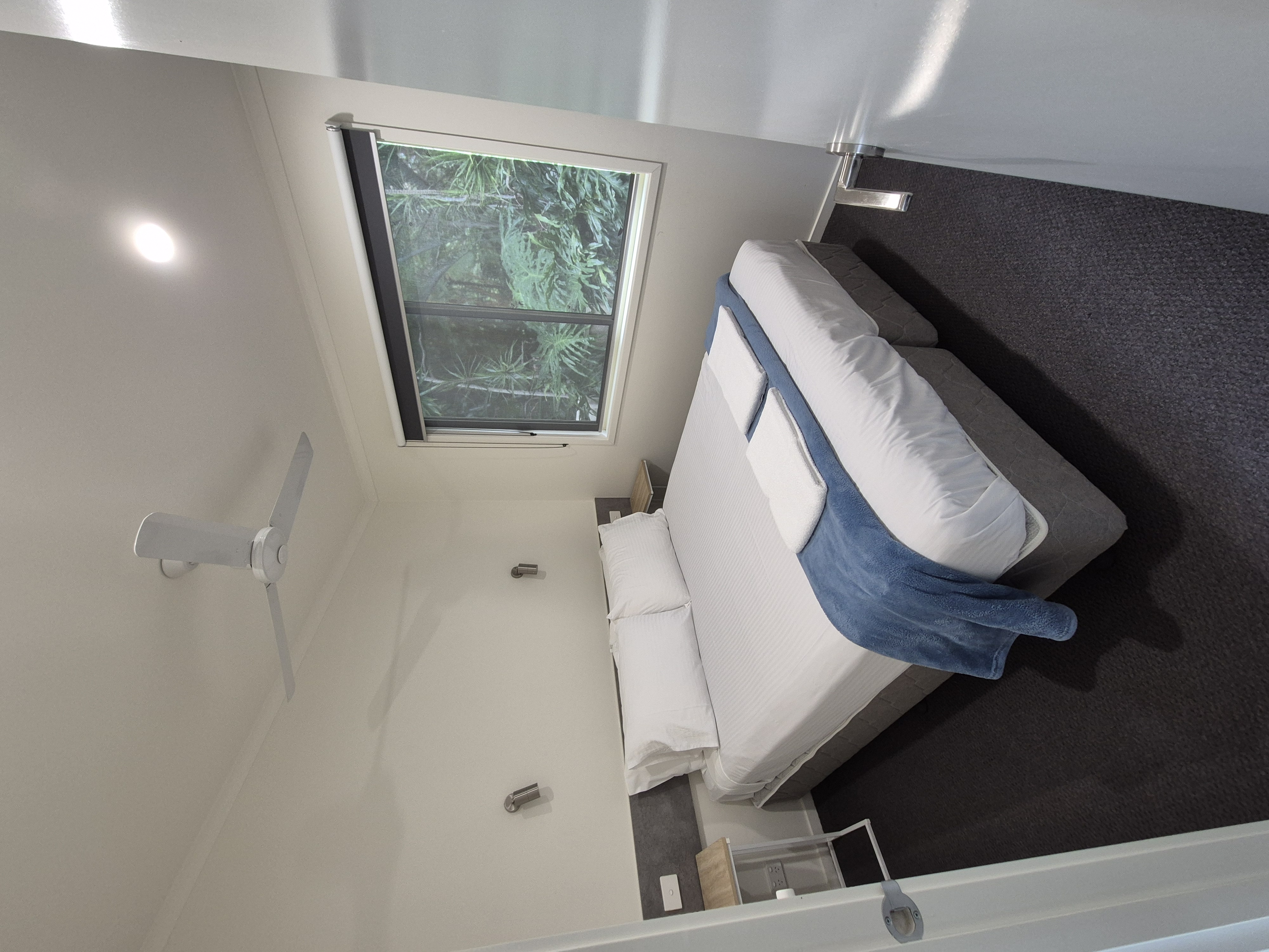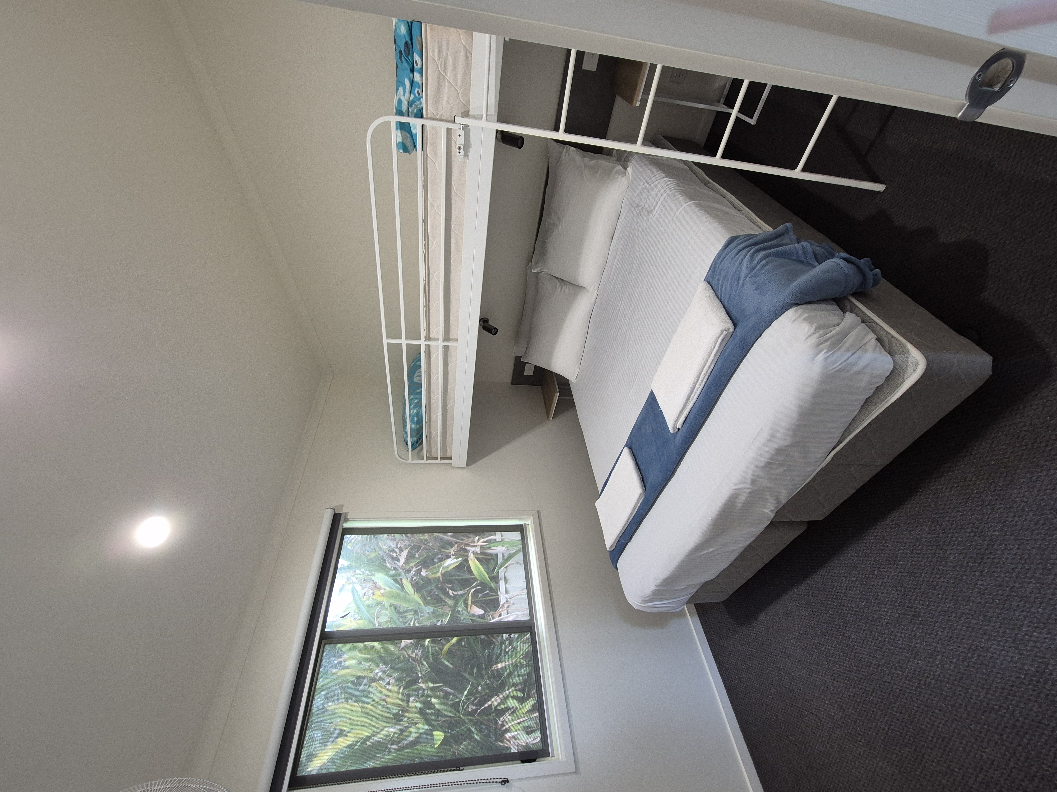 The deluxe 3 bedroom cabin has two bedrooms featuring a queen bed, and a double bed with a single overhead in the third bedroom.