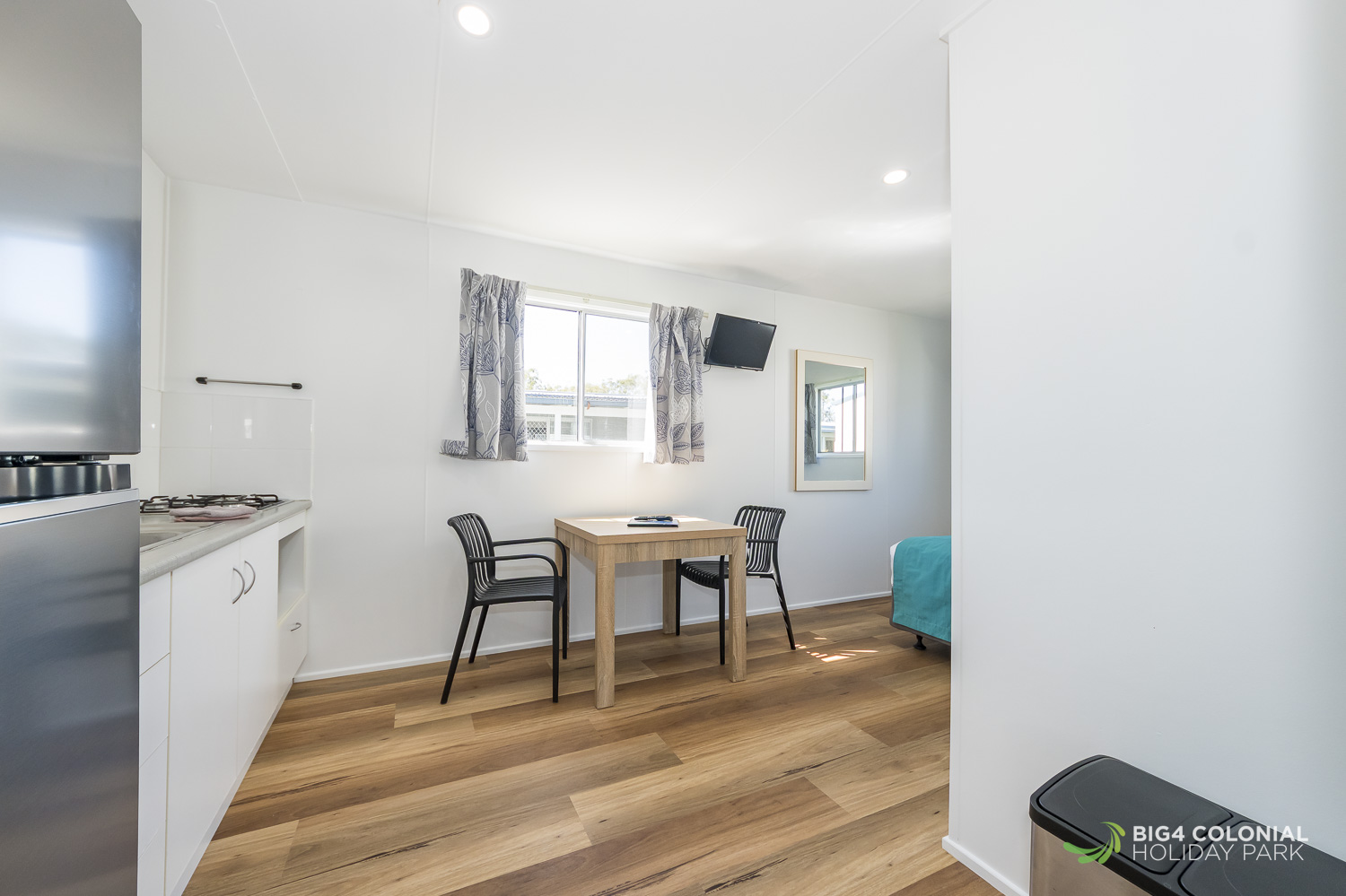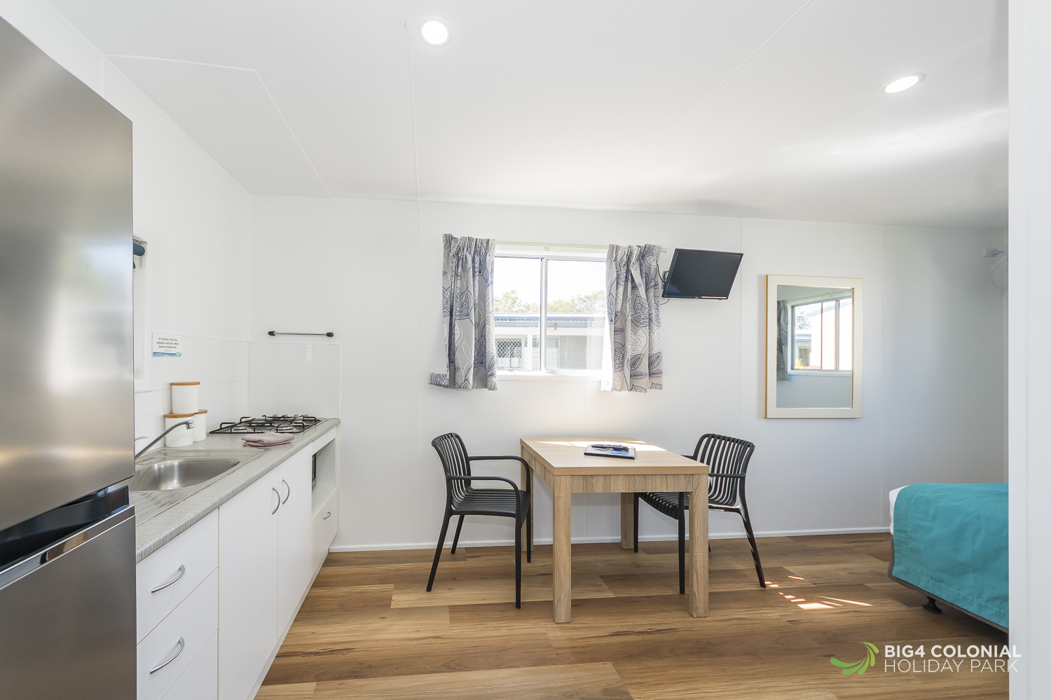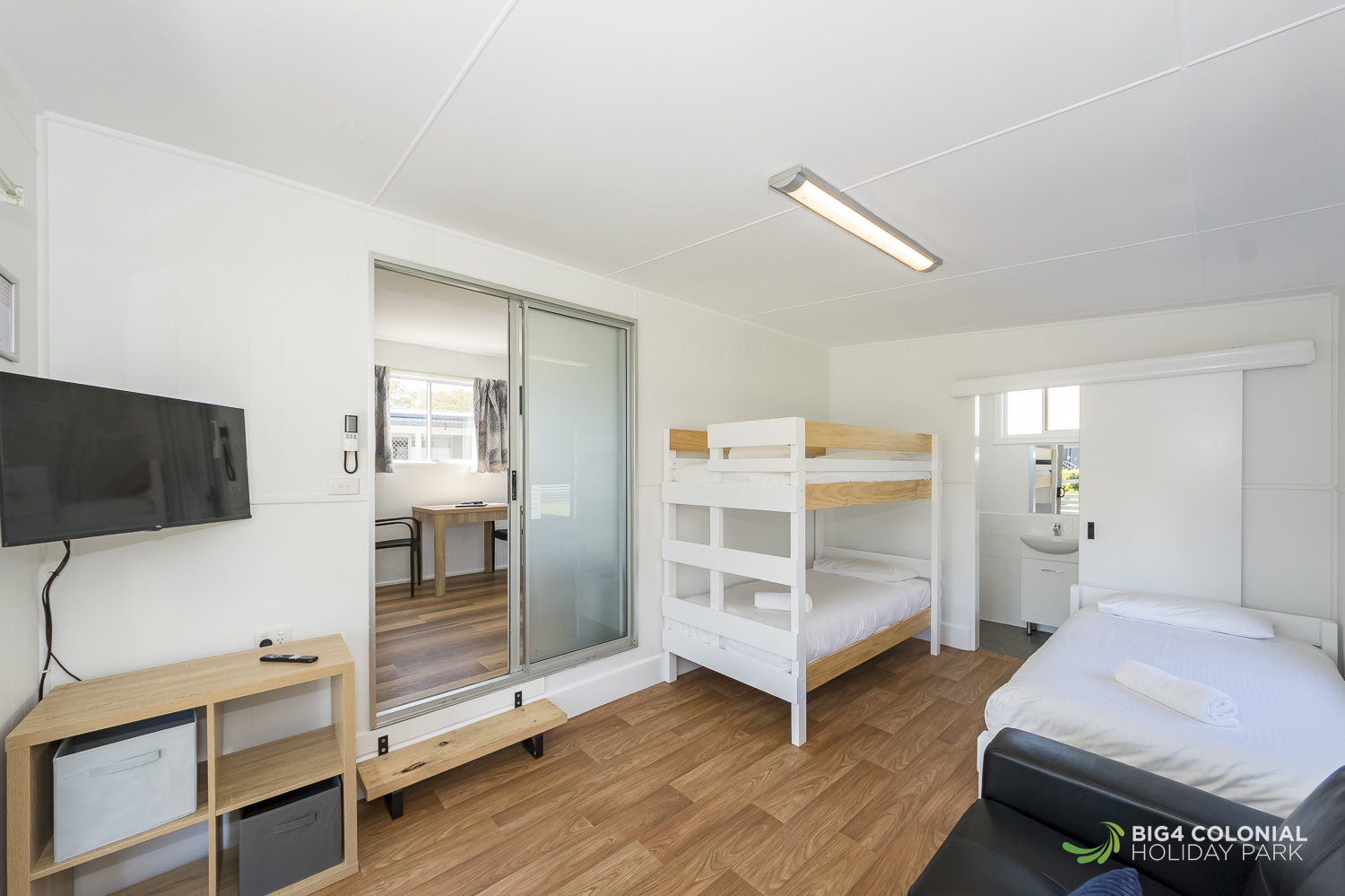 These classic cabins feature two open-plan rooms with an ensuite bathroom. Room 1 includes a kitchen, dining area, queen bed, and a TV. The kitchen comes equipped with a fridge/freezer, gas cooktop, microwave, kettle, toaster, pots, pans, and cooking utensils. Room 2 has two single bunks, one single bed, and a lounge area with a TV.