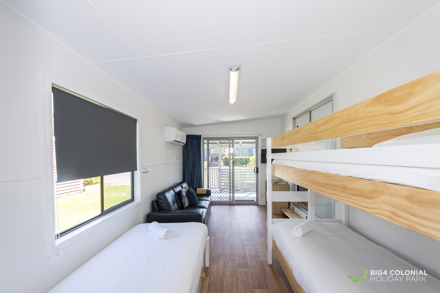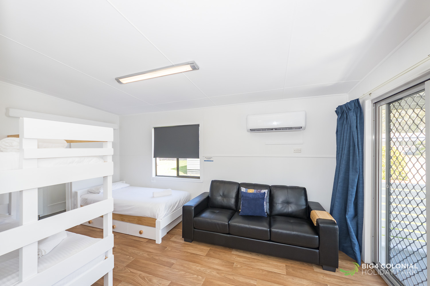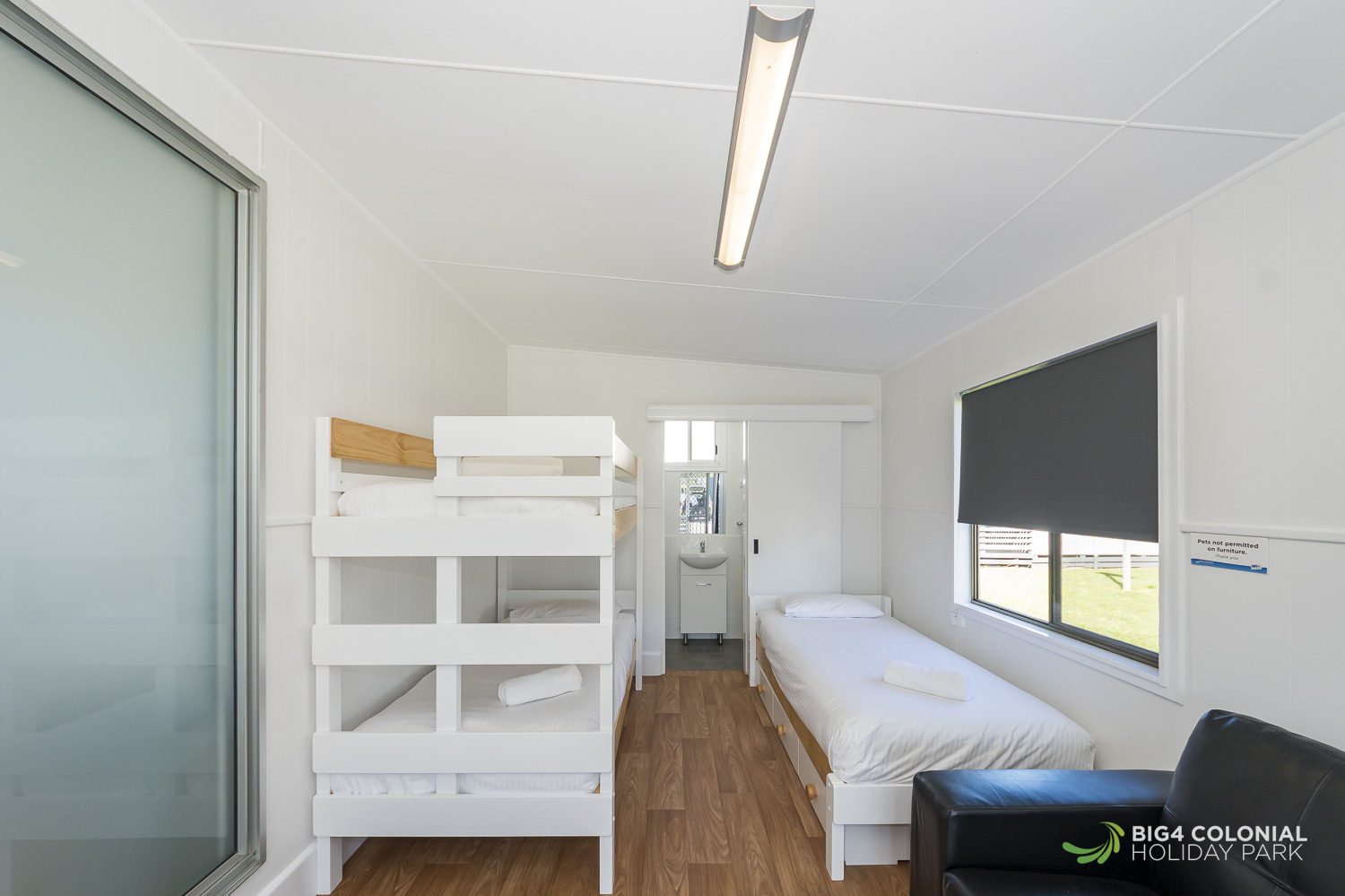Please note, this cabin does not have the privacy of bedrooms - it is open plan and there are two internal steps between the rooms. The ensuite off Room 2 includes a shower, toilet, and sink.
