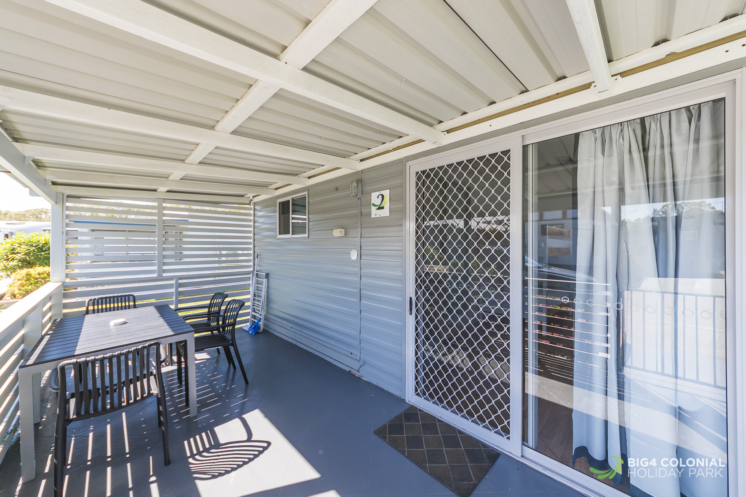 The spacious, secure verandah has a gate, making it ideal for pets and kids. It features an outdoor picnic table and parking for one vehicle at the front.