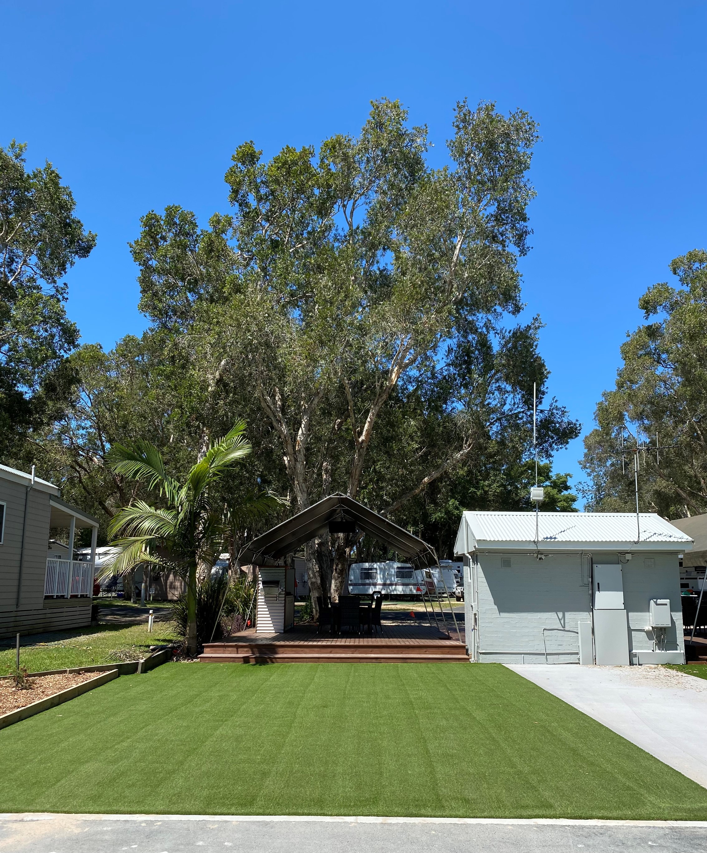 Extra space and privacy are yours when staying in your caravan, campervan or motorhome on one of our Premium Ensuite Sites. Stay on an artificial grass surface sized 8.5m x 10m and access a private bathroom, sullage, power and a slab, as well as added extras like an undercover entertaining deck, kitchenette, and TV.