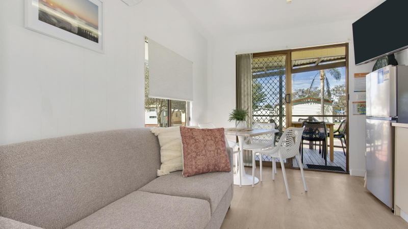 Enjoy a comfortable and relaxing stay. Our 1 Bedroom Standard Cabins sleep up to four guests with a double bed in the main bedroom and a bunk in the hall, as well as a bathroom, living area, kitchen, and private deck.