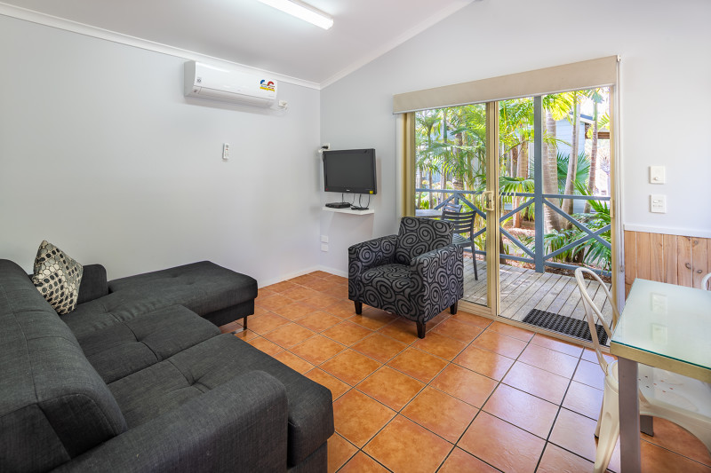 Experience a stay amongst tropical gardens. Our Bangalow Cabins sleep up to four guests with a double bed in the main bedroom and a bunk bed in the second bedroom, as well as a bathroom, living area, kitchenette, and deck.