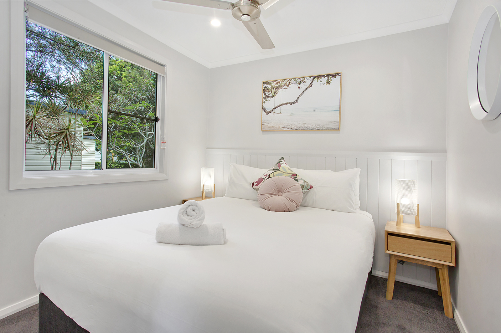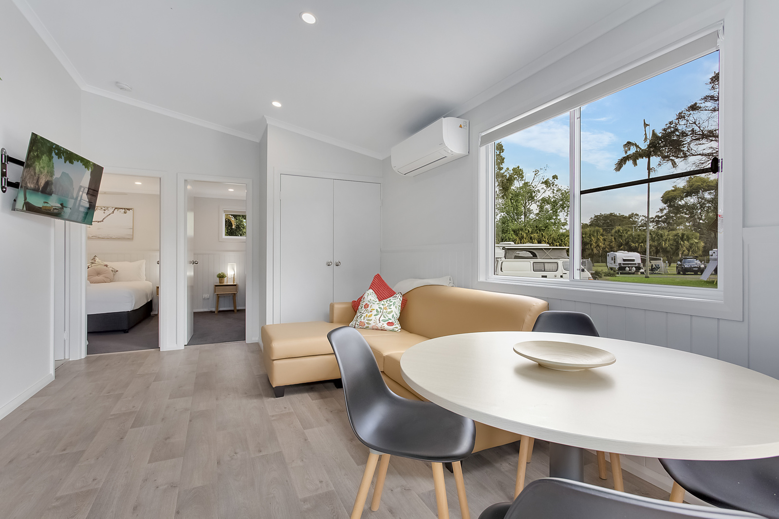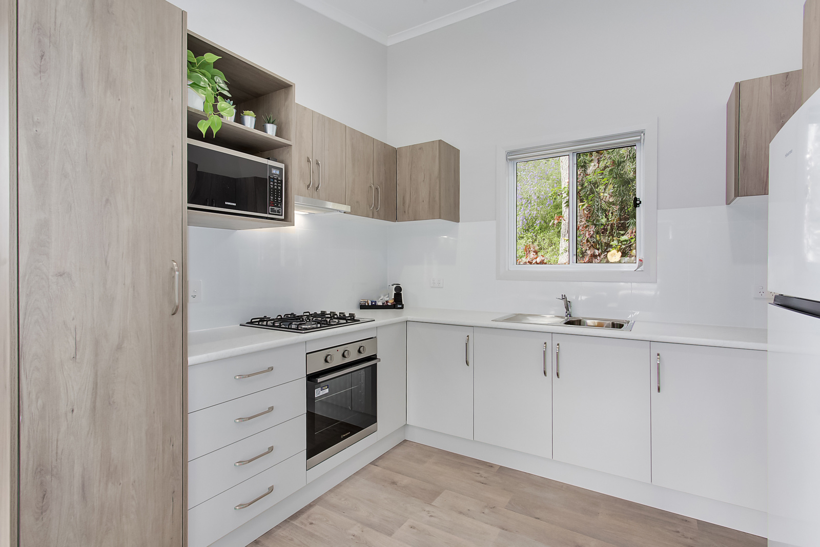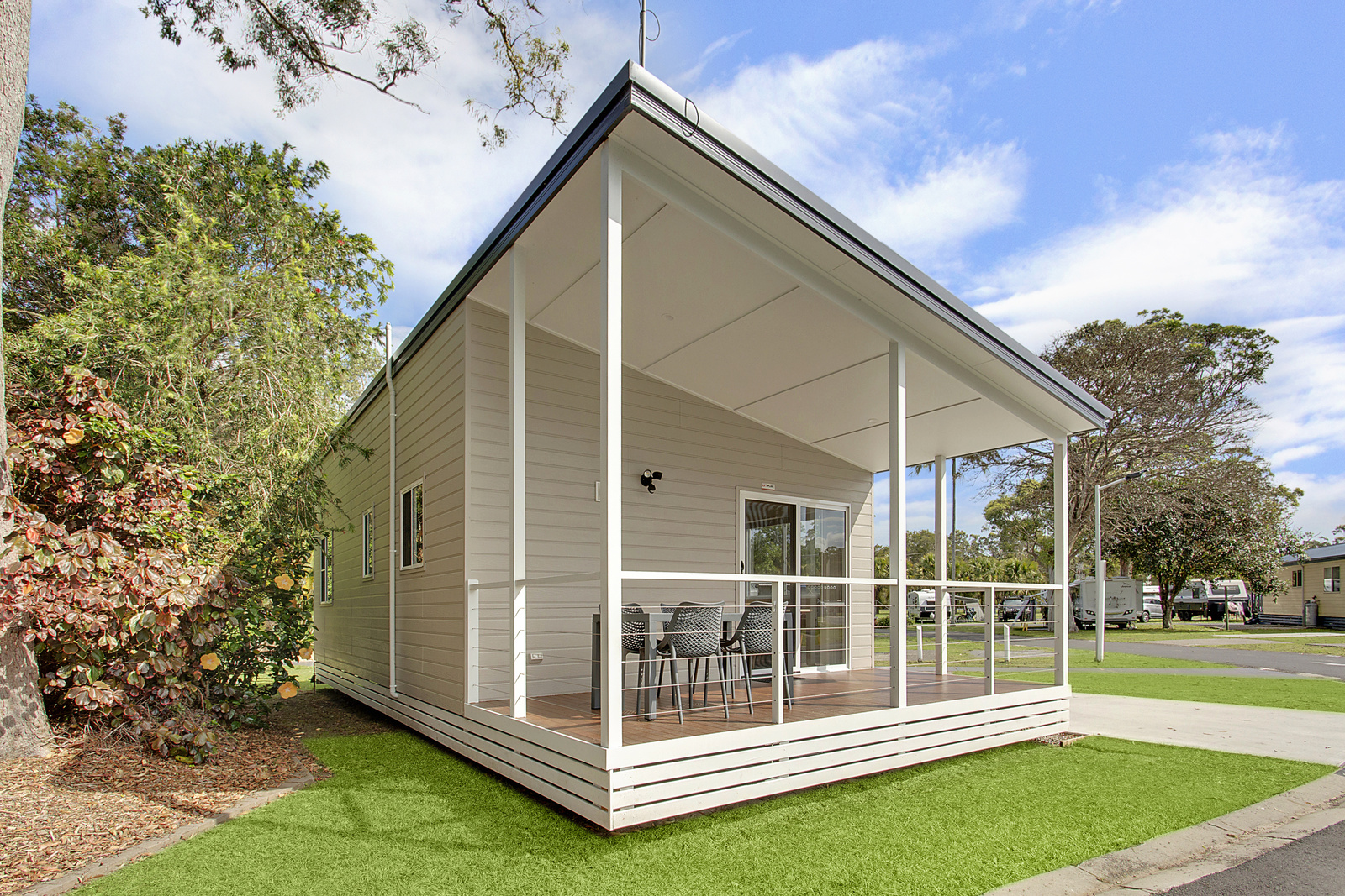 Experience a modern stay with plenty of privacy. Our 2 Bedroom Executive Cabins sleep up to four guests with a queen bed in the main bedroom and a bunk in the second bedroom, as well as a bathroom, living area, kitchen, an internal laundry and private deck.
