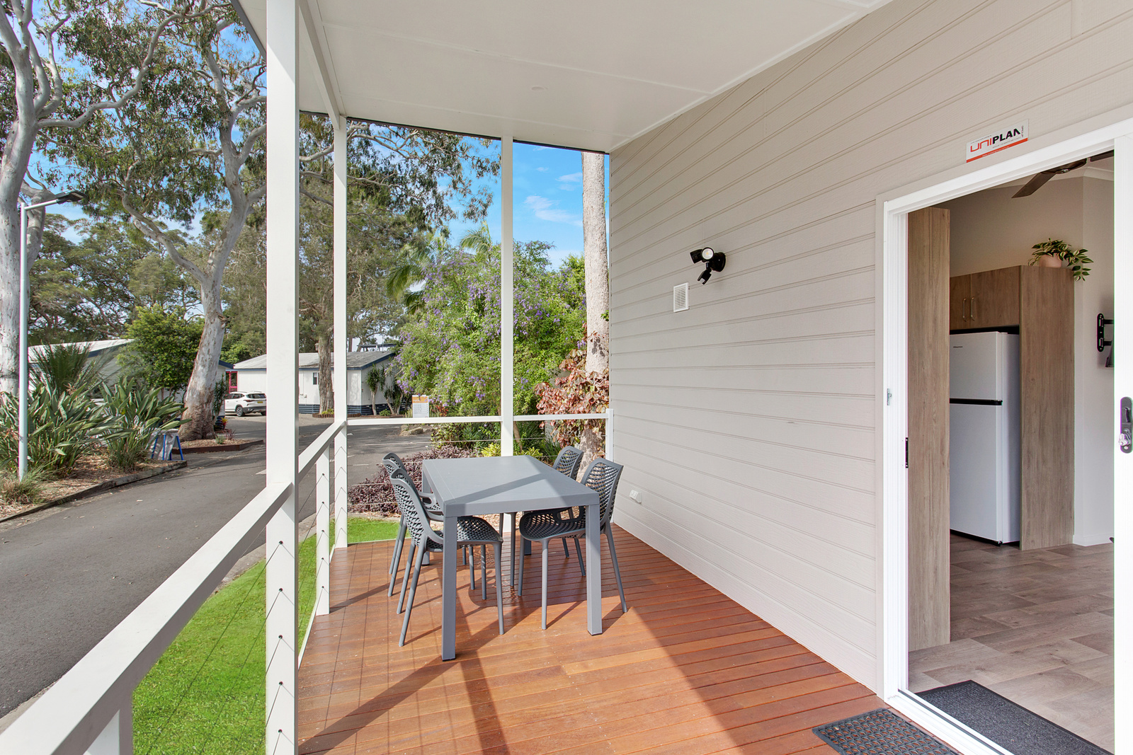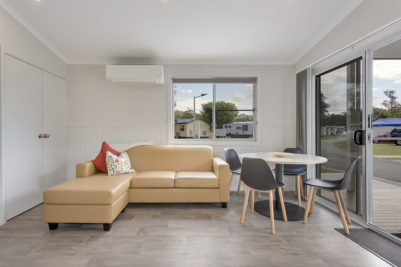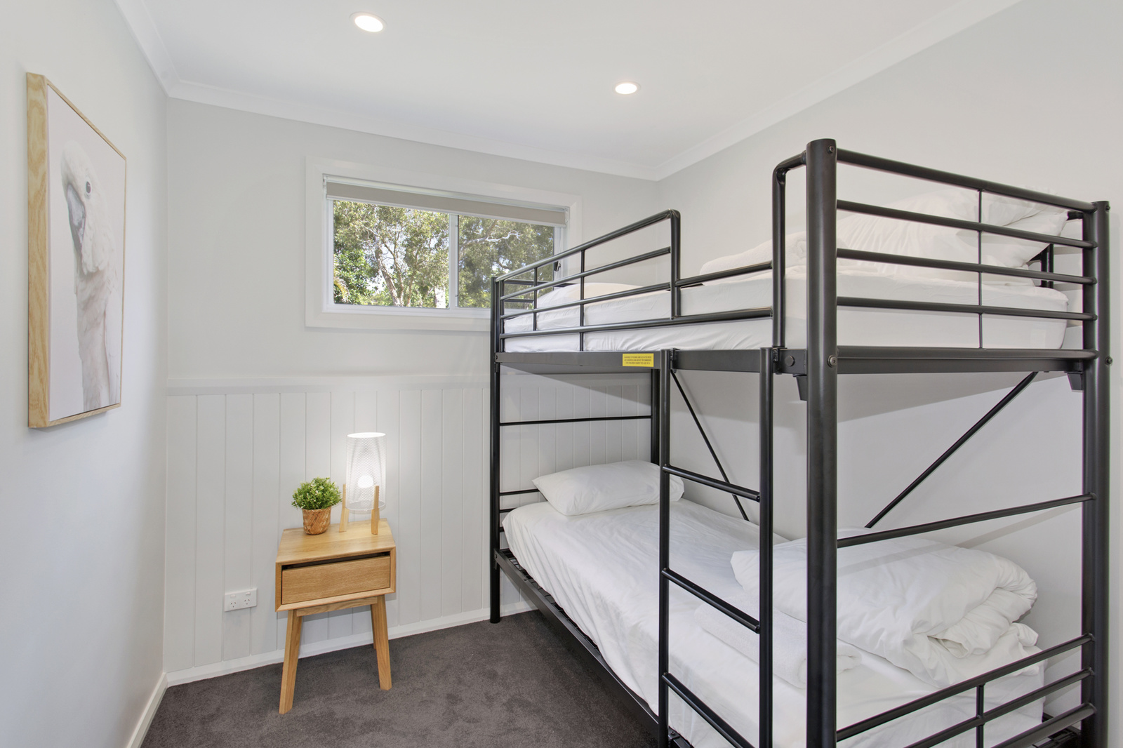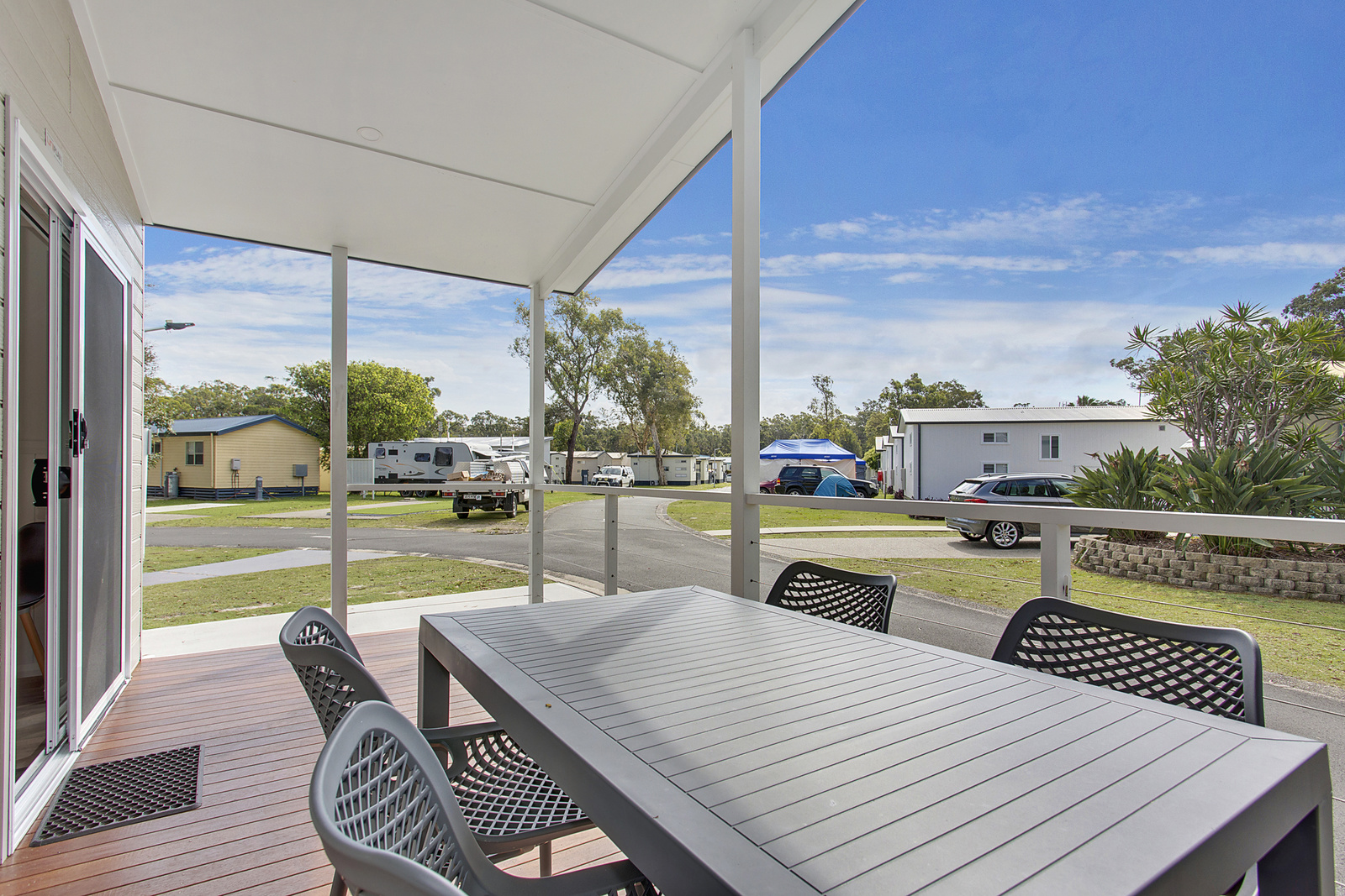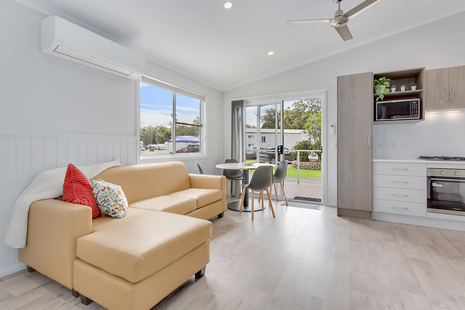 Experience a modern stay with plenty of privacy. Our 2 Bedroom Executive Cabins sleep up to four guests with a queen bed in the main bedroom and a bunk in the second bedroom, as well as a bathroom, living area, kitchen, an internal laundry and private deck.