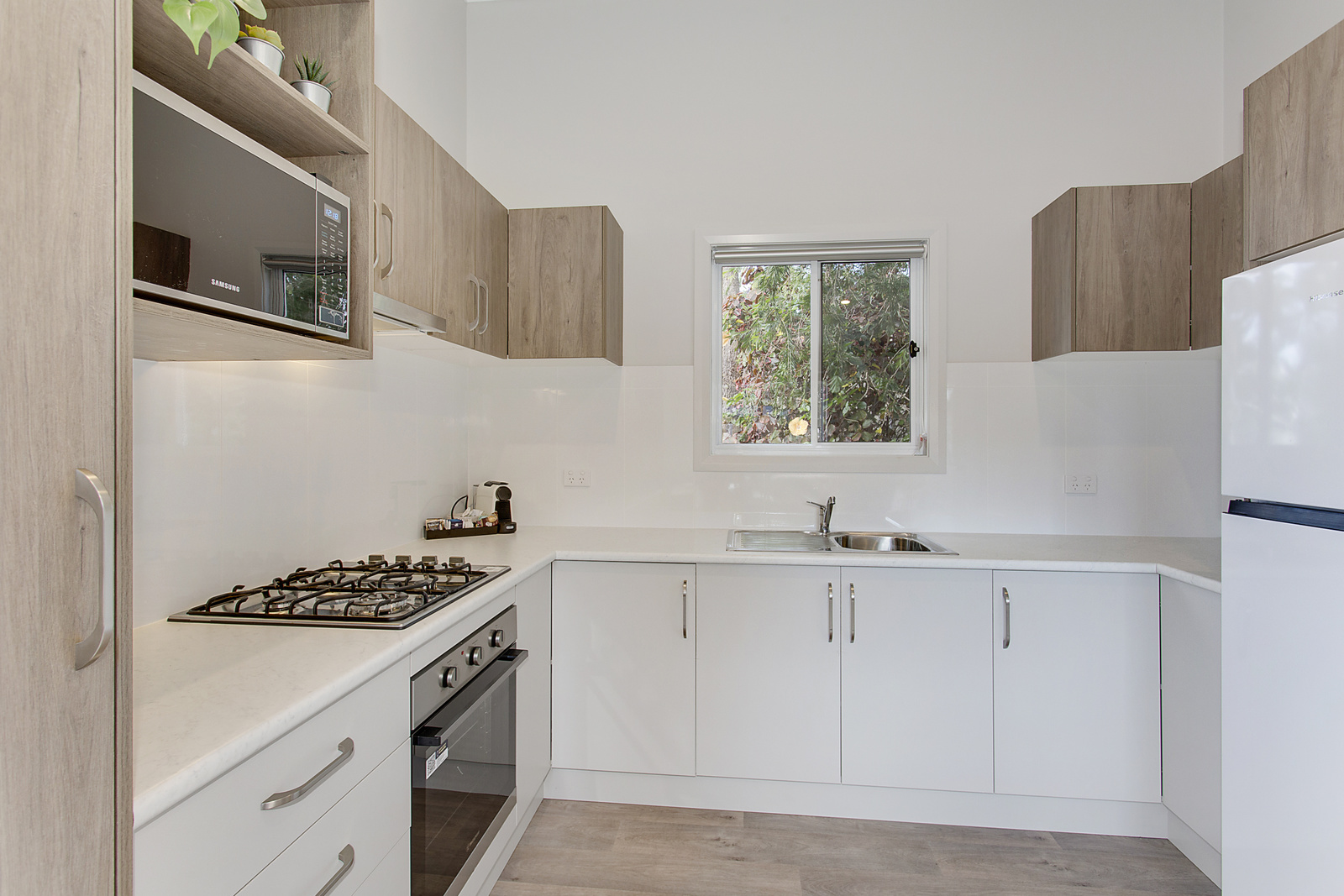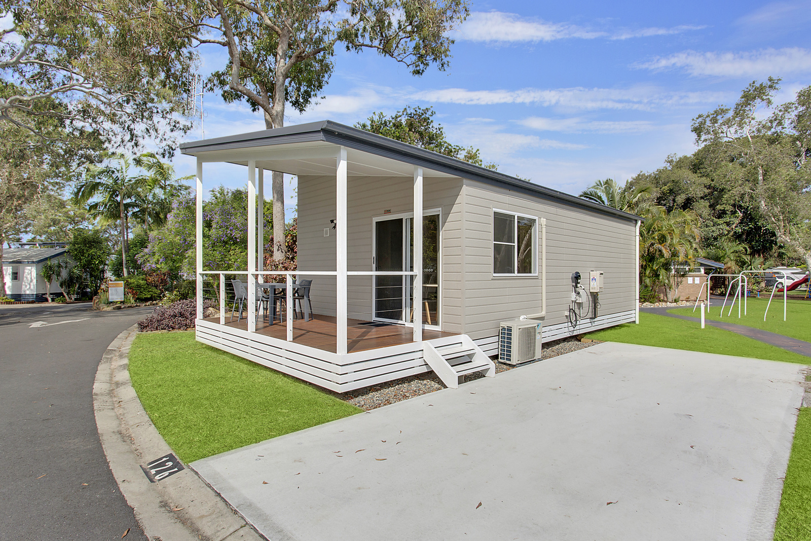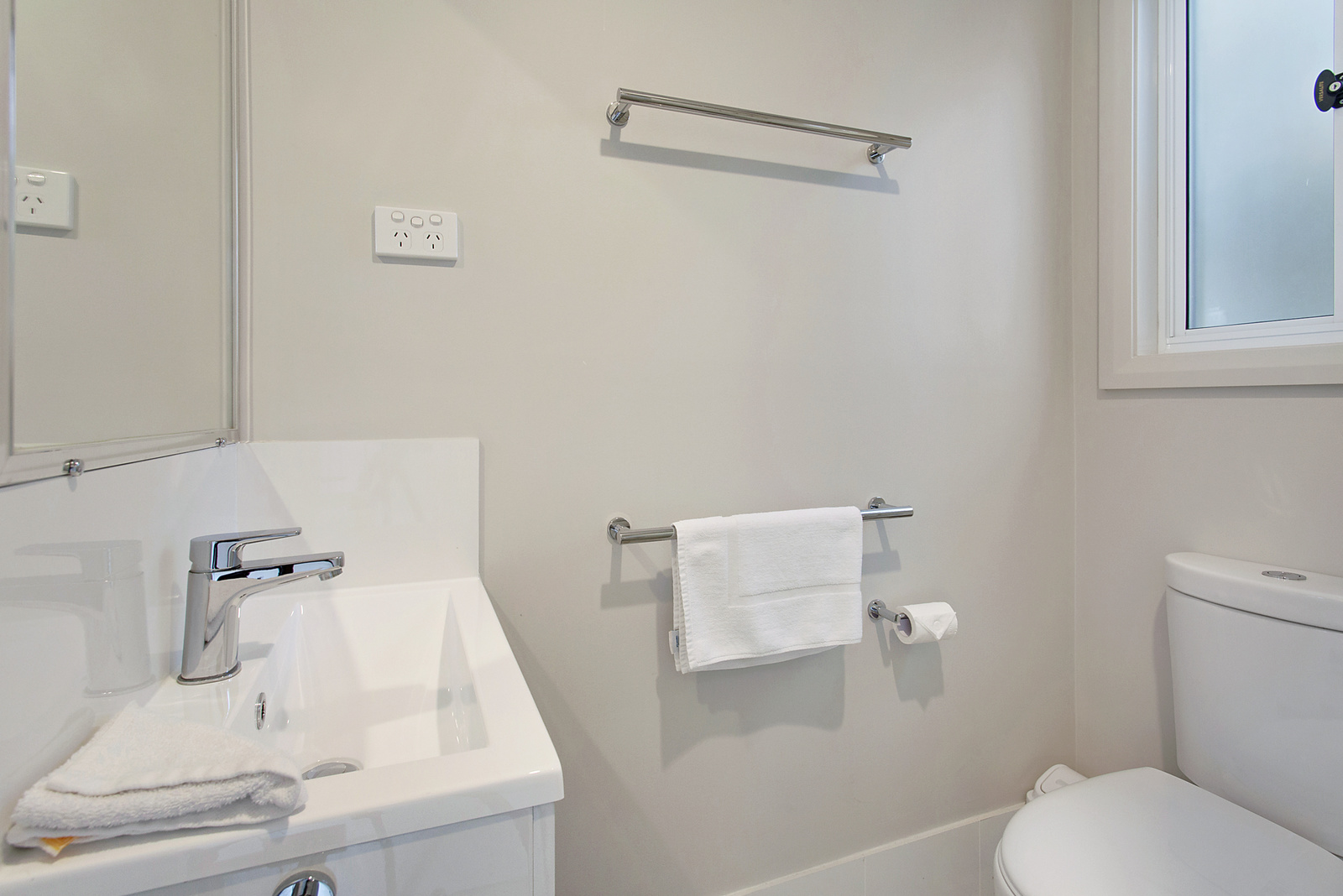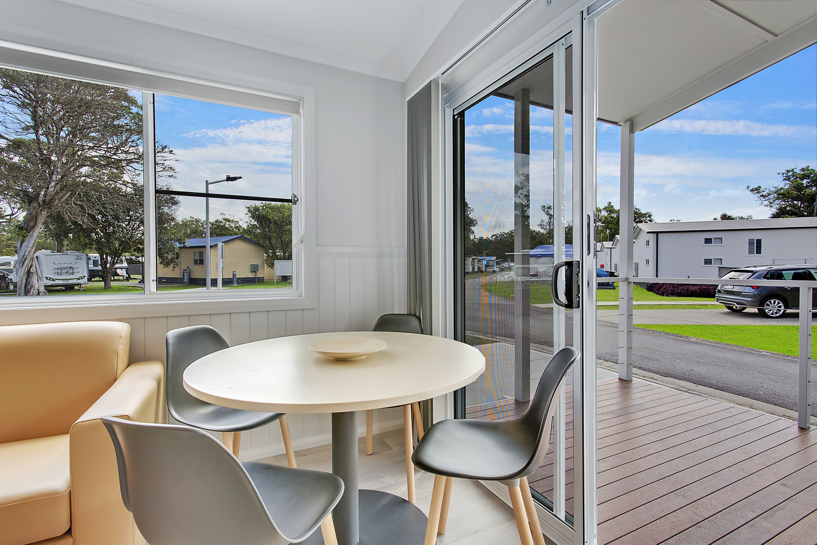 Experience a modern stay with plenty of privacy. Our 2 Bedroom Executive Cabins sleep up to four guests with a queen bed in the main bedroom and a bunk in the second bedroom, as well as a bathroom, living area, kitchen, an internal laundry and private deck.