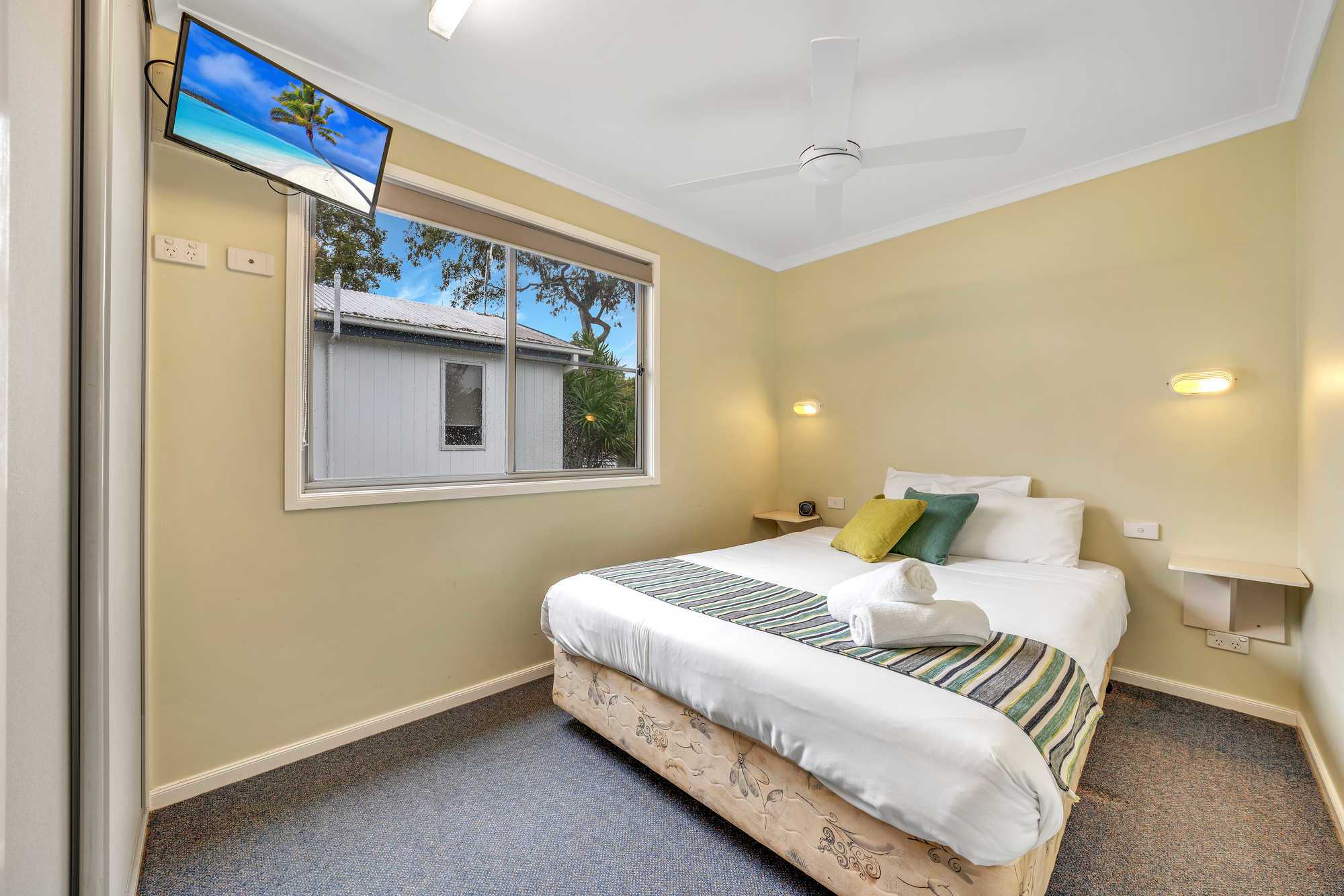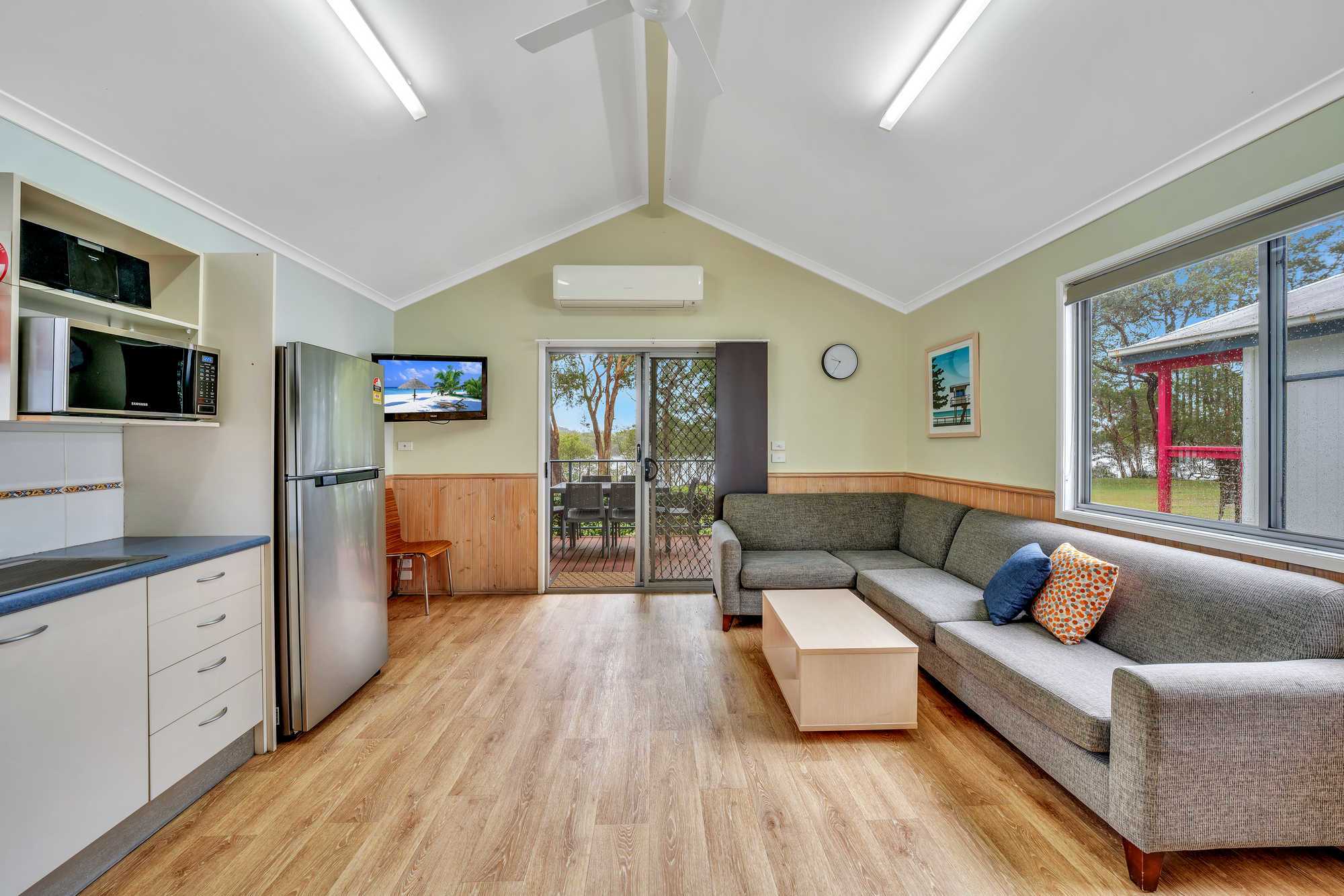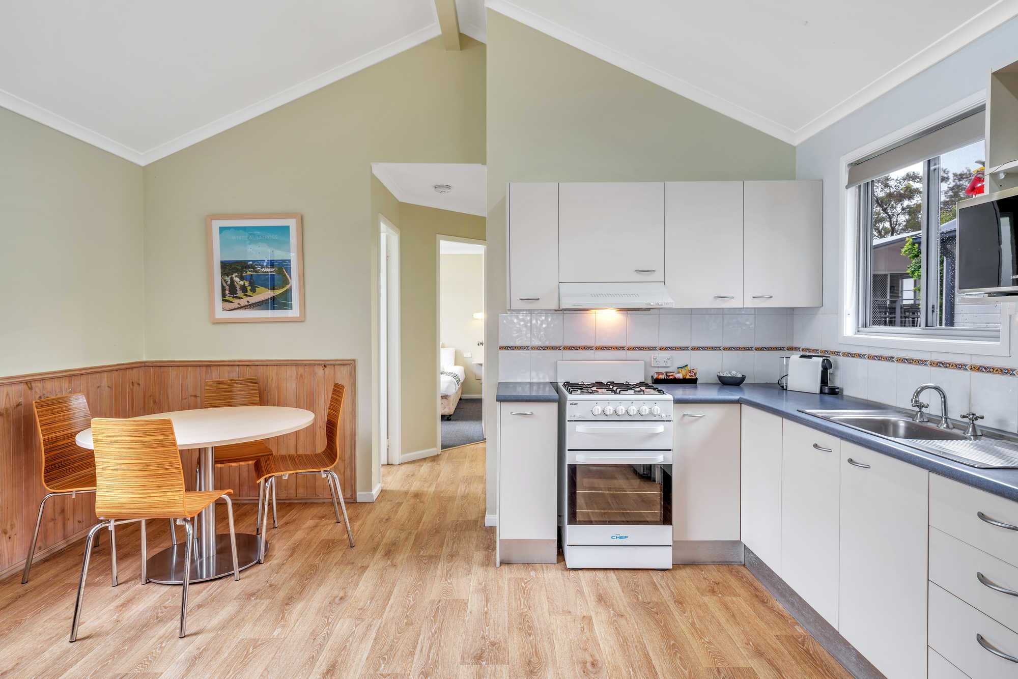 Enjoy a comfortable and spacious waterfront stay. Our Waterfront Villas sleep up to five guests with a queen bed in the main bedroom and either a bunk and single or two bunks in the second bedroom, as well as a bathroom, living area, kitchen, and outdoor deck with spectacular water views and a BBQ.