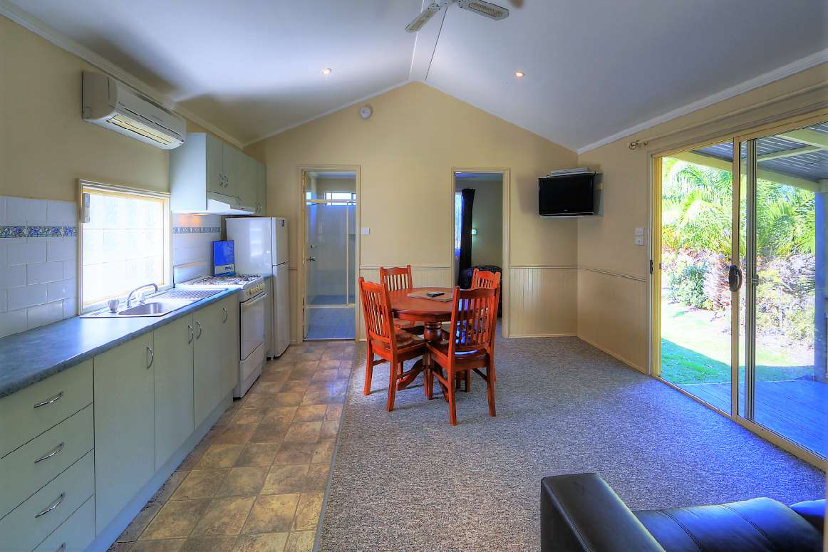 Inside you will find two bedrooms, a main bedroom with queen bed, two single beds in the second bedroom and a double foldout sofa bed in the living area. They have a bathroom with hairdryer, self contained kitchen with oven and full size fridge/freezer, dining table and lounge, flat screen TV, air conditioning and furnished deck with parking alongside.