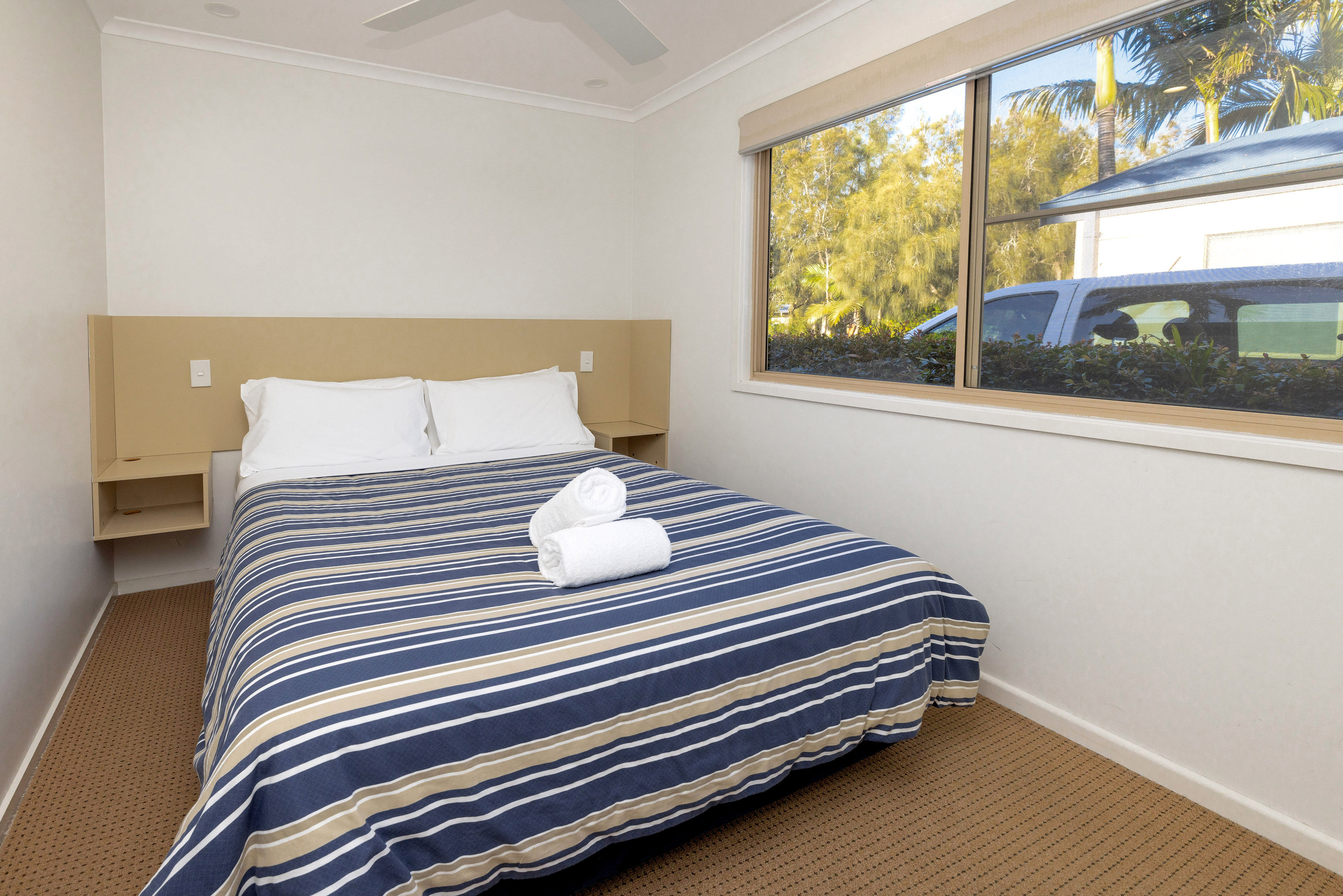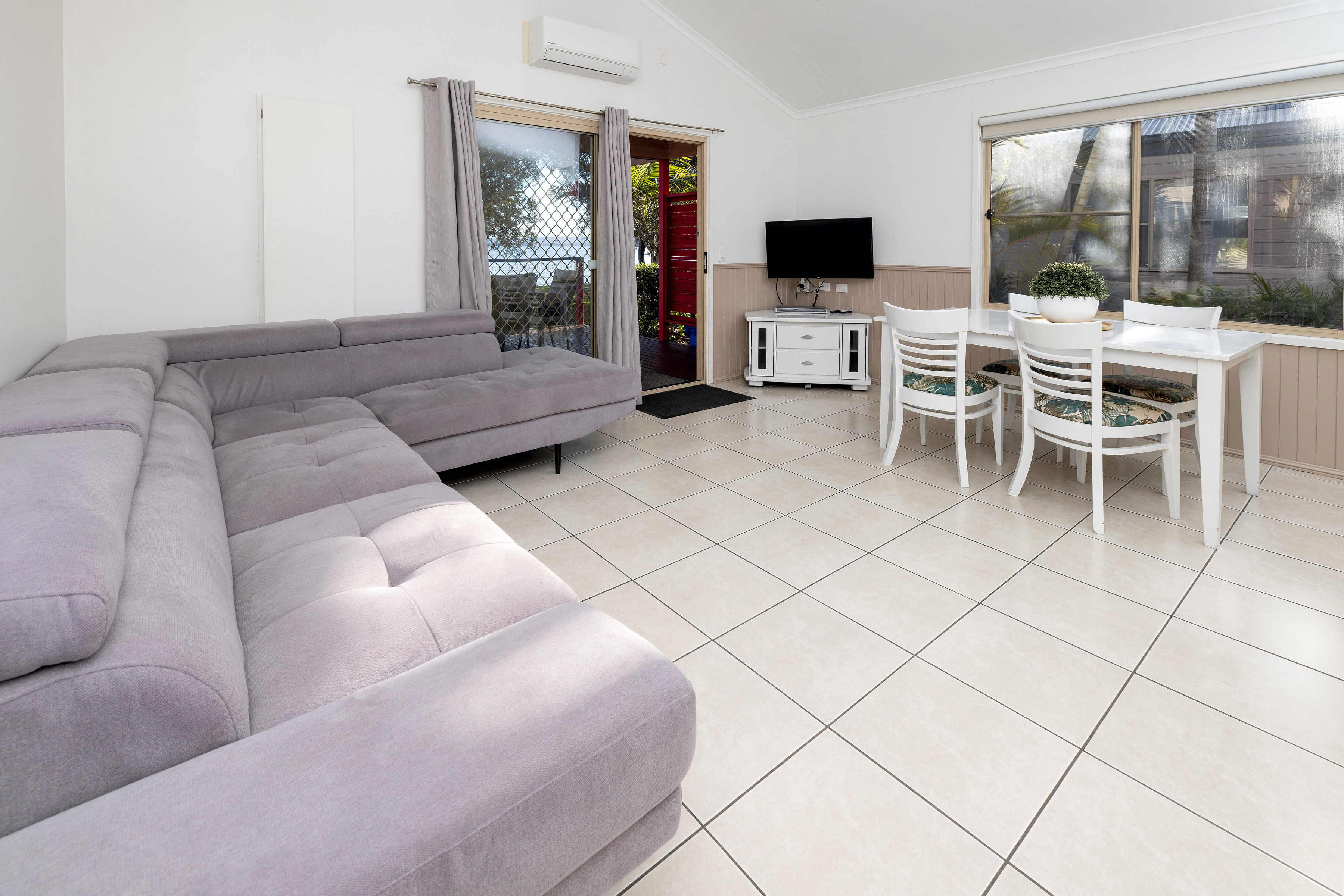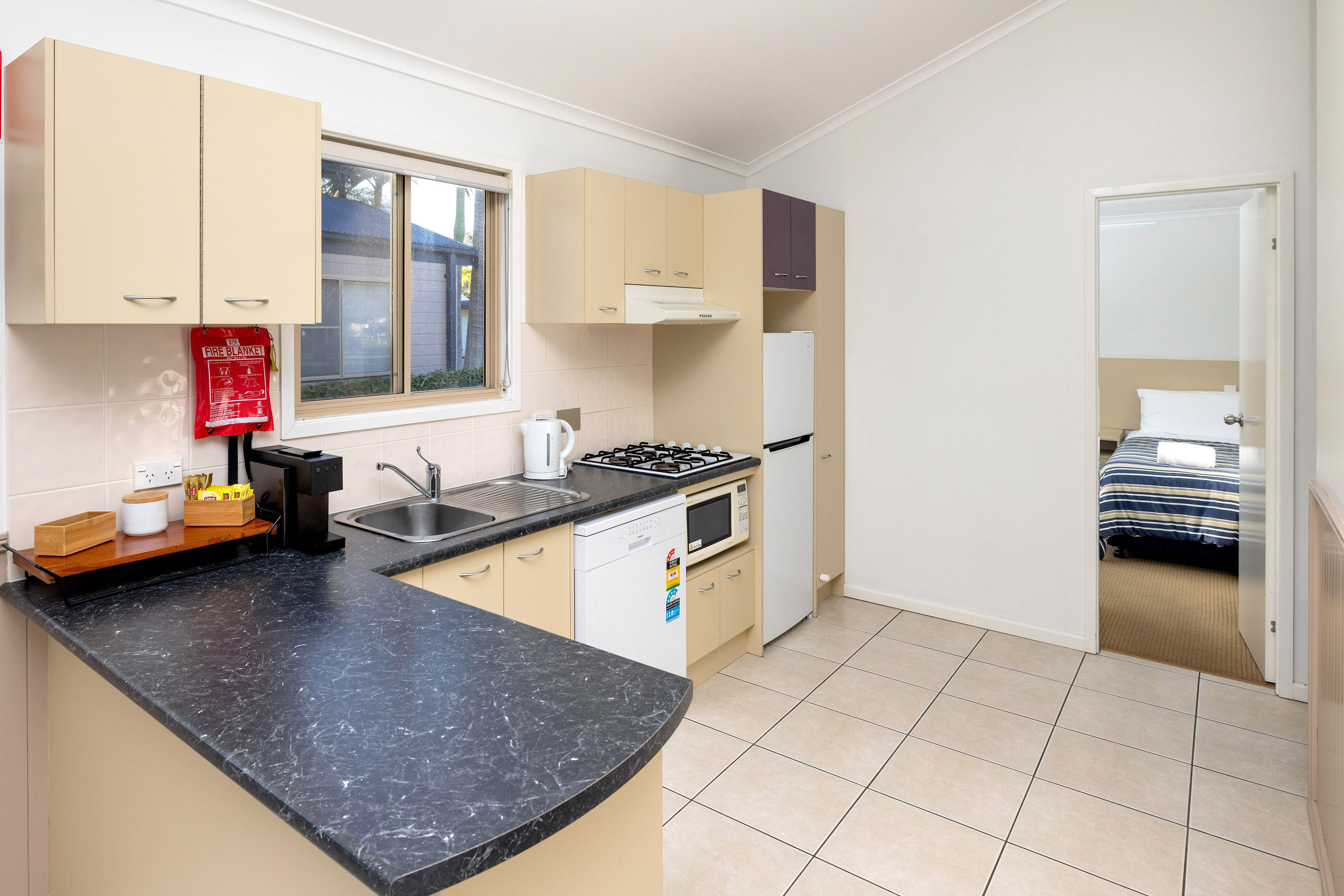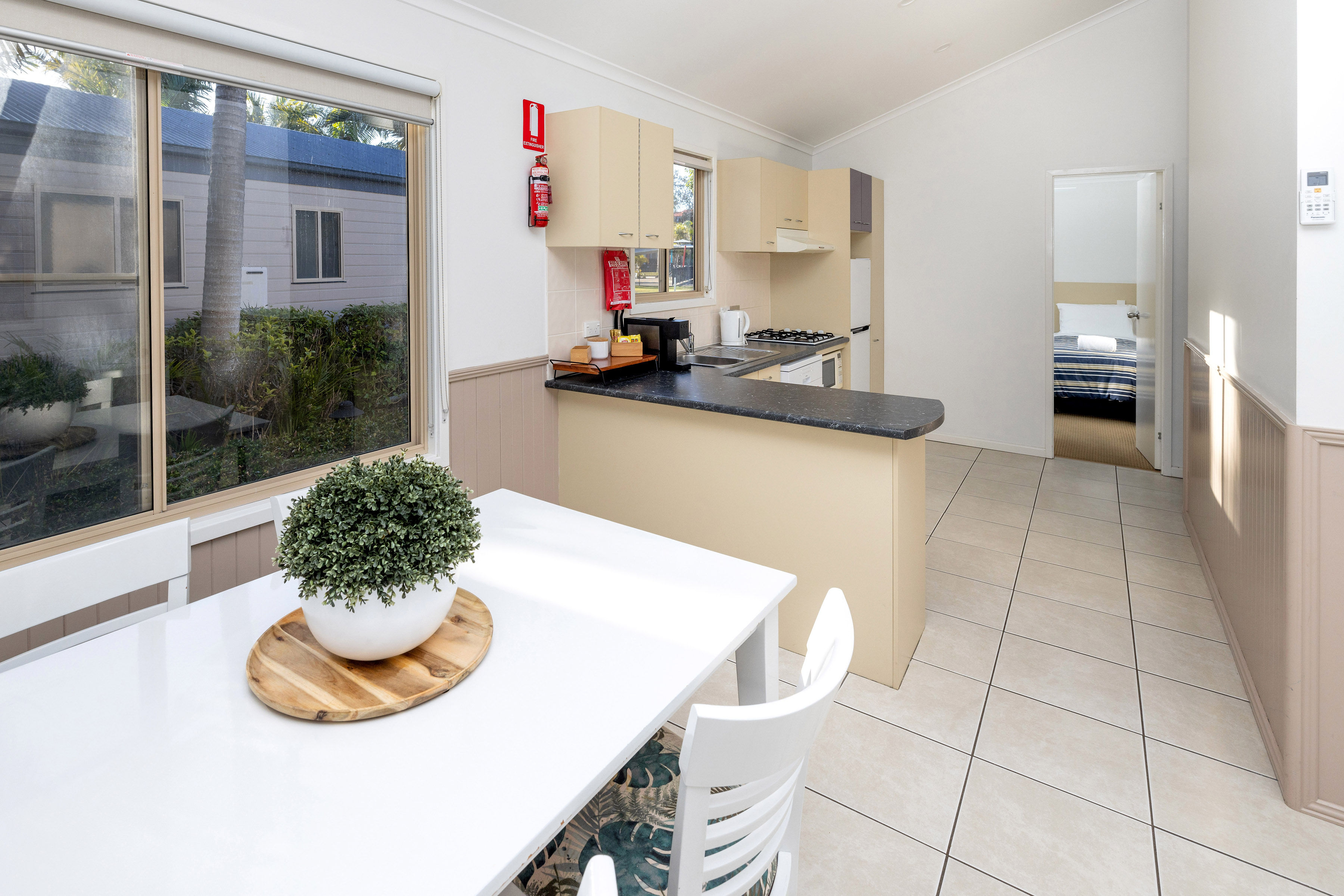Sleeping four, it includes a queen bed and two single beds. The spa bathroom adds comfort, while the open-plan living space offers a relaxed layout. The full kitchen features a stovetop, dishwasher, and fridge, making it easy to self-cater and entertain. Step outside to a private deck with a BBQ, perfect for relaxing and taking in the serene poolside atmosphere.