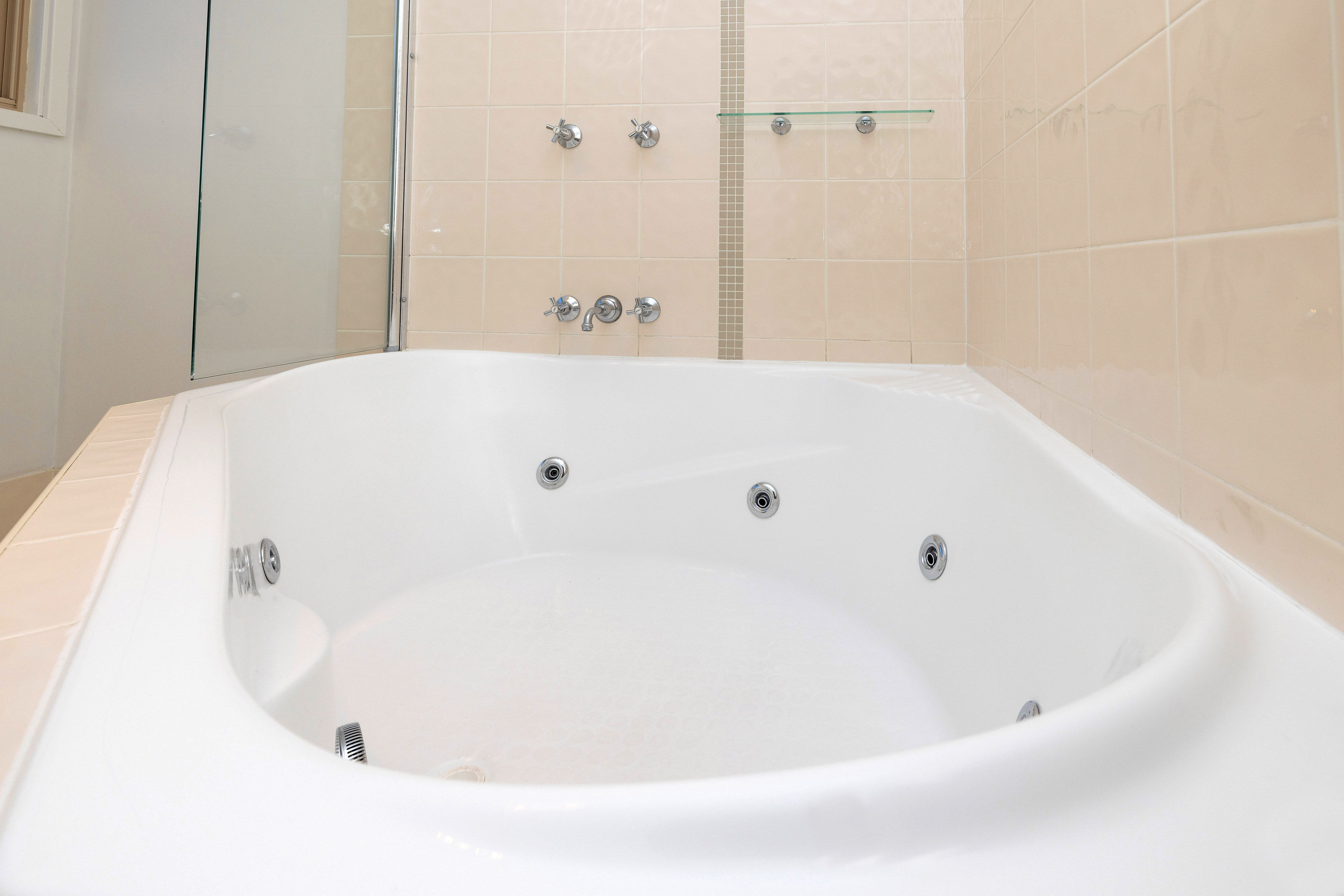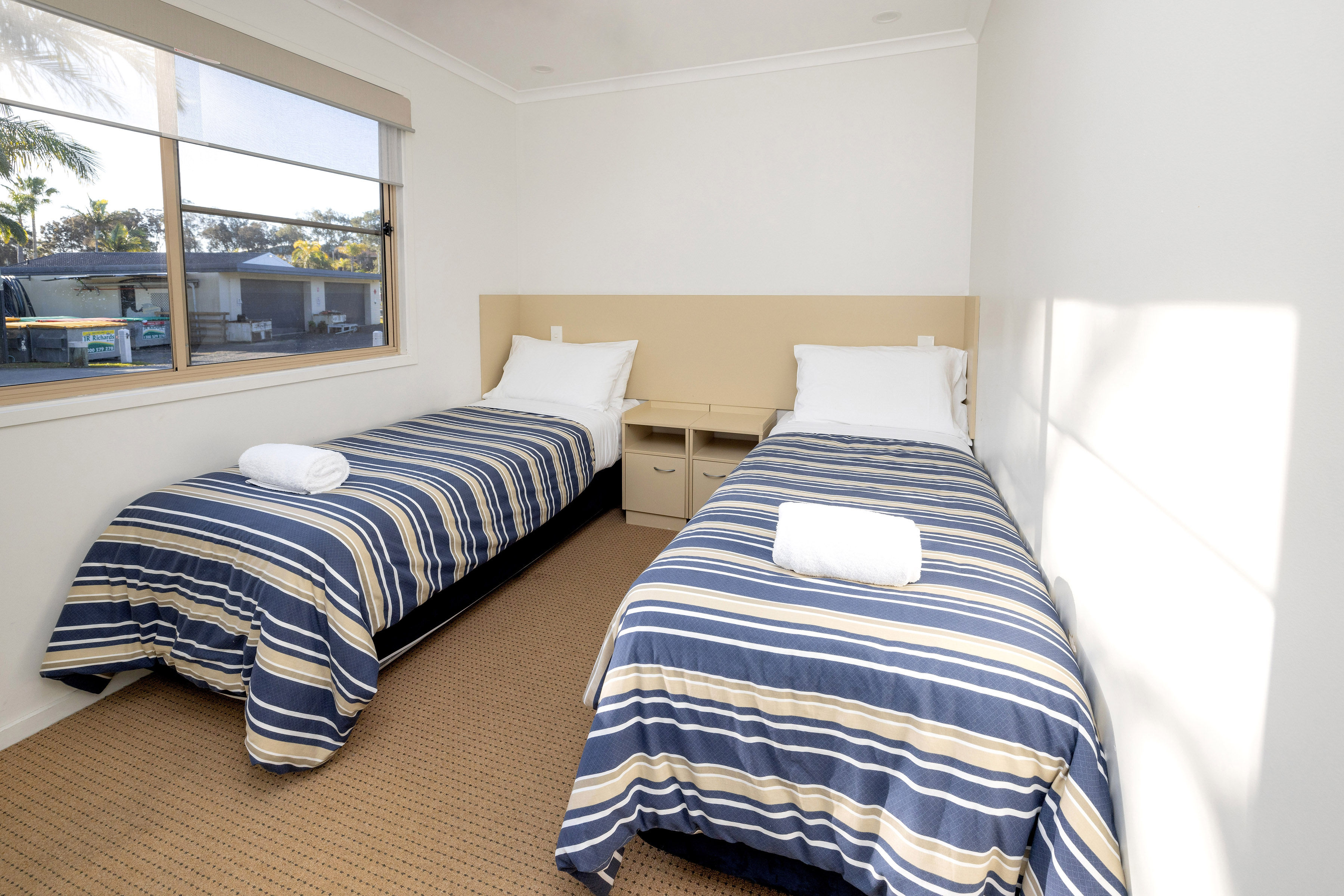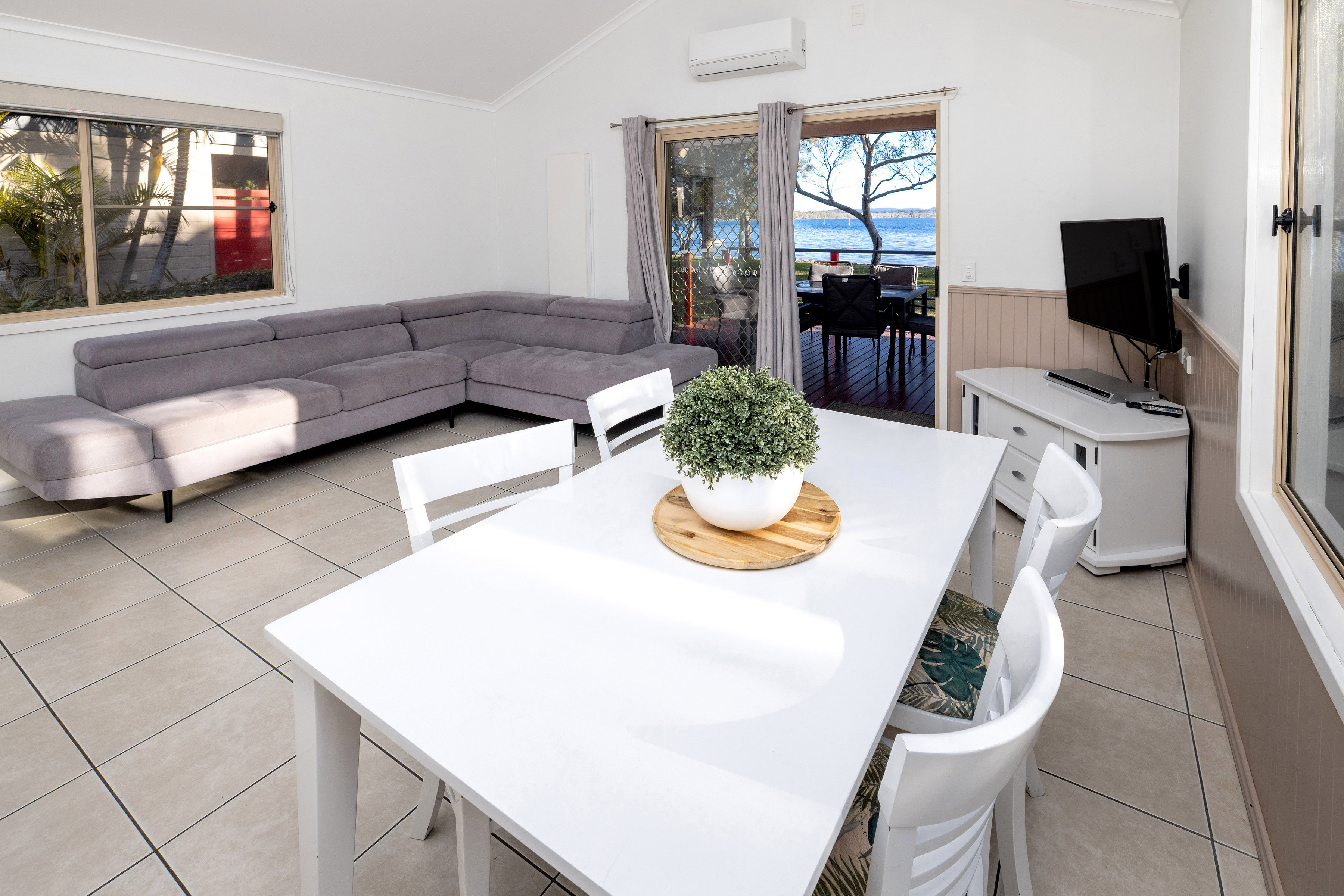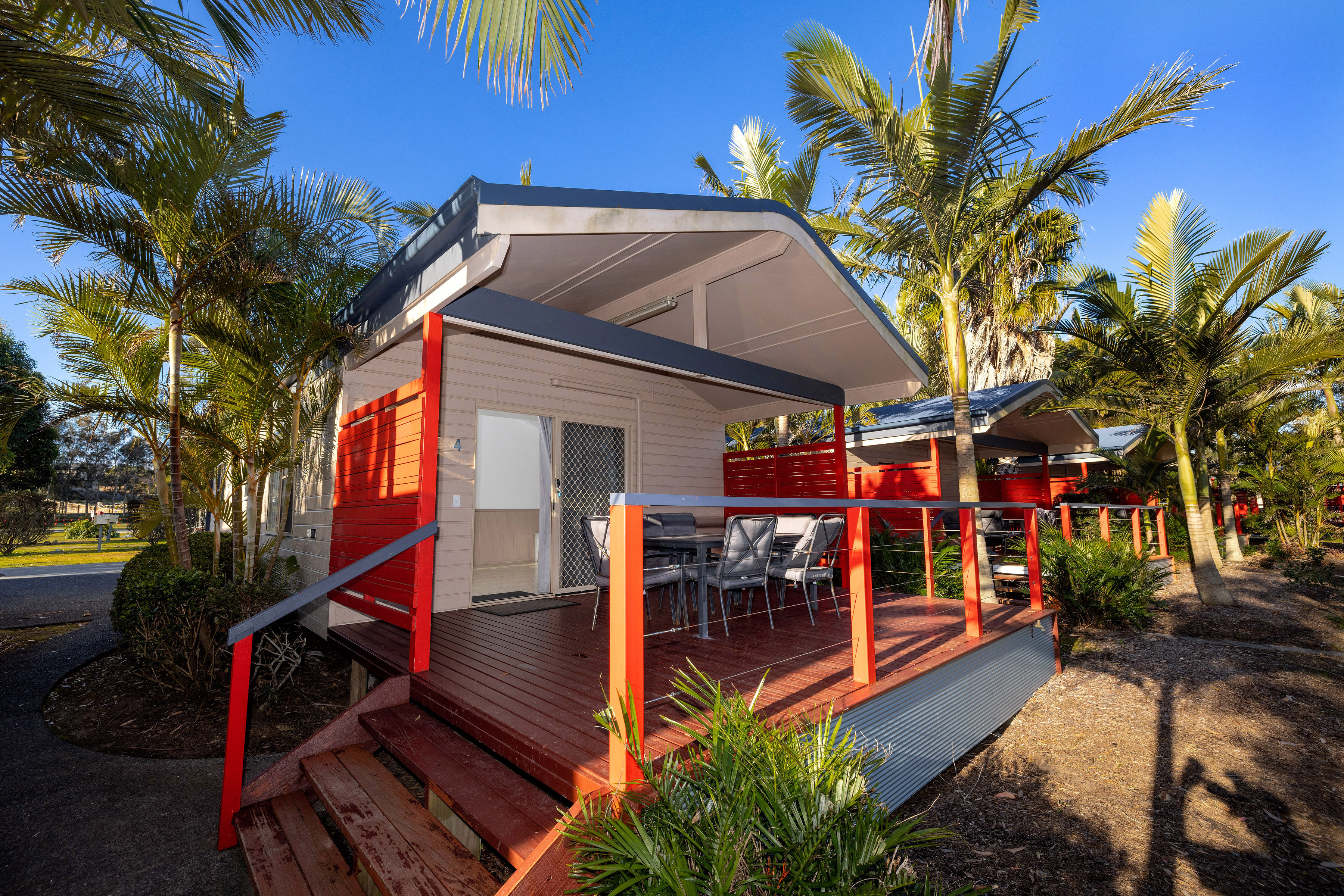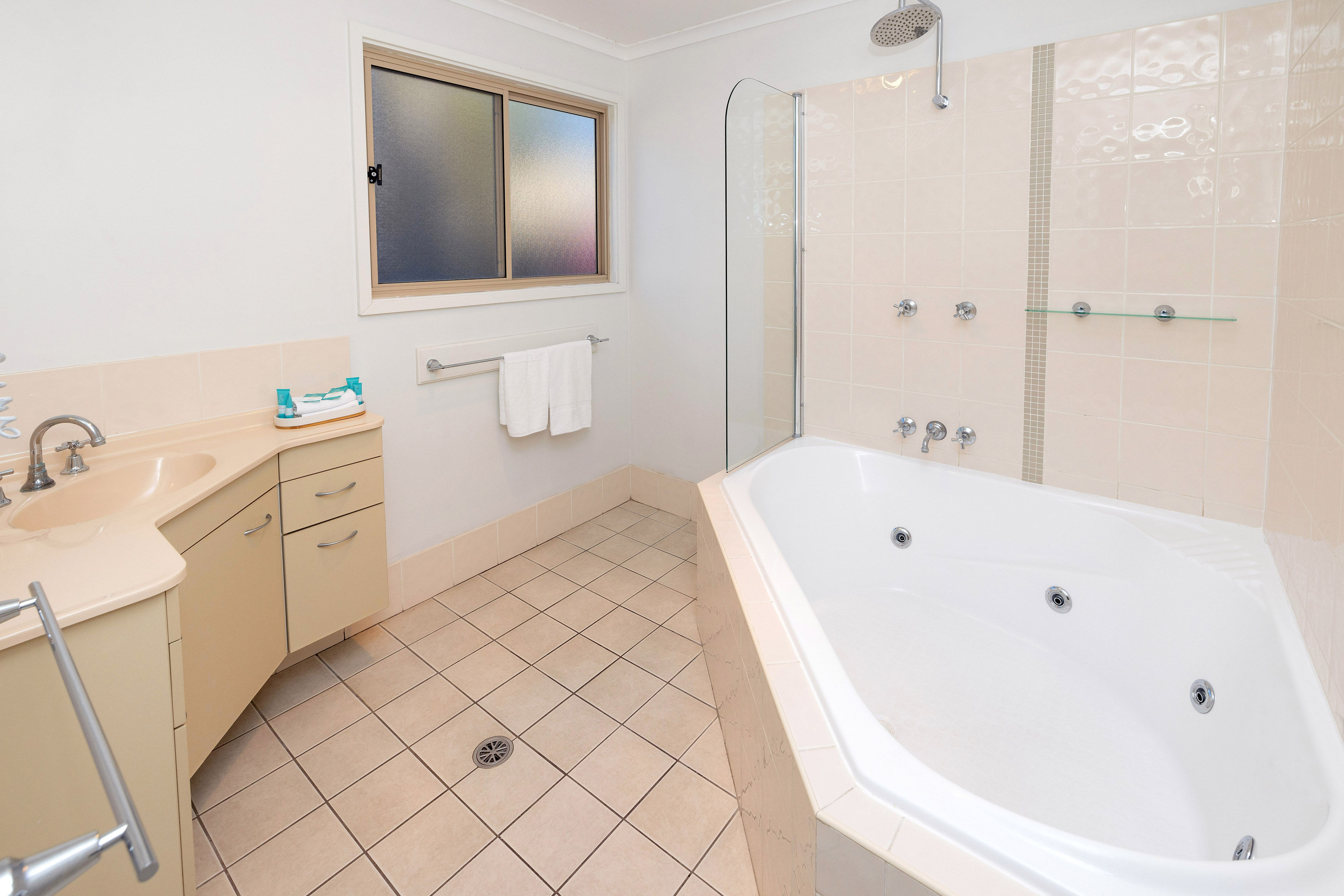 Sleeping four, it includes a queen bed and two single beds. The spa bathroom adds comfort, while the open-plan living space offers a relaxed layout. The full kitchen features a stovetop, dishwasher, and fridge, making it easy to self-cater and entertain. Step outside to a private deck with a BBQ, perfect for relaxing and taking in the serene poolside atmosphere.