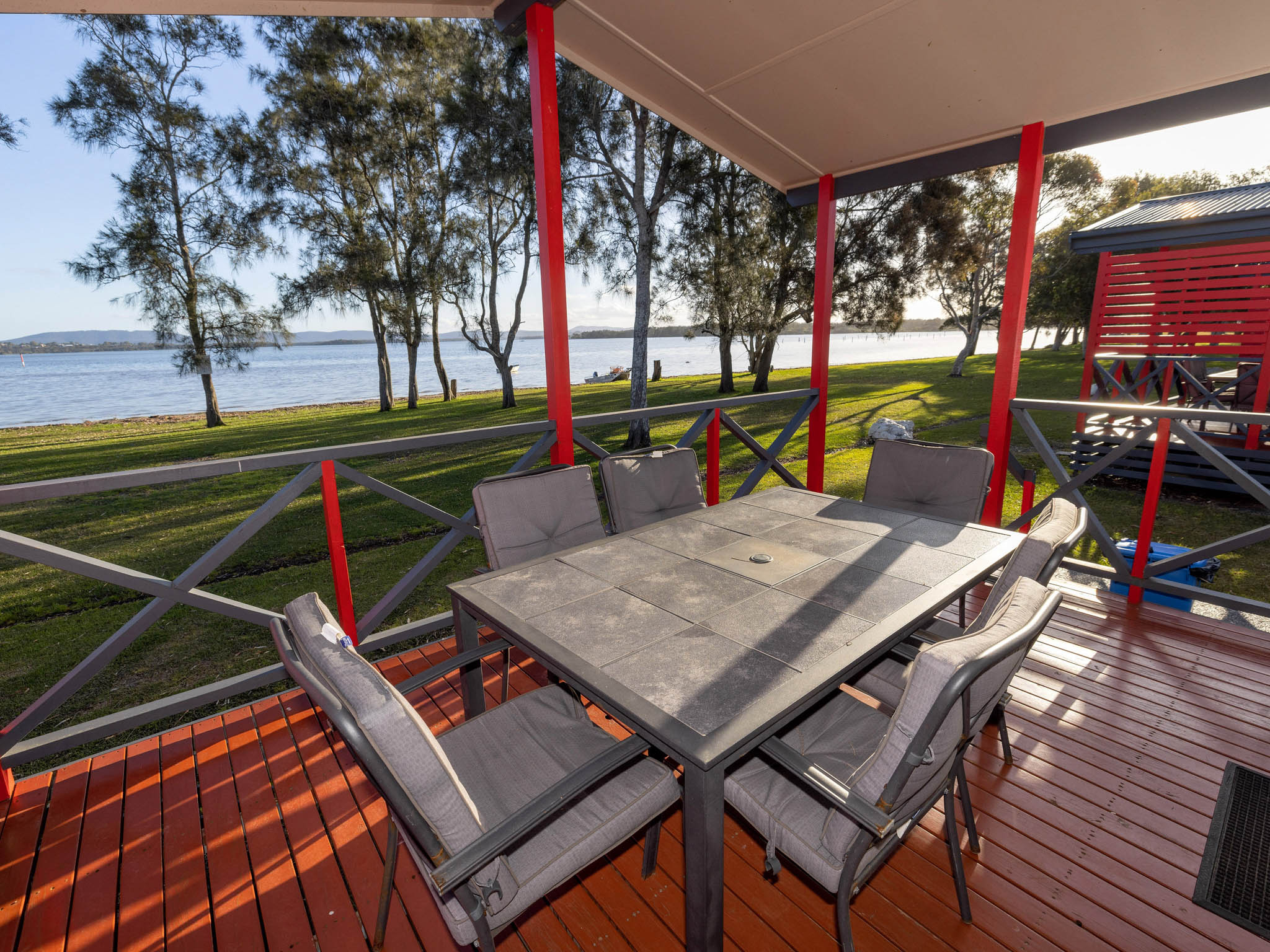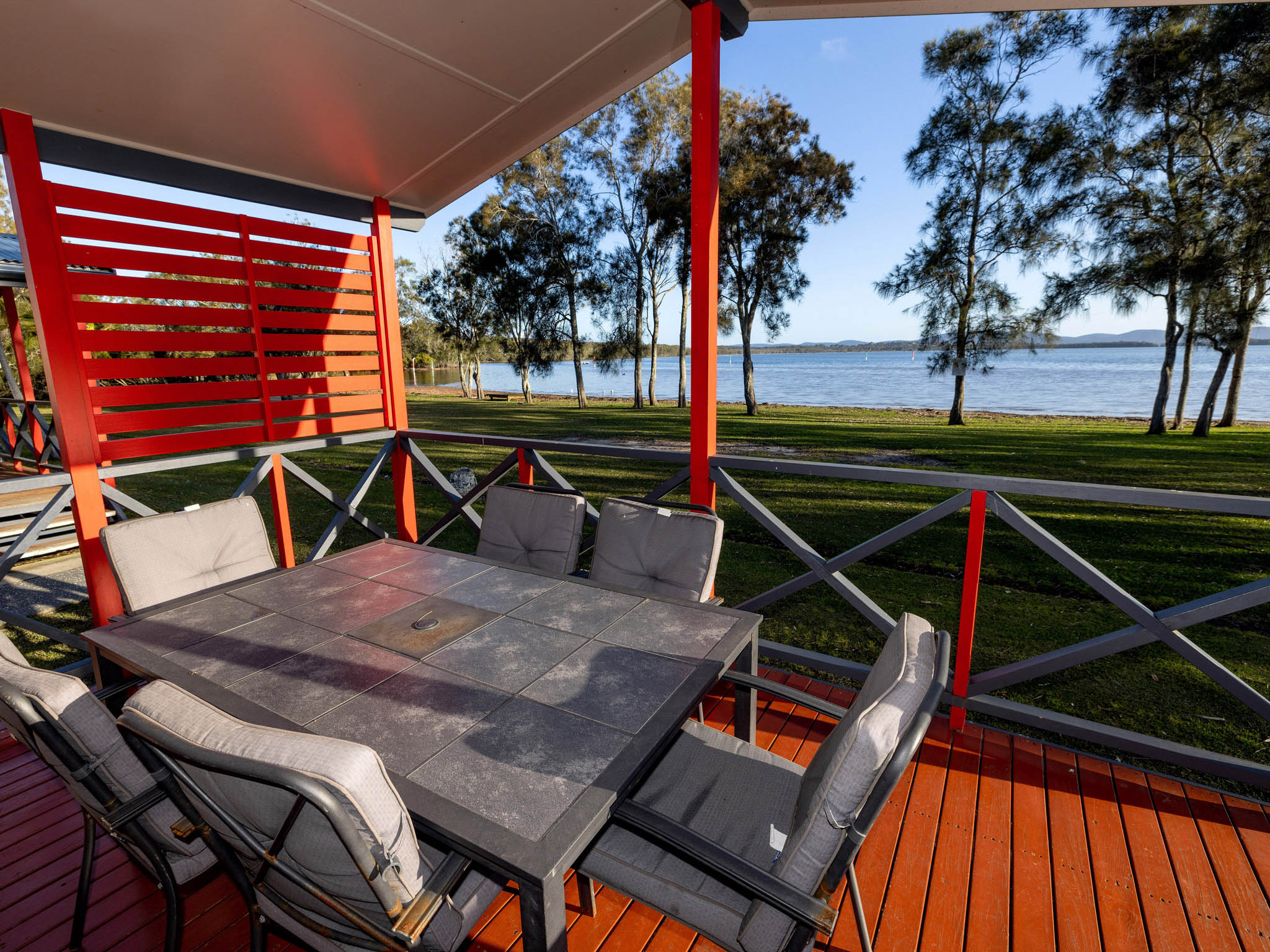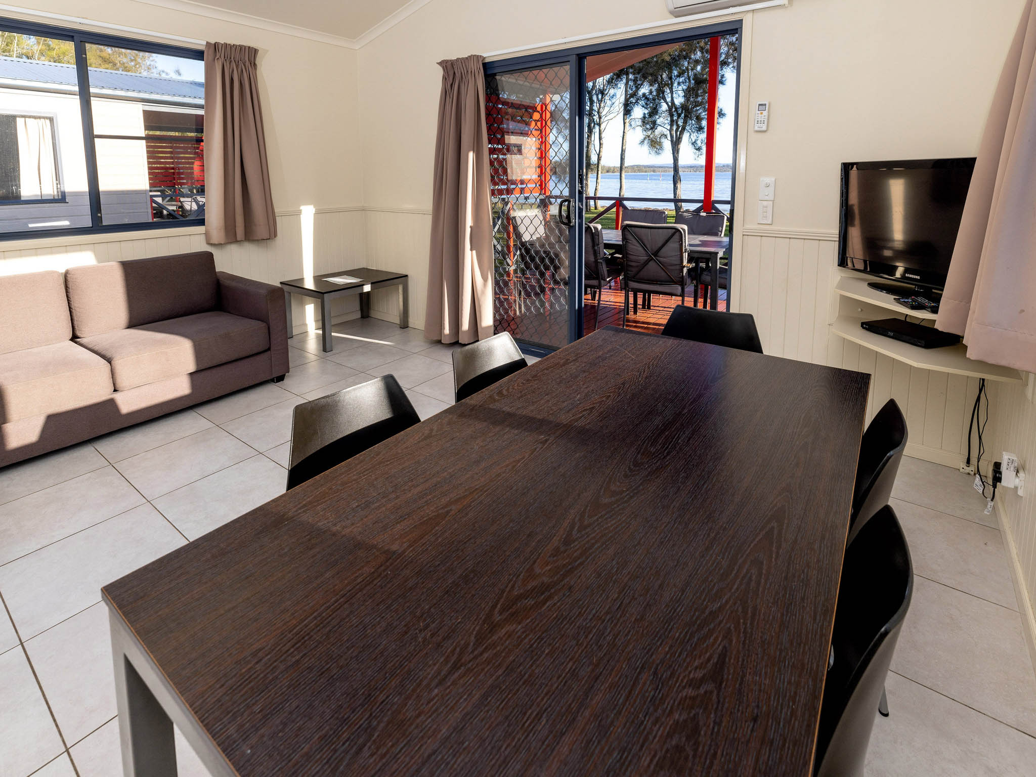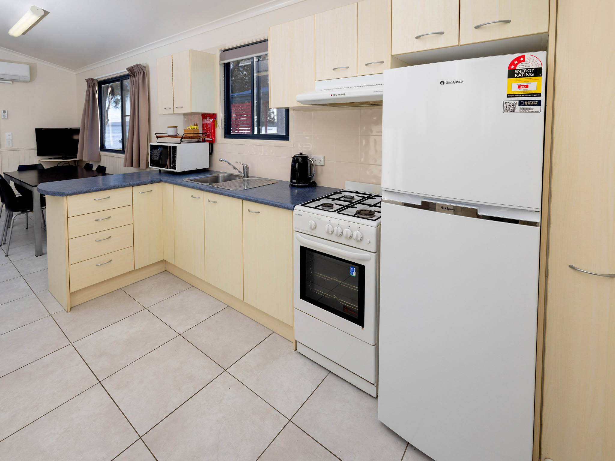 A great option for families, it features an open plan living and dining area, a full-size fridge, gas oven, microwave, and TV. Step onto your private deck with your own BBQ for outdoor meals or sunset views. Air conditioning and heating ensure comfort.