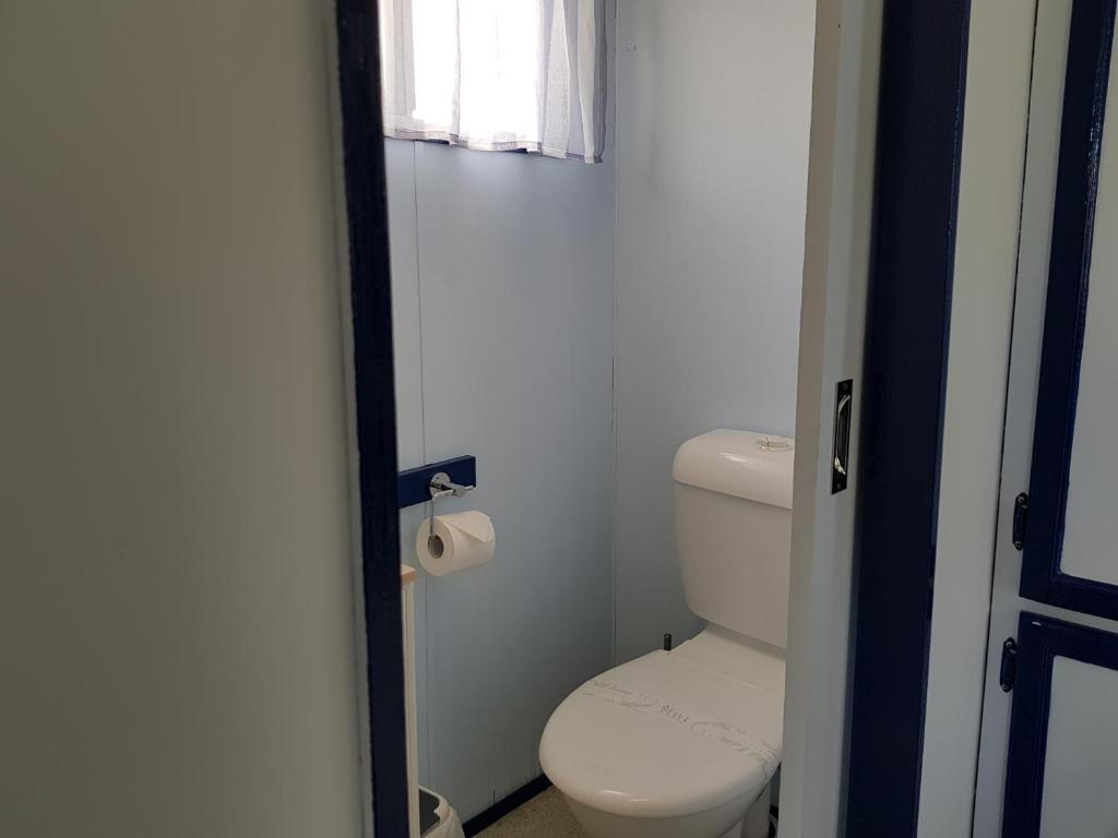 This studio sleeps up to four guests with a double bed and a set of single bunks. It includes a kitchenette with electric oven, cooktop, microwave, toaster, and bar fridge. The cabin is air-conditioned and features a dining area, TV, and private bathroom with toiletries and towels. A deck with outdoor seating adds a relaxed space to unwind.