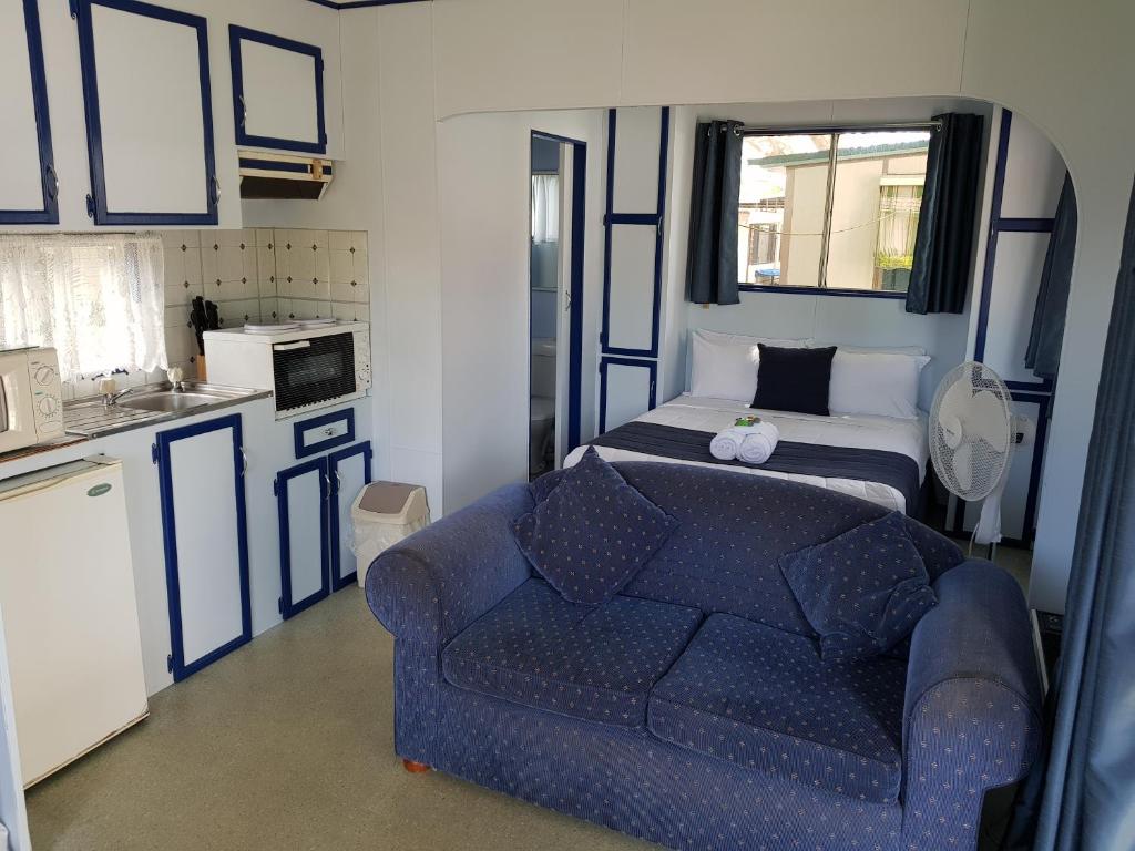 This pet-friendly studio cabin sleeps up to four guests, with a double bed and a set of single bunks. It includes a kitchenette with electric oven, cooktop, microwave, toaster, and bar fridge, along with a dining area, TV, and air-conditioning. A private bathroom is stocked with towels and toiletries, and the cabin also features a furnished outdoor deck. Pets are welcome—please contact the park for approval and fees.