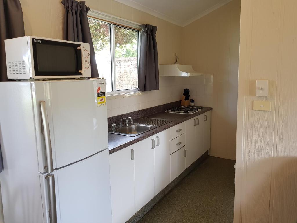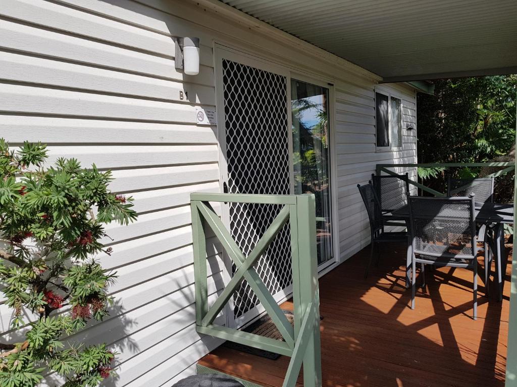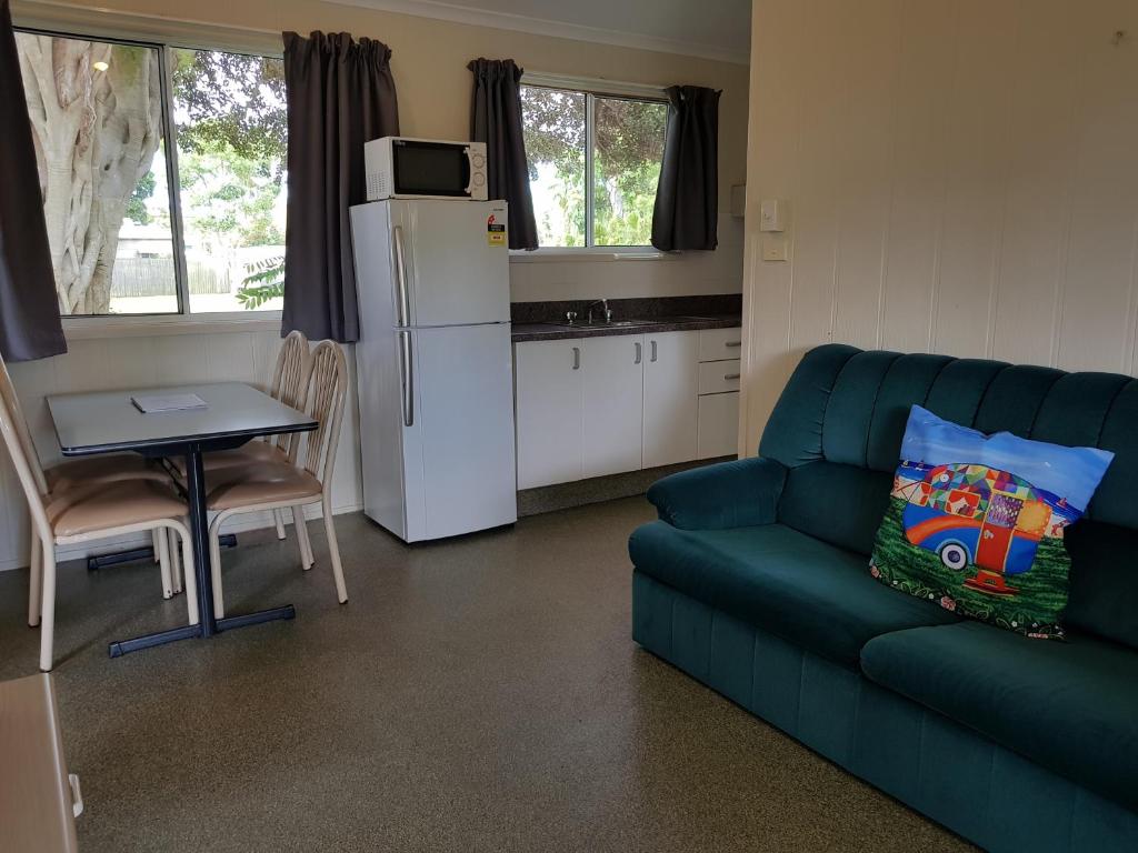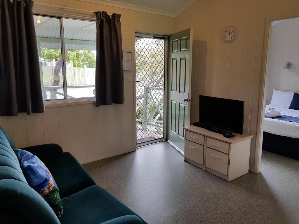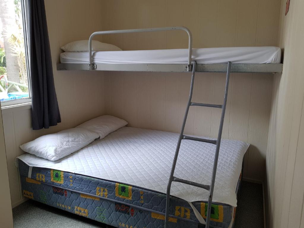 This two-bedroom cabin is perfect for families, sleeping up to five guests with a double bed in the main room and a tri-bunk in the second. The self-contained kitchen includes a gas cooktop, microwave, toaster, and full-size fridge. Enjoy air-conditioning, a dining area with TV, and a private bathroom with a corner spa bath. A spacious deck with outdoor seating completes the setup for a comfortable stay.