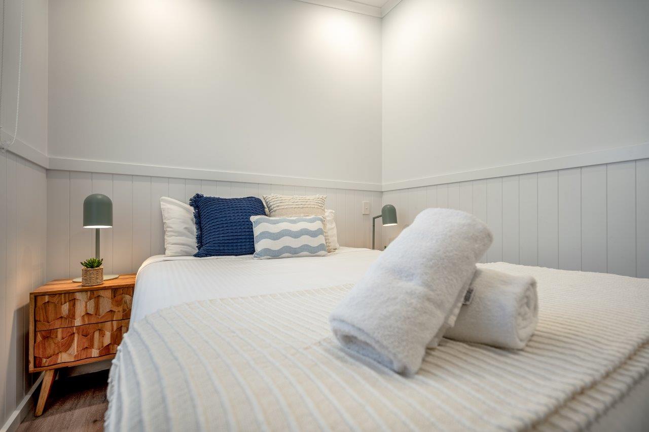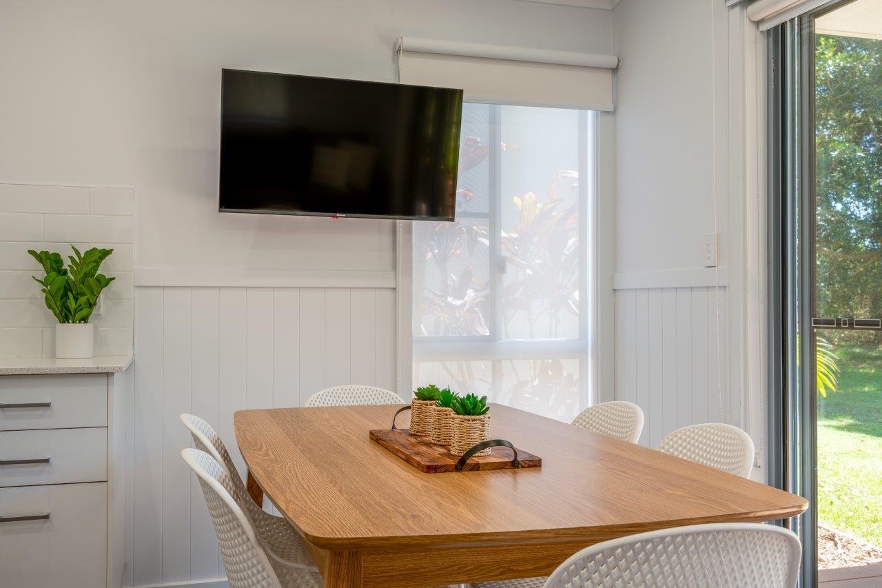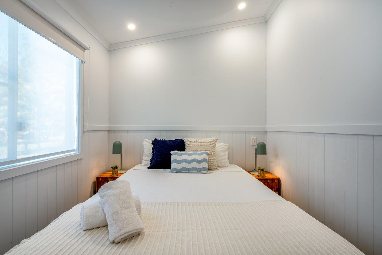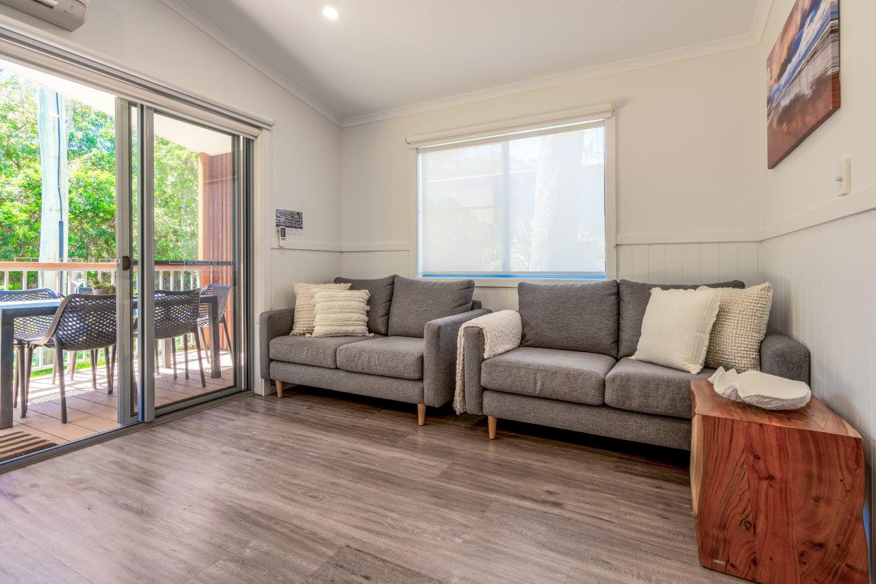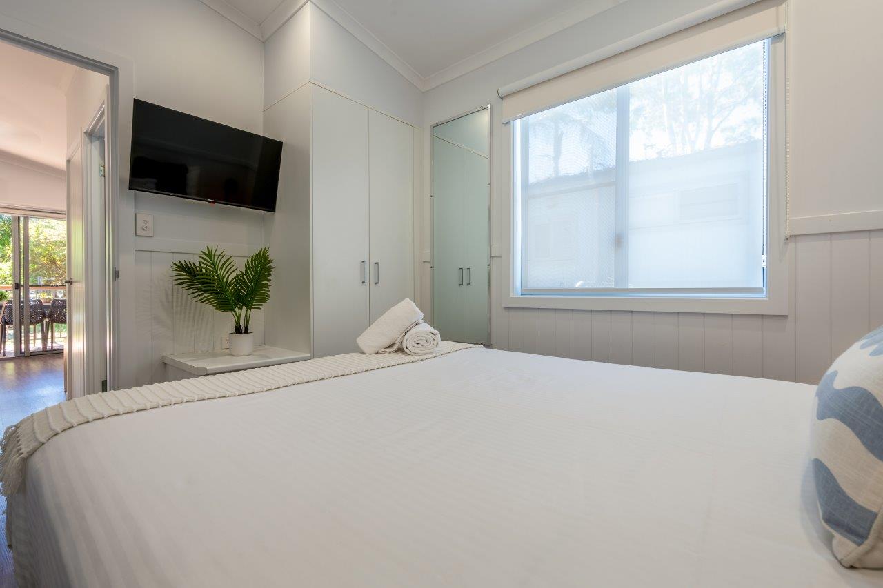 Our new two bedroom beach reserve villas offer a queen bed in the main bedroom and a tri-bunk in the second bedroom (all linen supplied), a bathroom and a separate toilet. They also feature 2 TVs, air conditioning, fans in all rooms and a large living area. The kitchen is equipped with an oven, cooktop, dishwasher and microwave. There also is a deck with outdoor seating and a fan.