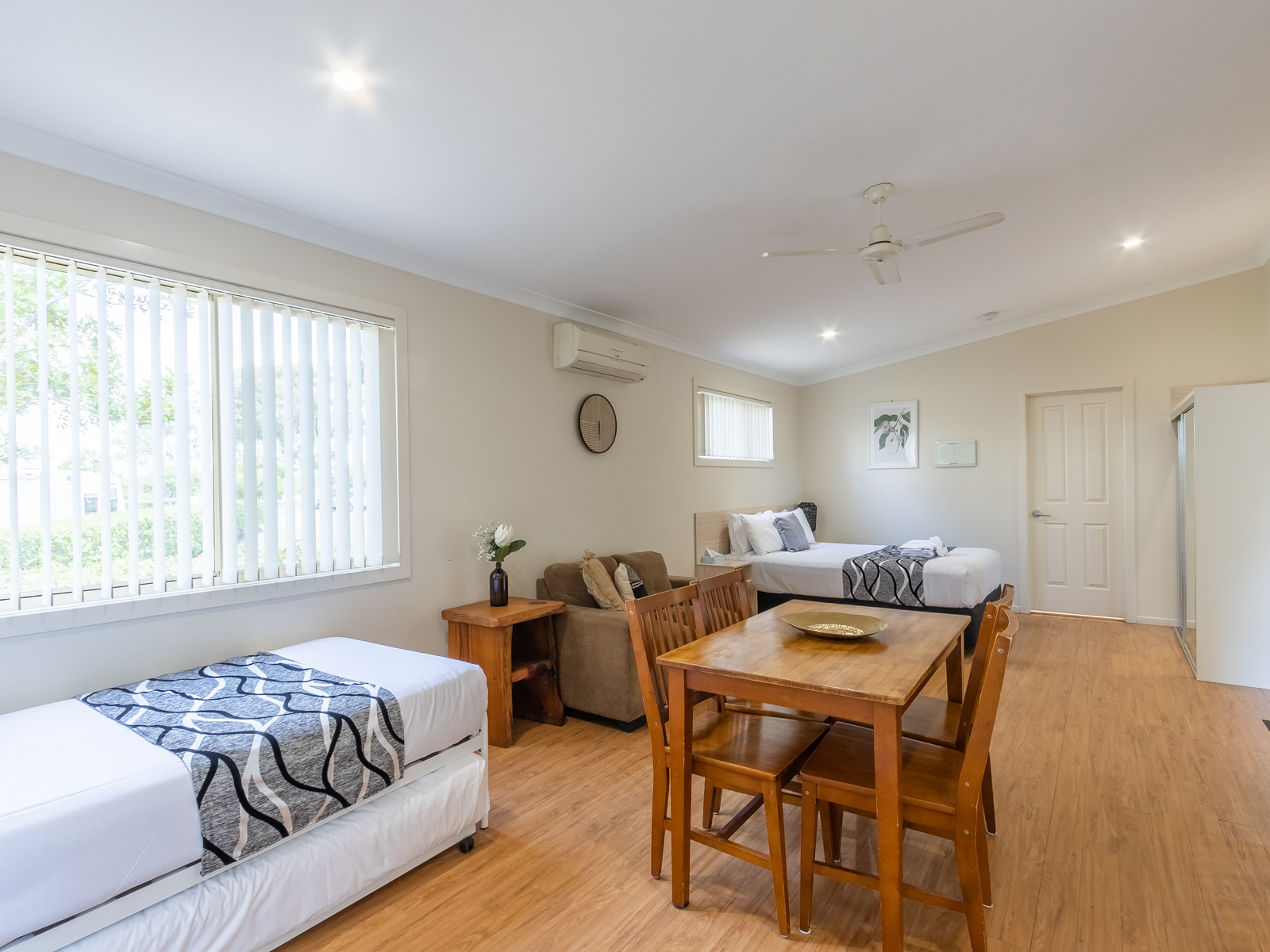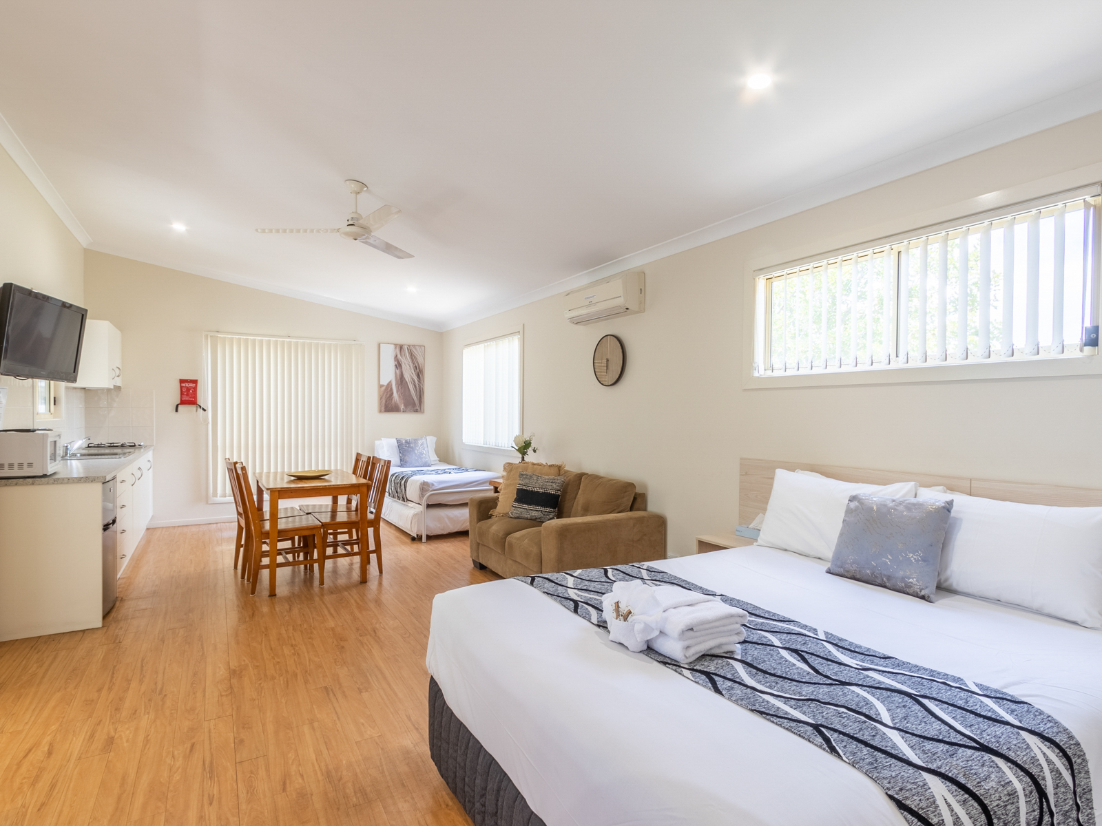 This economy studio is perfect for solo travellers or couples, featuring a queen bed and single bed, private bathroom, and open-plan living.