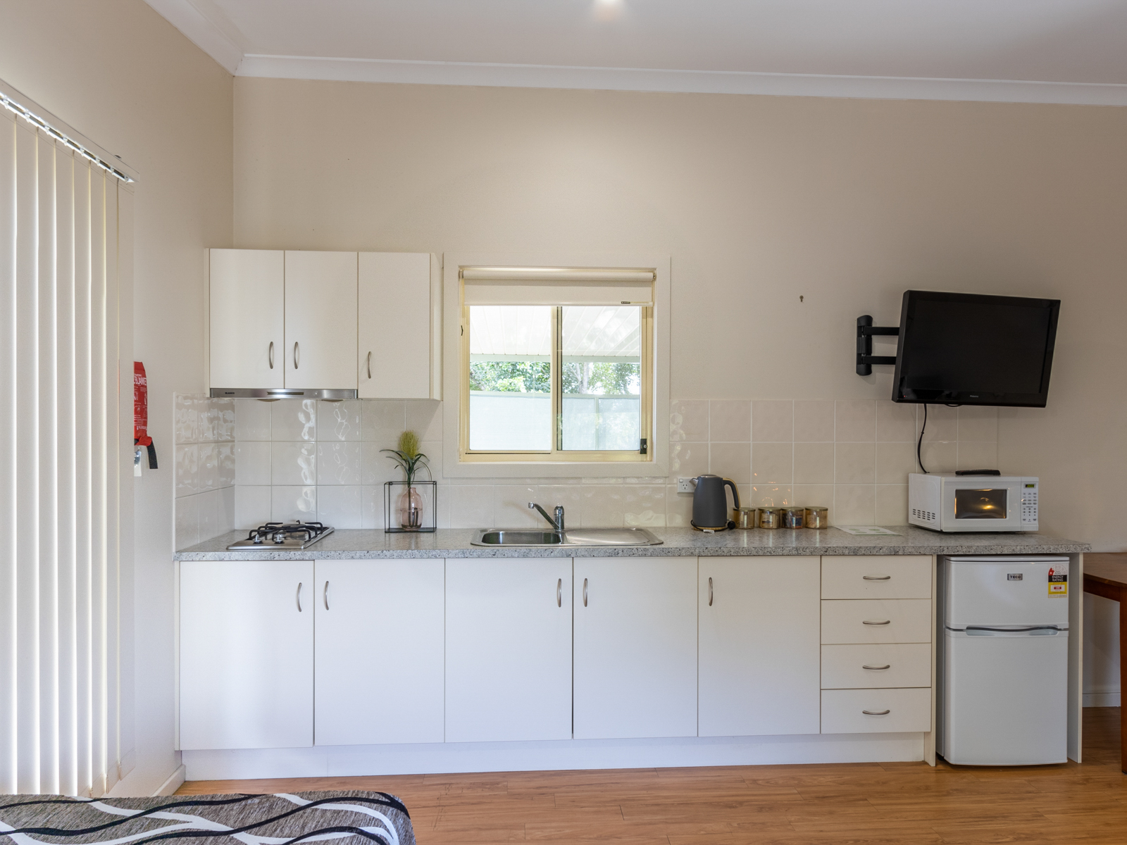 The kitchen includes an electric cooktop, microwave, and full-size fridge, while reverse cycle air conditioning and a TV add to your comfort.