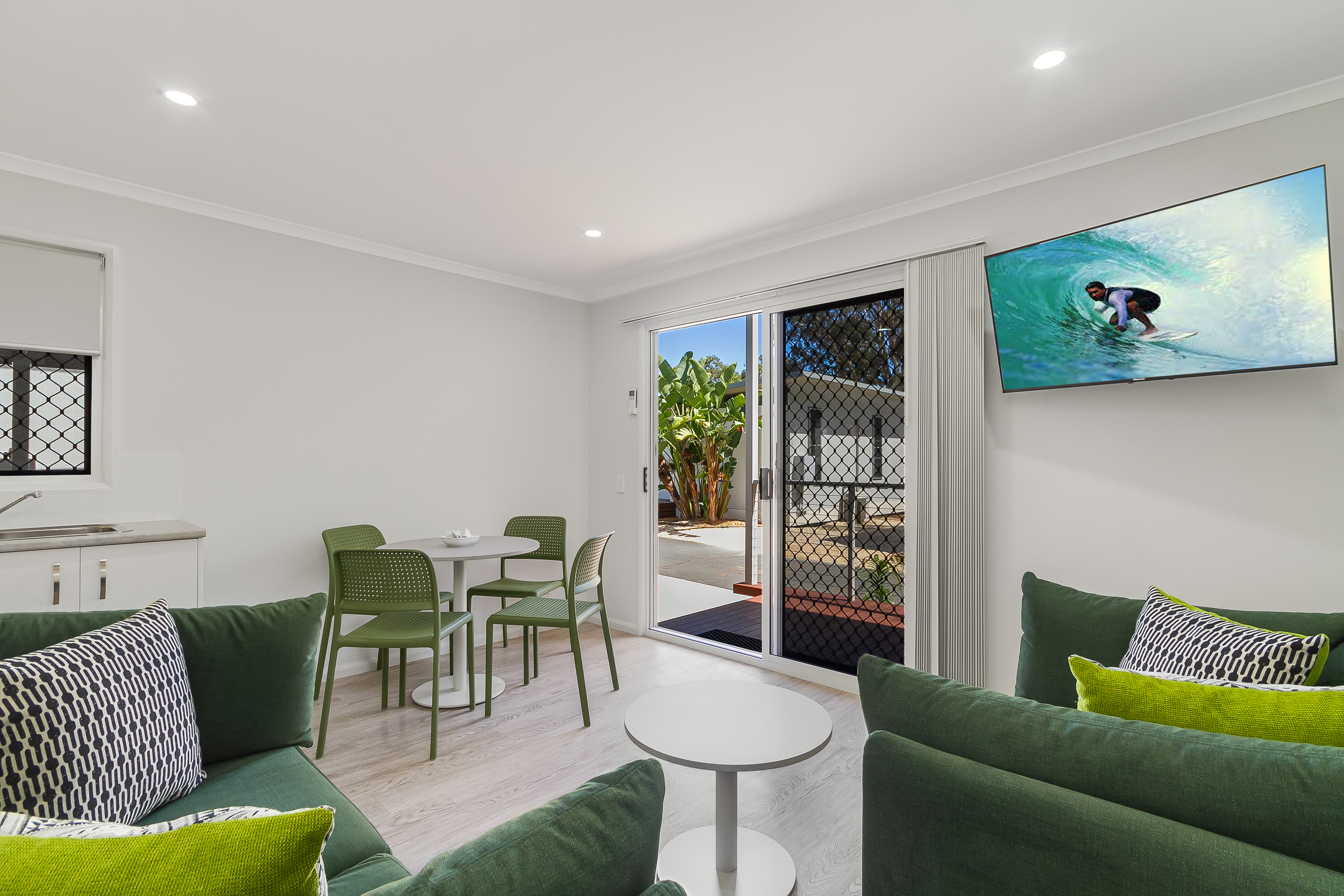 Our Superior Family Villas sleep up to four guests with a queen bed in the main bedroom and two single beds in the second bedroom, as well as a bathroom, living area, kitchen, internal laundry, and private deck.