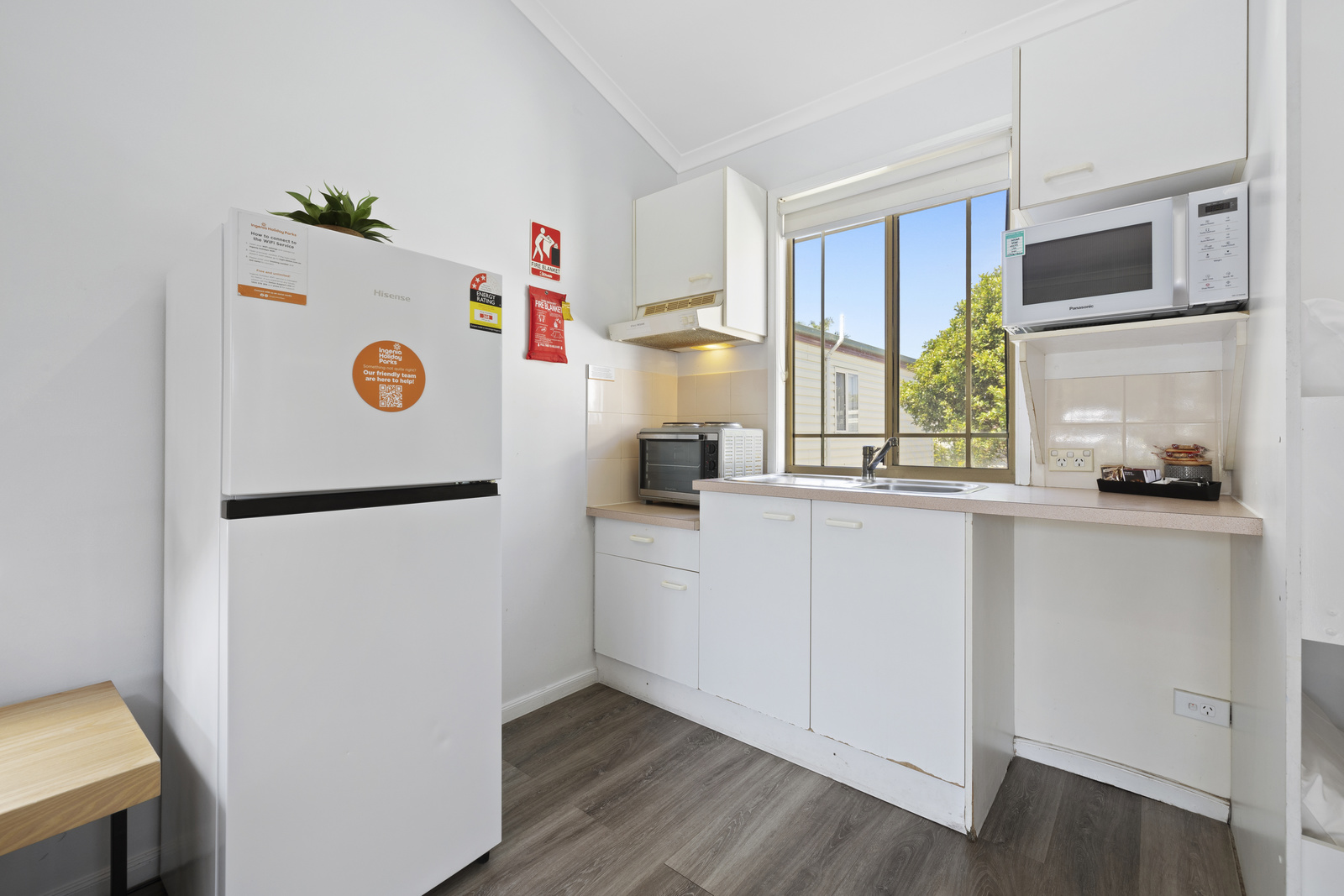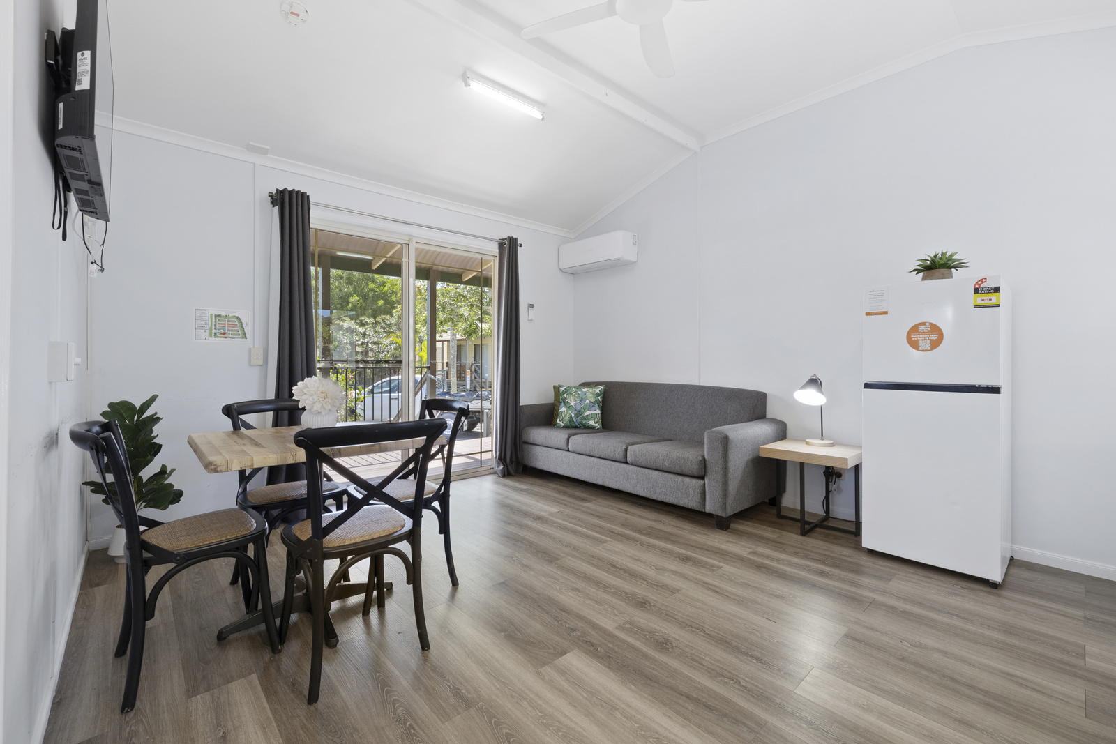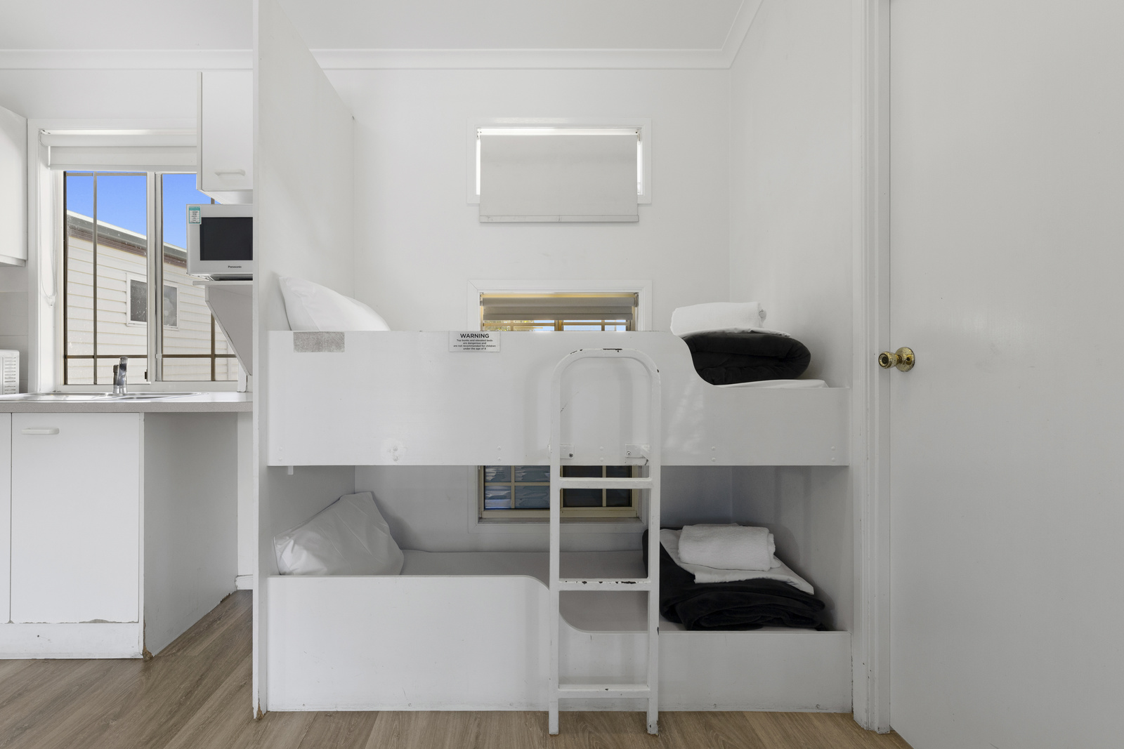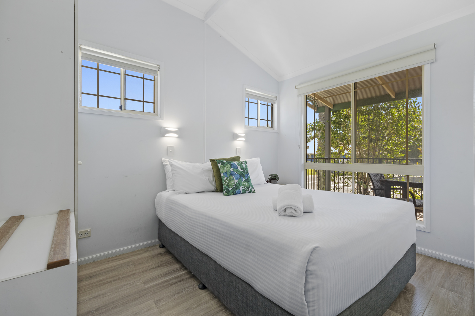 Experience a spacious and modern stay. These One Bedroom Standard Cabins sleep up to four guests, with a queen bed in the main bedroom and a bunk (suitable for children up to 12 years old) in the living area, we as well as a bathroom, kitchenette, living area, and private deck.