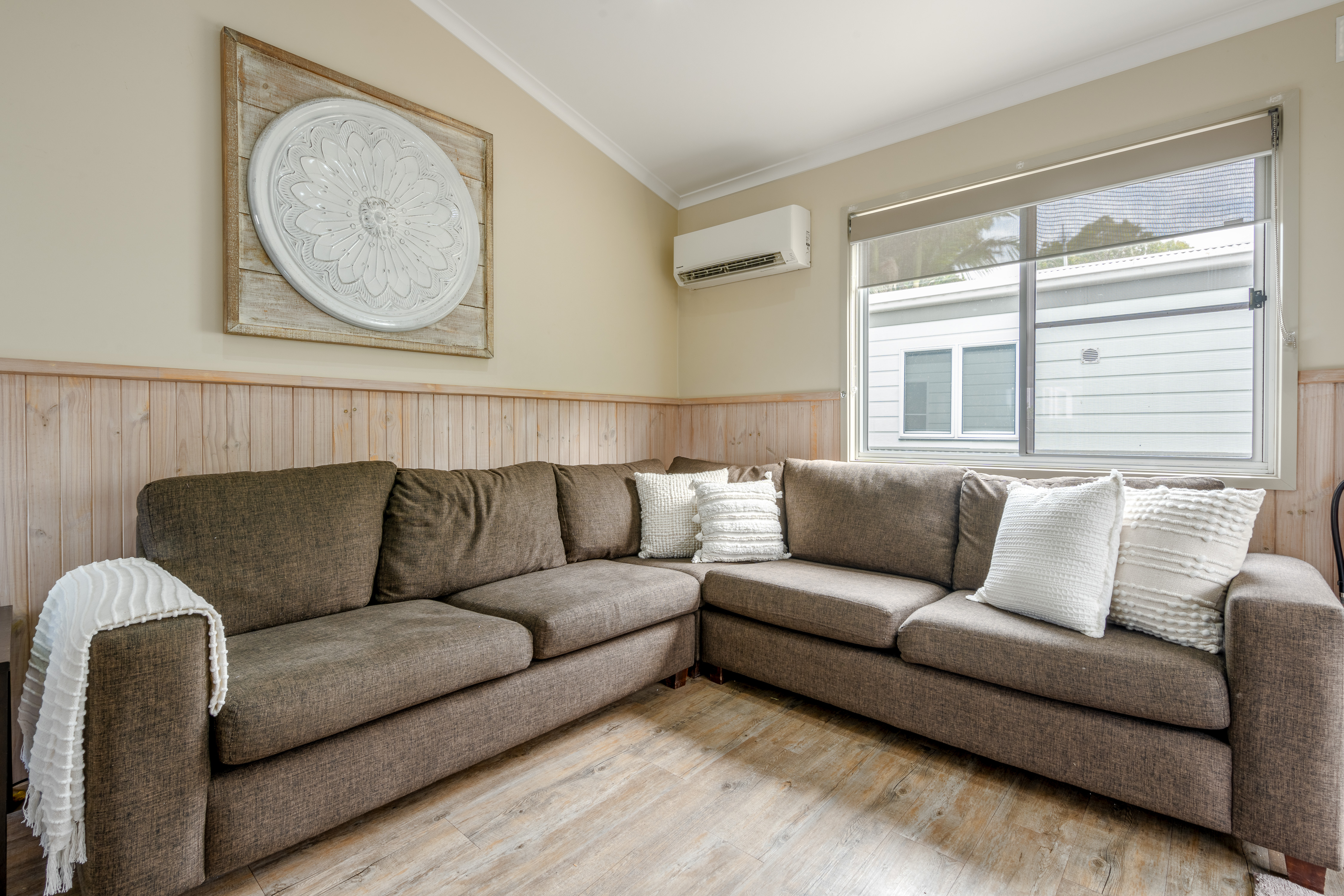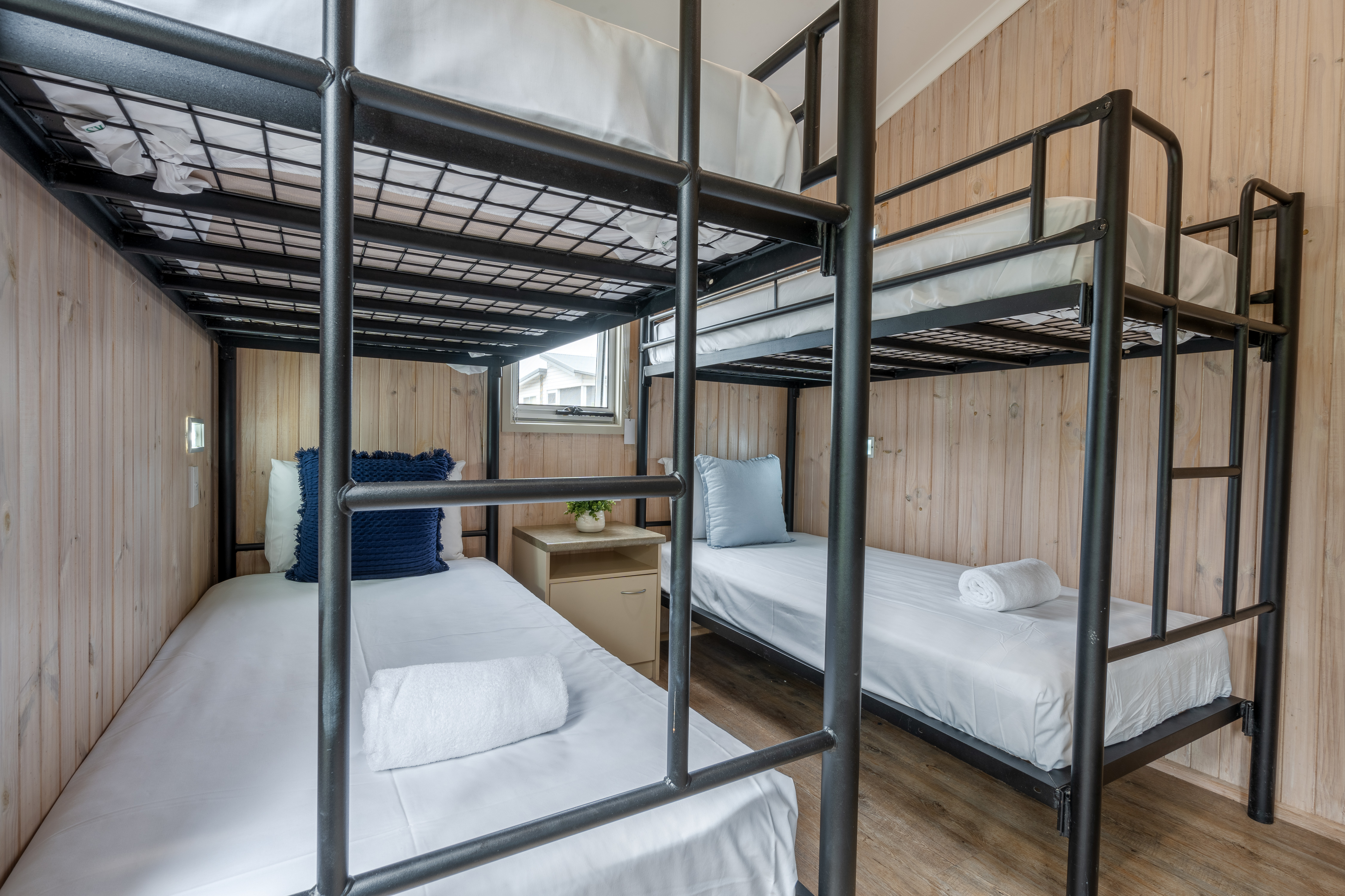 Spacious 2 bedroom cabins. Queen bed in one room and 2 sets of bunks in the other, all linen, pillows & blankets/doonas supplied. Fully equipped kitchen, two door fridge & gas stove. Smart TV. Deck with outdoor furniture. A/C & ceiling fans (varied plans). Sleeps 6 with a maximum of 4 adults.