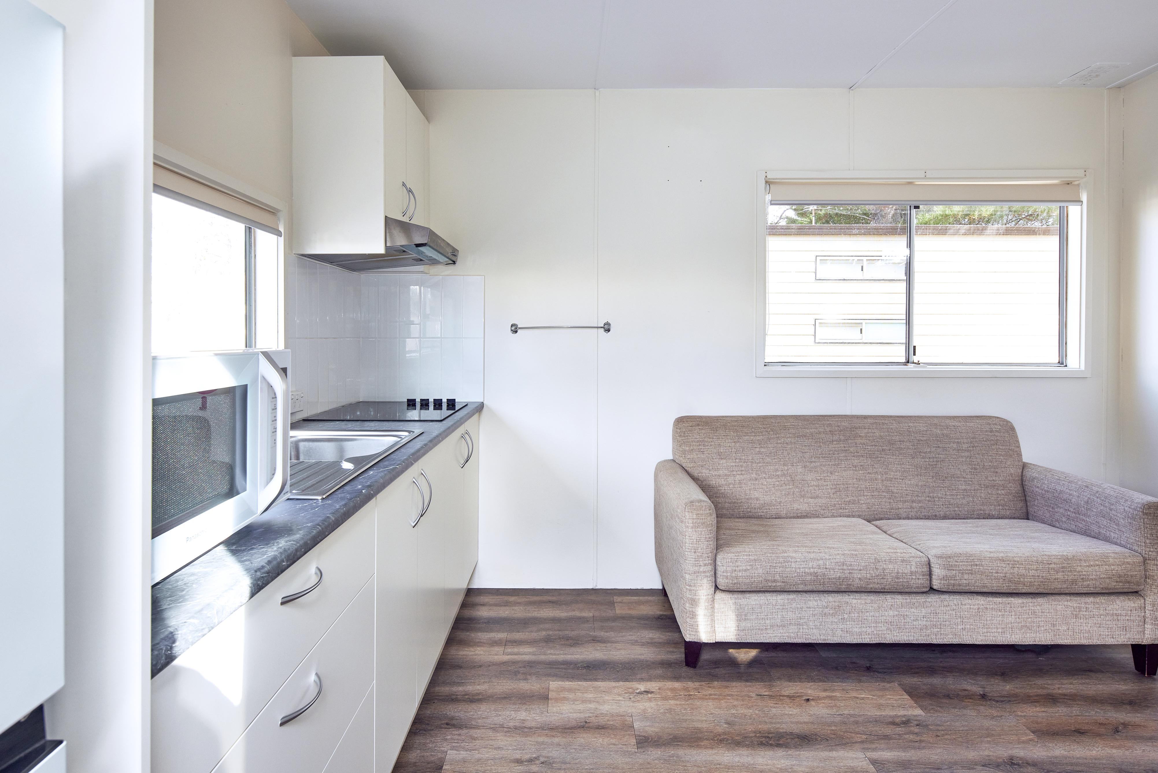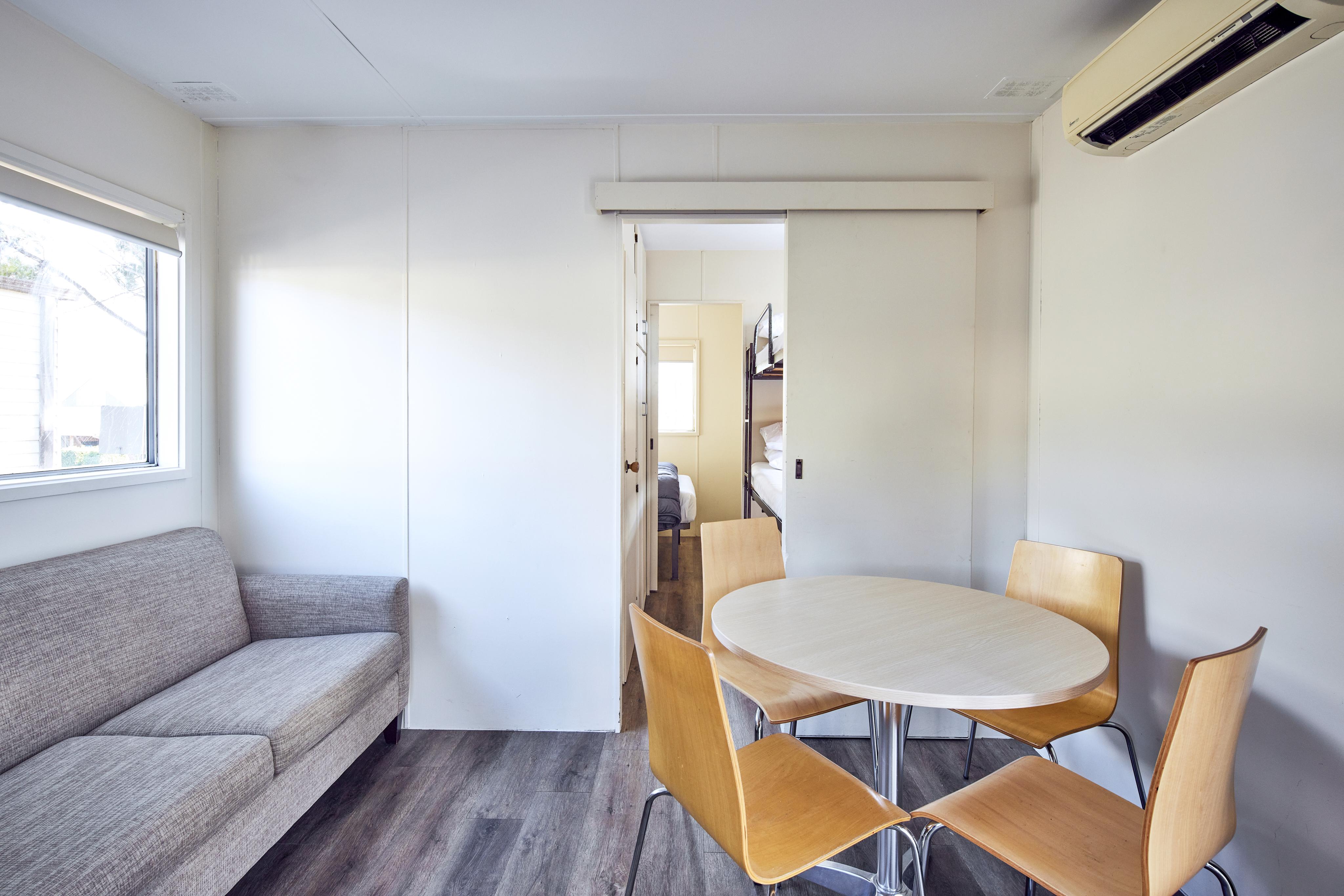 Refurbished cabin with modern kitchen and furnishings. One double and one small single bunk suitable for children only. Features air-conditioning; kitchenette including bar fridge, stovetop and microwave; bathroom; dining and lounge area with TV.