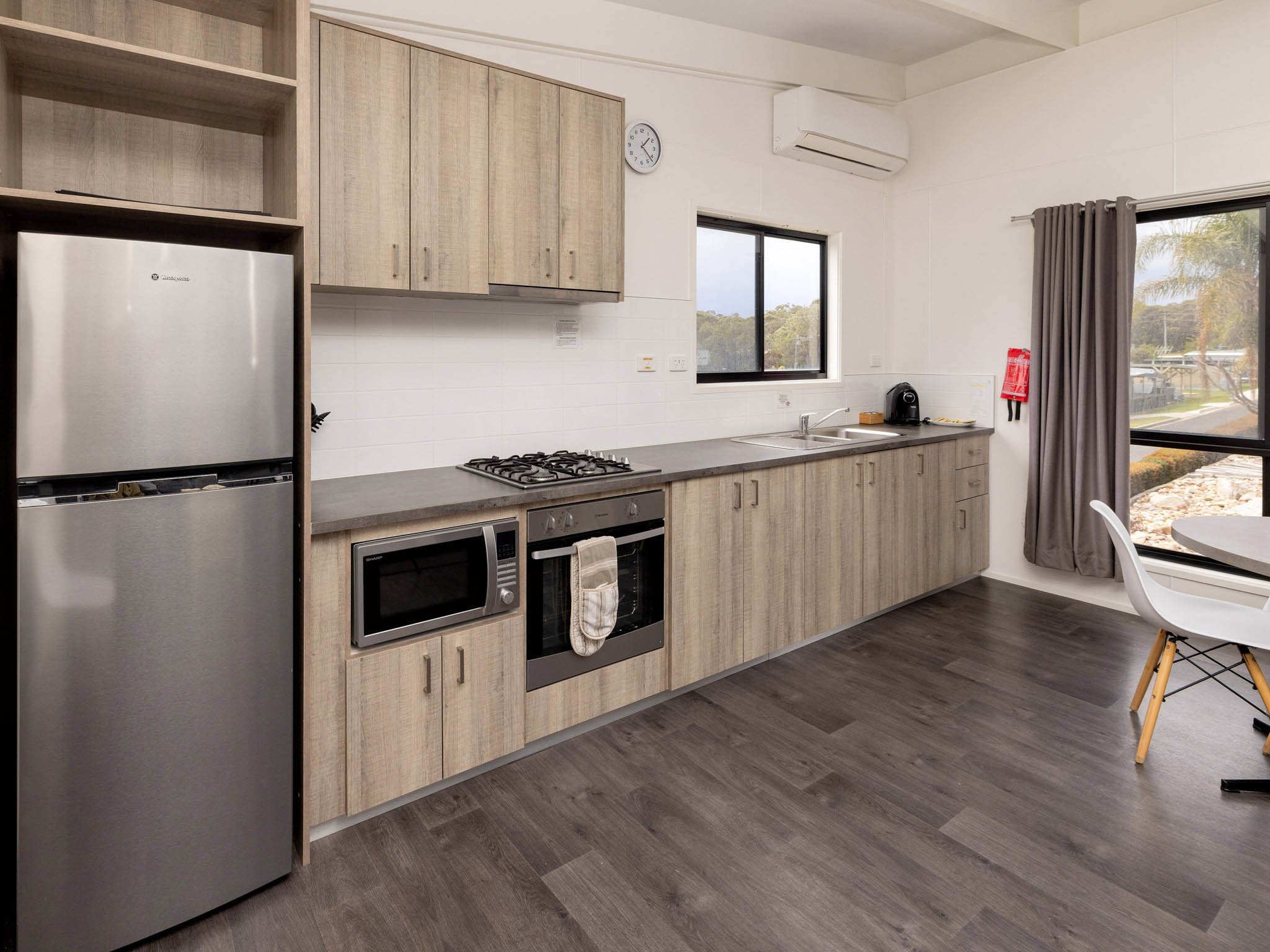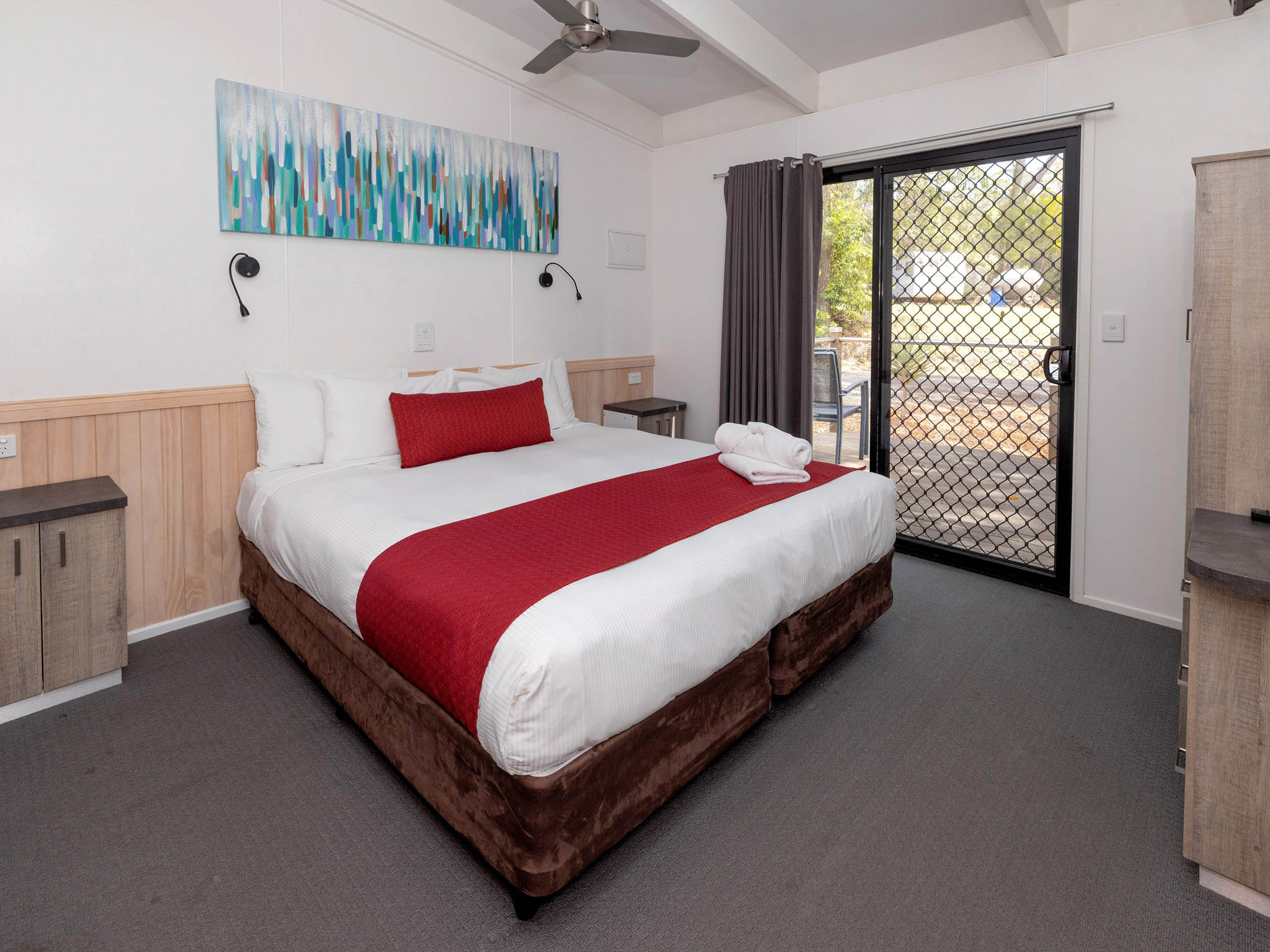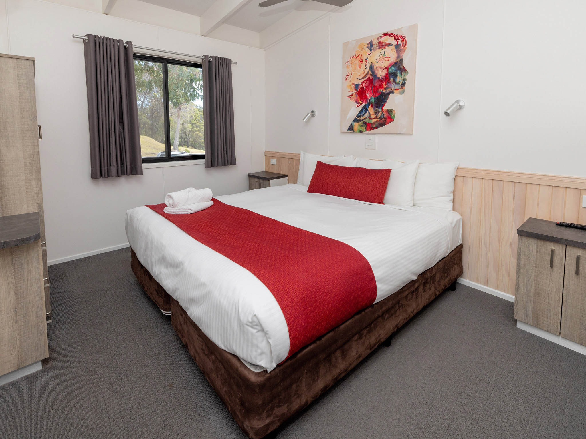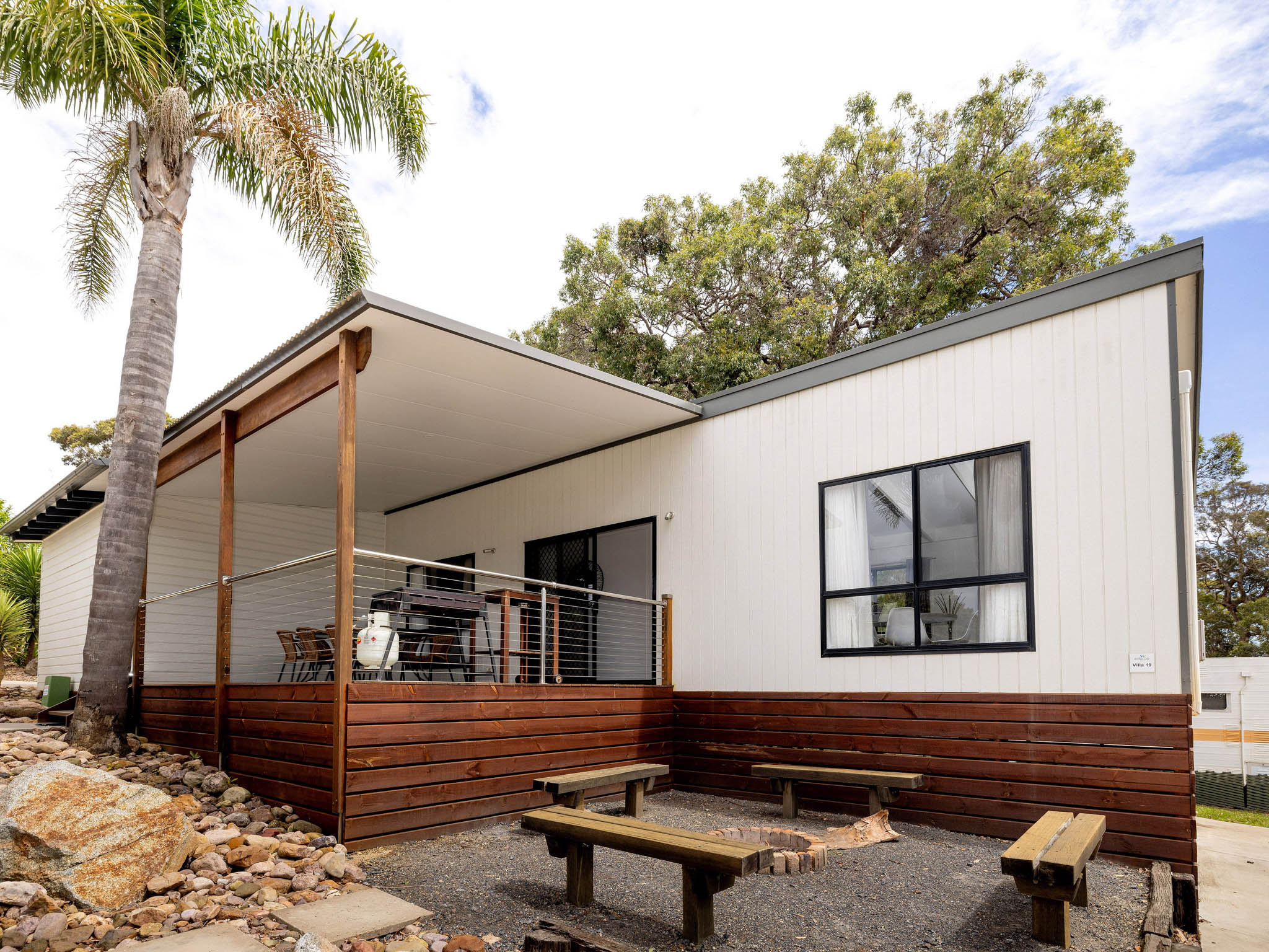 This spacious villa is ideal for larger groups, sleeping up to eight guests across three bedrooms with two king beds and four singles. Enjoy self-contained comfort with a full kitchen, two bathrooms and air conditioning. Relax in the open-plan living area or on the private verandah with BBQ and fire pit. Just a short walk to the brewery, mini golf and pool, it’s the perfect family retreat.
