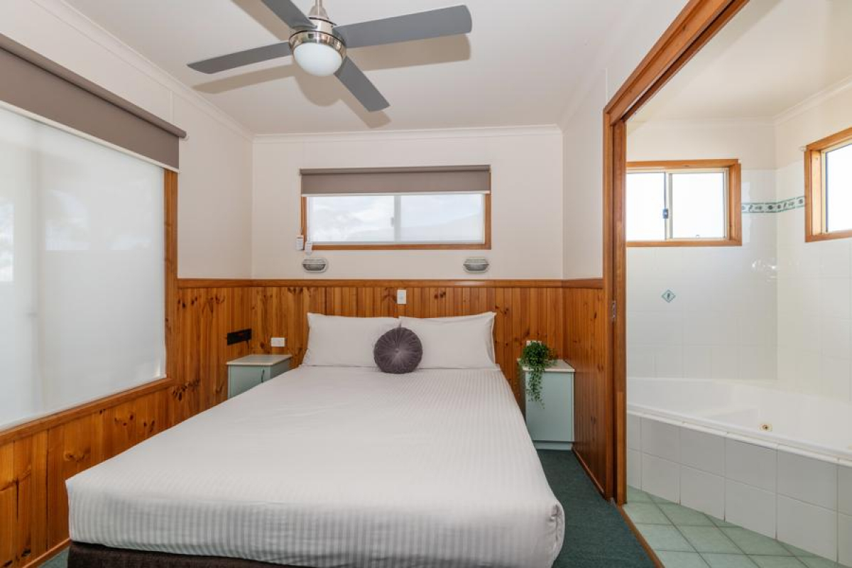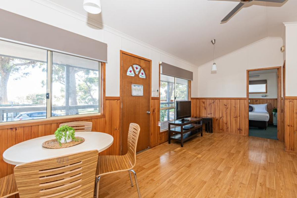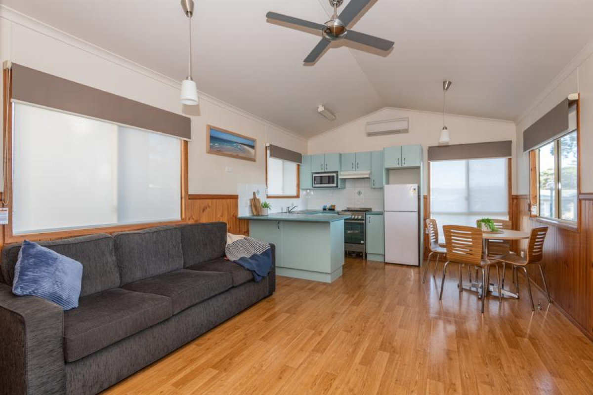 It has a BBQ on the deck to sit and relax. The cabin has a full kitchen with a spacious living space. In the bathroom you will find a standalone shower and spa bath. The main bedroom has a queen bed with a TV in the room. The cabin also includes reverse cycle air-conditioning, and all linen is provided.