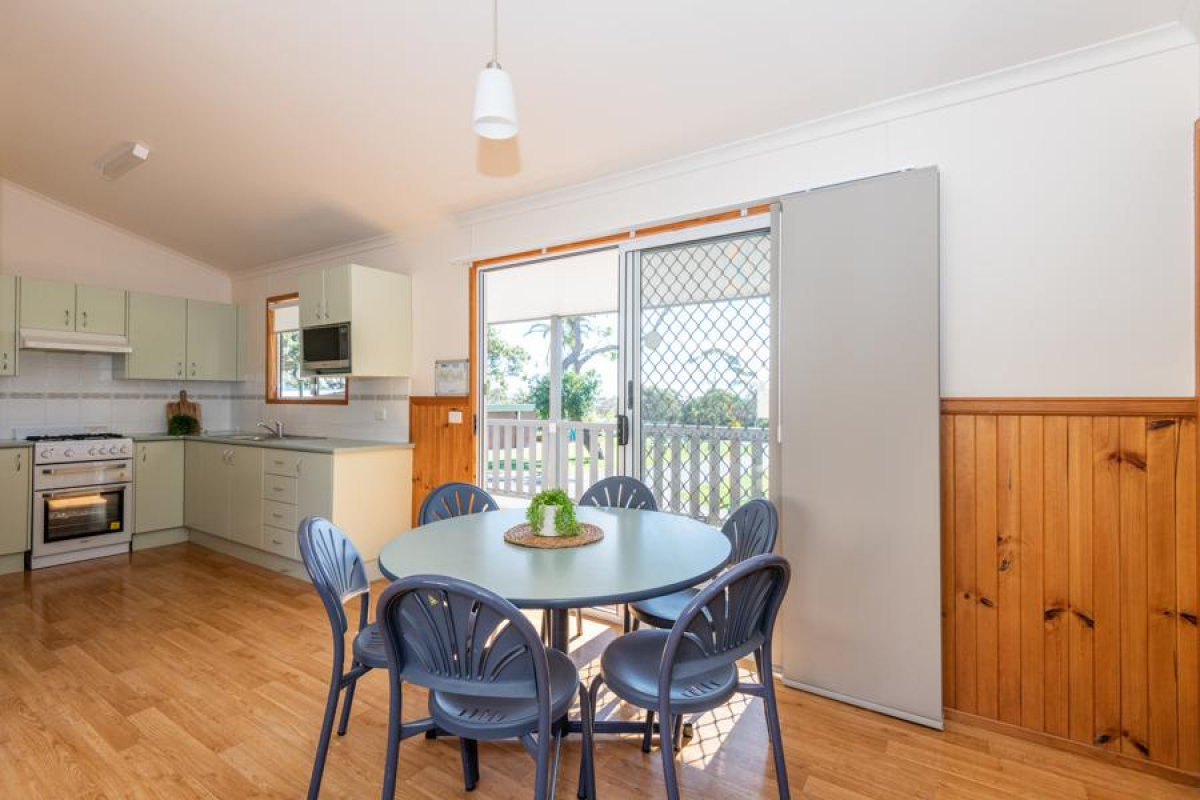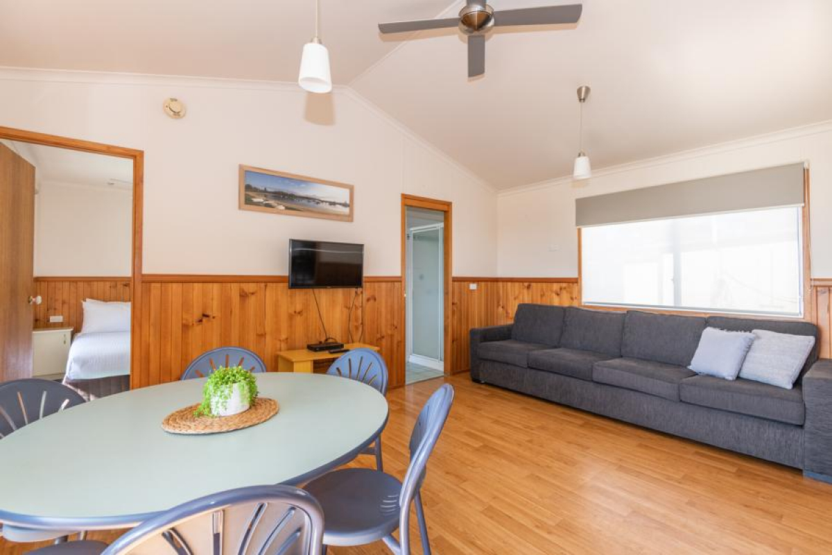 The cabin is a large family cabin with two bedrooms. The main room has a queen bed with a TV and with ensuite access to the bathroom. The bathroom has a separate shower, toilet and lovely corner spa bath. The second room has two sets of bunk beds. It also has a full kitchen and includes reverse cycle air-conditioning, and all linen is provided.